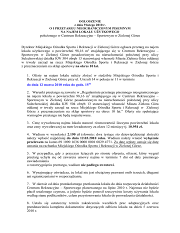 OGŁOSZENIE z dnia 9 lutego 2010 r. O I PRZETARGU NIEOGRANICZONYM PISEMNYM NA NAJEM LOKALU UŻYTKOWEGO położonego w Centrum Rekreacyjno – Sportowym w Zielonej Górze Dyrektor Miejskiego Ośrodka Sportu i Rekreacji w Zielonej Górze ogłasza przetarg na najem lokalu użytkowego o powierzchni 98,16 m2 znajdującego się w Centrum Rekreacyjno – Sportowym w Zielonej Górze posadowionym na nieruchomości położonej przy ulicy Sulechowskiej działka KW 504 obręb 13 stanowiącej własność Miasta Zielona Góra oddanej w trwały zarząd na rzecz Miejskiego Ośrodka Sportu i Rekreacji w Zielonej Górze z przeznaczeniem na sklep sportowy na okres 10 lat. 1. Oferty na najem lokalu należy złożyć w siedzibie Miejskiego Ośrodka Sportu i Rekreacji w Zielonej Górze przy ul. Urszuli 14 w pokoju nr 11 w terminie do dnia 12 marca 2010 roku do godz. 1530 2. Warunki przetargu są zawarte w „Regulaminie przetargu pisemnego nieograniczonego na najem lokalu o powierzchni 98,16 m2 znajdującego się w Centrum Rekreacyjno – Sportowym w Zielonej Górze posadowionym na nieruchomości położonej przy ulicy Sulechowskiej działka KW 504 obręb 13 stanowiącej własność Miasta Zielona Góra oddanej w trwały zarząd na rzecz Miejskiego Ośrodka Sportu i Rekreacji w Zielonej Górze z przeznaczeniem na sklep sportowy na okres 10 lat.” Oferty nie spełniające wymogów przetargu nie będą rozpatrywane. 3. Cenę wywoławczą najmu lokalu stanowi równowartość iloczynu powierzchni lokalu oraz ceny wywoławczej za metr kwadratowy za okres 12 miesięcy tj. 10.954 zł. 4. Wadium w wysokości 2.190 zł (słownie: dwa tysiące sto dziewięćdziesiąt złotych) należy wpłacić najpóźniej do dnia 12.03.2010 roku. Wadium należy wnieść wyłącznie przelewem na konto 69 1090 1636 0000 0001 0829 4771. Za datę wpłaty uznaje się datę uznania na rachunku Miejskiego Ośrodka Sportu i Rekreacji w Zielonej Górze. 5. W przypadku, gdy z przyczyn leżących po stronie oferenta, oferent, który wygrał przetarg uchyla się od zawarcia umowy najmu w terminie 7 dni od daty pisemnego zawiadomienia o rozstrzygnięciu przetargu, wadium nie podlega zwrotowi. 6. Wynajmujący oświadcza, że lokal nie jest obciążony prawami osób trzecich, długami ani ograniczeniami w rozporządzaniu. 7. W okresie od dnia protokolarnego przekazania lokalu do dnia rozpoczęcia działalności Centrum Rekreacyjno – Sportowego planowanego na lipiec 2010 r. Najemca nie będzie płacił ustalonego czynszu, a jedynie będzie ponosił rzeczywiste koszty używania lokalu według stanu podliczników, celem przystosowania lokalu do prowadzenia działalności. 8. Ustala się ostateczny termin zakończenia wszelkich prac adaptacyjnych oraz przedstawienia kompletu dokumentów dotyczących odbioru lokalu na dzień 5 czerwca 2010 r. 9. Wynajem lokalu użytkowego na działalność gospodarczą będącą przedmiotem przetargu, jest uwarunkowane uzyskaniem przez Najemcę własnym staraniem i na własne ryzyko koniecznych zgód i zezwoleń do prowadzenia wskazanej działalności. 10. Dyrektor Miejskiego Ośrodka Sportu i Rekreacji w Zielonej Górze zastrzega sobie prawo wycofania lokalu wystawionego do przetargu oraz unieważnienia przetargu bez podania przyczyn. 11. Zainteresowani Oferenci mogą wziąć udział w części jawnej przetargu, która odbędzie się w dniu 15 marca 2010 roku o godz. 1300 w siedzibie Miejskiego Ośrodka Sportu i Rekreacji w Zielonej Górze przy ul. Urszuli 14 w Zielonej Górze, w pokoju nr 12. W trakcie części jawnej przetargu możliwe będzie składanie oświadczeń oraz wyjaśnień. Pakiety informacyjne o przetargu można nabyć a cenę 100 zł w Miejskim Ośrodku Sportu i Rekreacji w Zielonej Górze ul. Urszuli 14 pok. Nr 11 lub pobrać ze strony internetowej www.mosir.zielona-gora.pl Dodatkowe informacje w sprawach procedury przetargowej i w sprawach technicznych można uzyskać w Miejskim Ośrodku Sportu i Rekreacji w Zielonej Górze ul. Urszuli 14 w pok. 11 tel. nr 068 320-29-94.