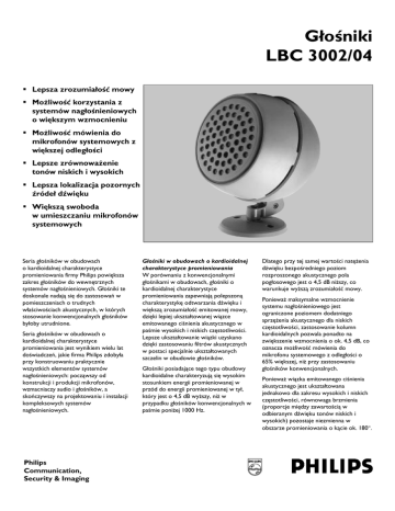 Głośniki LBC 3002/04 ! Lepsza zrozumiałość mowy ! Możliwość korzystania z systemów nagłośnieniowych o większym wzmocnieniu ! Możliwość mówienia do mikrofonów systemowych z większej odległości ! Lepsze zrównoważenie tonów niskich i wysokich ! Lepsza lokalizacja pozornych źródeł dźwięku ! Większą swoboda w umieszczaniu mikrofonów systemowych Seria głośników w obudowach o kardioidalnej charakterystyce promieniowania firmy Philips powiększa zakres głośników do wewnętrznych systemów nagłośnieniowych. Głośniki te doskonale nadają się do zastosowań w pomieszczeniach o trudnych właściwościach akustycznych, w których stosowanie konwencjonalnych głośników byłoby utrudnione. Seria głośników w obudowach o kardioidalnej charakterystyce promieniowania jest wynikiem wielu lat doświadczeń, jakie firma Philips zdobyła przy konstruowaniu praktycznie wszystkich elementów systemów nagłośnieniowych: począwszy od konstrukcji i produkcji mikrofonów, wzmacniaczy audio i głośników, a skończywszy na projektowaniu i instalacji kompleksowych systemów nagłośnieniowych. Philips Communication, Security & Imaging Głośniki w obudowach o kardioidalnej charakterystyce promieniowania W porównaniu z konwencjonalnymi głośnikami w obudowach, głośniki o kardioidalnej charakterystyce promieniowania zapewniają polepszoną charakterystykę odtwarzania dźwięku i większą zrozumiałość emitowanej mowy, dzięki lepiej ukształtowanej wiązce emitowanego ciśnienia akustycznego w paśmie wysokich i niskich częstotliwości. Lepsze ukształtowanie wiązki uzyskano dzięki zastosowaniu filtrów akustycznych w postaci specjalnie ukształtowanych szczelin w obudowie głośników. Głośniki posiadające tego typu obudowy kardioidalne charakteryzują się wysokim stosunkiem energii promieniowanej w przód do energii promieniowanej w tył, który jest o 4,5 dB wyższy, niż w przypadku głośników konwencjonalnych w paśmie poniżej 1000 Hz. Dlatego przy tej samej wartości natężenia dźwięku bezpośredniego poziom rozproszonego akustycznego pola pogłosowego jest o 4,5 dB niższy, co warunkuje wyższą zrozumiałość mowy. Ponieważ maksymalne wzmocnienie systemu nagłośnieniowego jest ograniczone poziomem dodatniego sprzężenia akustycznego dla niskich częstotliwości, zastosowanie kolumn kardioidalnych pozwala ponadto na zwiększenie wzmocnienia o ok. 4,5 dB, co oznacza możliwość mówienia do mikrofonu systemowego z odległości o 65% większej, niż przy zastosowaniu głośników konwencjonalnych. Ponieważ wiązka emitowanego ciśnienia akustycznego jest ukształtowana jednakowo dla zakresu wysokich i niskich częstotliwości, równowaga brzmienia (proporcje między zawartością w odbieranym dźwięku tonów niskich i wysokich) pozostaje niezmienna w obszarze promieniowania o kącie ok. 180°. Dzięki mocno zredukowanej minimalnej odległości krytycznej głośników od mikrofonów (przy której może wystąpić dodatnie sprzężenie akustyczne), system wykorzystujący głośniki kardioidalne charakteryzuje się większą swobodą w umiejscawianiu mikrofonów i zestawów głośnikowych oraz lepszą lokalizacją nagłośnienia. Dzięki większemu zasięgowi głośników kardioidalnych ten sam efekt nagłośnienia pomieszczenia można teraz uzyskać stosując mniejszą ilość głośników. Seria głośników kardioidalnych obejmuje projektor dźwiękowy o mocy 6 W oraz kolumny głośnikowe o mocach 12, 24 i 50 W przeznaczone do nagłaśniania mowy i muzyki. Wszystkie modele posiadają zbliżone wykończenie w kolorze jasno- i ciemnobeżowym i ich obudowy są wykonane z tworzywa Styrosun. Każdy głośnik jest wyposażony w transformator głośnikowy. Projektor dźwiękowy o mocy 6 W Projektor dźwiękowy o mocy 6 W LBC 3002/04 został specjalnie przystosowany do pracy w systemach nagłaśniających mowę, szczególnie w pomieszczeniach, gdzie zastosowanie innych głośników byłoby nieodpowiednie. Montaż Dzięki niewielkiej masie projektor dźwiękowy może być w łatwy sposób zamocowany tylko za pomocą dwóch śrub. Dzięki uniwersalnemu wspornikowi montażowemu gwarantującemu szeroki kąt regulacji projektor można skierować w praktycznie dowolnym kierunku. Projektor może być również podwieszony na kablu połączeniowym. DANE TECHNICZNE ZGODNIE Z NORMĄ IEC 268-5 LBC 3002/04 Moc maksymalna Moc nominalna (PHC) Poziom ciśnienia akustycznego przy mocy 6 W / przy 1 W (przy 1 kHz, 1 m) Efektywne pasmo przenoszenia (-10 dB) Kąt promieniowania (przy 1 kHz, -6 dB) Napięcie nominalne Impedancja nominalna Zakres temperatur otoczenia Standardy bezpieczeństwa Połączenie Wymiary (wys. x szer. x gł.) Kolor Masa 9W 6 W (6 – 3 – 1,5 W) 97 dB/89 dB (SPL) 200 Hz - 16 kHz 180° 100 V 1667 Ω -15 - +50 °C zgodnie z IEC 65 kabel 2-żyłowy długość 1,25 m 230 x 182 x 170 mm ciemny beż (PH 40429) / jasny beż (40317) 1,2 kg 2 otwory o średnicy 5,8 Wymiary w mm Schemat połączeń Regulacja mocy wyjściowej Model LBC 3002/04 zawiera jeden głośnik o średnicy 5″ i transformator dopasowujący. Odczepy na uzwojeniu pierwotnym transformatora umożliwiają wybór mocy wyjściowej: pełną moc znamionową 6 W, 3 W i 1,5 W. Bezpieczeństwo W przypadku wszystkich swoich urządzeń, firma Philips przywiązuje szczególną uwagę do zapewnienia zgodności z normami bezpieczeństwa. Projektory dźwiękowe o mocy 6 W spełniają odnośne normy bezpieczeństwa i instalacji (zgodnie z IEC 65). Obudowa może być zawieszona na kablu połączeniowym Regulacja wspornika montażowego Pasmo przenoszenia Pasmo okt. (Hz) SPL 1,1 SPL maks. Dobroć Q Skuteczność Kąt promieniowania (poziom) Kąt promieniowania (pion) 125 75 83 2,7 0,01 250 82 90 2,6 0,08 500 86 94 2,4 0,21 1k 89 97 3,1 0,32 2k 92 100 5,4 0,37 4k 90 98 13,5 0,09 8k 82 90 10,5 0,02 200 210 220 180 115 60 85 200 210 220 180 115 60 85 Charakterystyka promieniowania w płaszczyźnie pozi