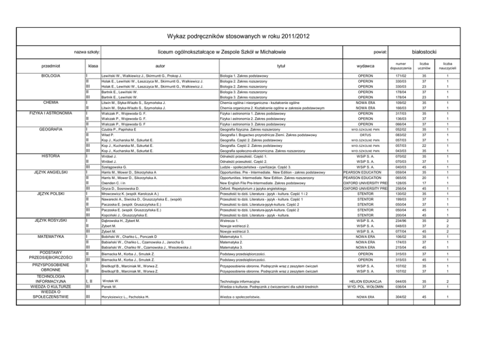 Wykaz podręczników stosowanych w roku 2011/2012 liceum ogólnokształcące w Zespole Szkół w Michałowie nazwa szkoły: przedmiot BIOLOGIA CHEMIA FIZYKA I ASTRONOMIA GEOGRAFIA HISTORIA JĘZYK ANGIELSKI JĘZYK POLSKI JĘZYK ROSYJSKI MATEMATYKA PODSTAWY PRZEDSIĘBIORCZOŚCI PRZYSPOSOBIENIE OBRONNE TECHNOLOGIA INFORMACYJNA WIEDZA O KULTURZE WIEDZA O SPOŁECZEŃSTWIE klasa autor tytuł białostocki powiat: wydawca numer dopuszczenia liczba uczniów liczba nauczycieli I II III II III I II I II II I II II III III I II III I II II III I II II III III I II III I II III Lewiński W., Walkiewicz J., Skirmuntt G., Prokop J. Biologia 1. Zakres podstawowy OPERON 171/02 35 1 Holak E., Lewiński W., Łaszczyca M., Skirmuntt G., Walkiewicz J. Biologia 2. Zakres rozszerzony OPERON 330/03 37 1 Holak E., Lewiński W., Łaszczyca M., Skirmuntt G., Walkiewicz J. Biologia 2. Zakres rozszerzony OPERON 330/03 23 1 Bartnik E., Lewiński W. Biologia 3. Zakres rozszerzony OPERON 178/04 37 1 Bartnik E., Lewiński W. Biologia 3. Zakres rozszerzony OPERON 178/04 23 1 Litwin M., Styka-Wlazło S., Szymońska J. Chemia ogólna i nieorganiczna - kształcenie ogólne NOWA ERA 109/02 35 1 Litwin M., Styka-Wlazło S., Szymońska J. Chemia organiczna 2. Kształcenie ogólne w zakresie podstawowym NOWA ERA 166/03 37 1 Walczak P., Wojewoda G. F. Fizyka i astronomia 1. Zakres podstawowy OPERON 317/03 35 1 Walczak P., Wojewoda G. F. Fizyka i astronomia 2. Zakres podstawowy OPERON 136/03 37 1 Walczak P., Wojewoda G. F Fizyka i astronomia 3. Zakres podstawowy OPERON 066/04 37 1 Czubla P., Papińska E Geografia fizyczna. Zakres rozszerzony WYD.SZKOLNE PWN 052/02 35 1 Wład P. Geografia I. Bogactwo przyrodnicze Ziemi. Zakres podstawowy ORTUS 083/02 37 1 Kop J., Kucharska M., Szkurłat E. Geografia. Część 2. Zakres podstawowy WYD.SZKOLNE PWN 057/03 37 1 Kop J., Kucharska M., Szkurłat E. Geografia. Część 2. Zakres podstawowy WYD.SZKOLNE PWN 057/03 22 1 Kop J., Kucharska M., Szkurłat E. Geografia społeczno-ekonomiczna. Zakres rozszerzony WYD.SZKOLNE PWN 043/03 35 1 Wróbel J. Odnaleźć przeszłość. Część 1. WSiP S. A. 070/02 35 1 Wróbel J. Odnaleźć przeszłość. Część 2. WSiP S. A. 070/03 37 1 Szelągowska G. Ludzie - społeczeństwa - cywilizacje. Część 3. WSiP S. A. 040/03 45 1 Harris M., Mower D., Sikorzyńska A Opportunities. Pre - Intermediate. New Edition - zakres podstawowy PEARSON EDUCATION 059/04 35 1 Harris M., Mower D., Sikorzyńska A. Opportunities. Intermediate. New Edition. Zakres rozszerzony PEARSON EDUCATION 065/05 20 1 Oxenden C. i in New English File Pre-Intermediate. Zakres podstawowy OXFORD UNIVERSITY PRESS 128/05 17 1 Gryca D., Sosnowska D. Oxford. Repetytorium z języka angielskiego OXFORD UNIVERSITY PRESS 256/04 45 1 Mrowcewicz K. (współ. Karolczuk A.) Przeszłość to dziś. Literatura - język - kultura. Część 1 i 2 STENTOR 130/02 35 1 Nawarecki A., Siwicka D., Gruszczyńska E., (współ) Przeszłość to dziś. Literatura - język - kultura. Część 1 STENTOR 199/03 37 1 Paczoska E. (współ. Gruszczyńska E.) Przeszłość to dziś. Literatura-język-kultura. Część 2 STENTOR 050/04 37 1 Paczoska E. (współ. Gruszczyńska E.) Przeszłość to dziś. Literatura-język-kultura. Część 2 STENTOR 050/04 45 1 Kopciński J., Gruszczyńska E. Przeszłość to dziś. Literatura - język - kultura. STENTOR 200/04 45 1 Dąbrowska H., Zybert M. Wstrecza 1. WSiP S. A. 234/96 35 2 Zybert M. Nowyje wstrieczi 2. WSiP S. A. 048/03 37 2 Zybert M. Nowyje wstrieczi 3. WSiP S. A. 077/04 45 2 Bobiński W., Chańko L., Ponczek D Matematyka 1. NOWA ERA 106/02 35 1 Babiański W., Chańko L., Czarnowska J., Janocha G. Matematyka 2. NOWA ERA 174/03 37 1 Babiański W., Chańko W., Czarnowska J., Wesołowska J. Matematyka 3. NOWA ERA 215/04 45 1 II III I II Biernacka M., Korba J., Smutek Z. Podstawy przedsiębiorczości. OPERON 315/03 37 1 Biernacka M., Korba J., Smutek Z. Podstawy przedsiębiorczości. OPERON 315/03 45 1 Breitkopf B., Marciniak M., Worwa Z. Przysposobienie obronne. Podręcznik wraz z zeszytem ćwiczeń WSiP S. A. 107/02 35 1 Breitkopf B., Marciniak M., Worwa Z. Przysposobienie obronne. Podręcznik wraz z zeszytem ćwiczeń WSiP S. A. 107/02 37 1 I, II III Wrotek W. Technologia informacyjna Panek W. Wiedza o kulturze. Podręcznik z ćwiczeniami dla szkół średnich III Moryksiewicz L., Pacholska M. Wiedza o społeczeństwie. HELION EDUKACJA 044/05 35 2 WYD. POL. WOŁOMIN 036/04 37 1 NOWA ERA 304/02 45 1
