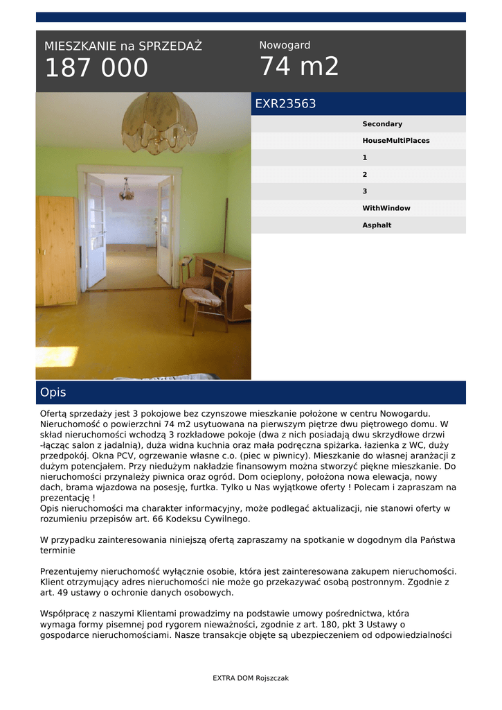 MIESZKANIE na SPRZEDAŻ 187 000 Nowogard 74 m2 EXR23563 Secondary HouseMultiPlaces 1 2 3 WithWindow Asphalt Opis Ofertą sprzedaży jest 3 pokojowe bez czynszowe mieszkanie położone w centru Nowogardu. Nieruchomość o powierzchni 74 m2 usytuowana na pierwszym piętrze dwu piętrowego domu. W skład nieruchomości wchodzą 3 rozkładowe pokoje (dwa z nich posiadają dwu skrzydłowe drzwi -łącząc salon z jadalnią), duża widna kuchnia oraz mała podręczna spiżarka. łazienka z WC, duży przedpokój. Okna PCV, ogrzewanie własne c.o. (piec w piwnicy). Mieszkanie do własnej aranżacji z dużym potencjałem. Przy niedużym nakładzie finansowym można stworzyć piękne mieszkanie. Do nieruchomości przynależy piwnica oraz ogród. Dom ocieplony, położona nowa elewacja, nowy dach, brama wjazdowa na posesję, furtka. Tylko u Nas wyjątkowe oferty ! Polecam i zapraszam na prezentację ! Opis nieruchomości ma charakter informacyjny, może podlegać aktualizacji, nie stanowi oferty w rozumieniu przepisów art. 66 Kodeksu Cywilnego. W przypadku zainteresowania niniejszą ofertą zapraszamy na spotkanie w dogodnym dla Państwa terminie Prezentujemy nieruchomość wyłącznie osobie, która jest zainteresowana zakupem nieruchomości. Klient otrzymujący adres nieruchomości nie może go przekazywać osobą postronnym. Zgodnie z art. 49 ustawy o ochronie danych osobowych. Współpracę z naszymi Klientami prowadzimy na podstawie umowy pośrednictwa, która wymaga formy pisemnej pod rygorem nieważności, zgodnie z art. 180, pkt 3 Ustawy o gospodarce nieruchomościami. Nasze transakcje objęte są ubezpieczeniem od odpowiedzialności EXTRA DOM Rojszczak cywilnej na kwotę 200 000,00 EURO. BIURO NIERUCHOMOŚCI EXTRA DOM ROJSZCZAK 72-200 Nowogard ul. Boh. Warszawy 1 (przy placówce Alior Banku) www.extradom.net.pl tel./fax 91 392 22 33 Co robimy dla klienta zainteresowanego zakupem: * Sprawdzamy zdolność kredytową * Wyszukujemy odpowiednią nieruchomość, * Pomagamy w prowadzeniu negocjacji, * Pomagamy w uzyskaniu potrzebnych dokumentów * Pomagamy w uzyskaniu kredytu hipotecznego * Współpracujemy z kancelariami notarialnymi, geodetami Korzystając z naszych usług oszczędzasz swój czas, a także zyskujesz pewność, że Twoja transakcja zostanie przeprowadzona z należytą starannością, w sposób profesjonalny i co najważniejsze - BEZPIECZNY. Nr licencji pośredników: 21317, 21318 Dorota Więzowska tel. 517 770 353 tel. (91) 392 22 33 email: [email protected] EXTRA DOM Rojszczak Powered by TCPDF (www.tcpdf.org)