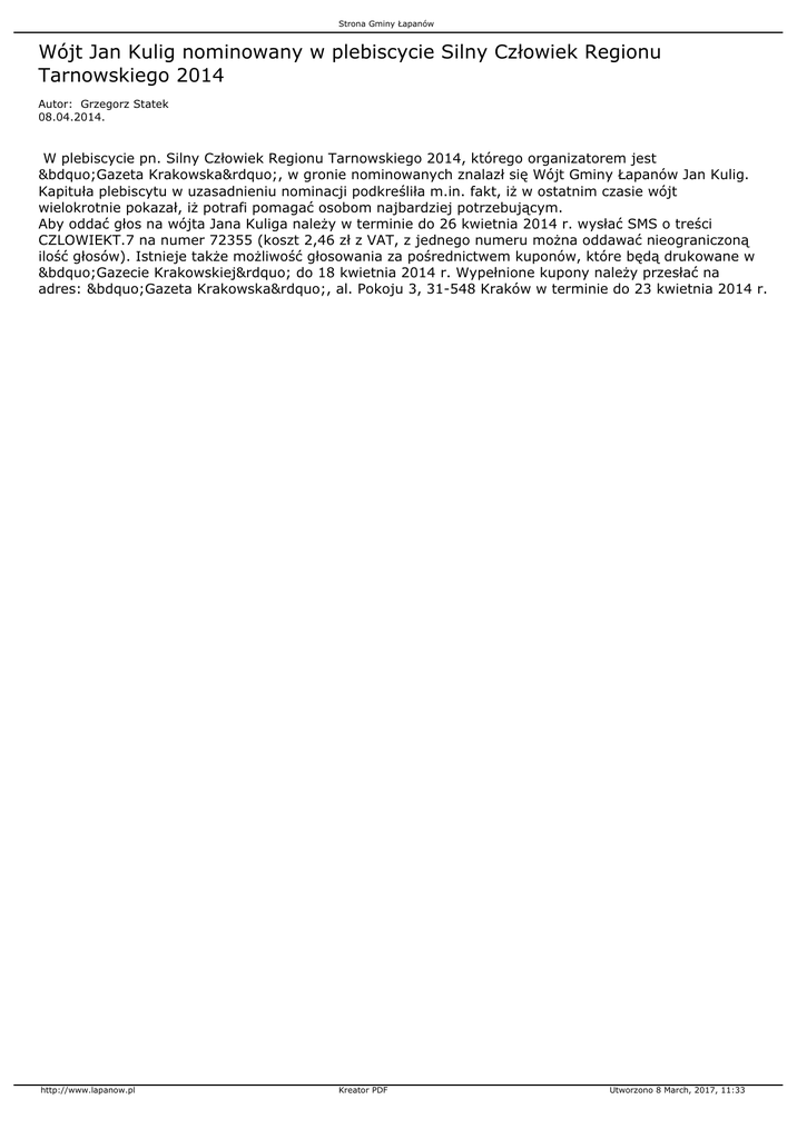 Strona Gminy Łapanów Wójt Jan Kulig nominowany w plebiscycie Silny Człowiek Regionu Tarnowskiego 2014 Autor: Grzegorz Statek 08.04.2014. W plebiscycie pn. Silny Człowiek Regionu Tarnowskiego 2014, którego organizatorem jest „Gazeta Krakowska”, w gronie nominowanych znalazł się Wójt Gminy Łapanów Jan Kulig. Kapituła plebiscytu w uzasadnieniu nominacji podkreśliła m.in. fakt, iż w ostatnim czasie wójt wielokrotnie pokazał, iż potrafi pomagać osobom najbardziej potrzebującym. Aby oddać głos na wójta Jana Kuliga należy w terminie do 26 kwietnia 2014 r. wysłać SMS o treści CZLOWIEKT.7 na numer 72355 (koszt 2,46 zł z VAT, z jednego numeru można oddawać nieograniczoną ilość głosów). Istnieje także możliwość głosowania za pośrednictwem kuponów, które będą drukowane w „Gazecie Krakowskiej” do 18 kwietnia 2014 r. Wypełnione kupony należy przesłać na adres: „Gazeta Krakowska”, al. Pokoju 3, 31-548 Kraków w terminie do 23 kwietnia 2014 r. http://www.lapanow.pl Kreator PDF Utworzono 8 March, 2017, 11:33