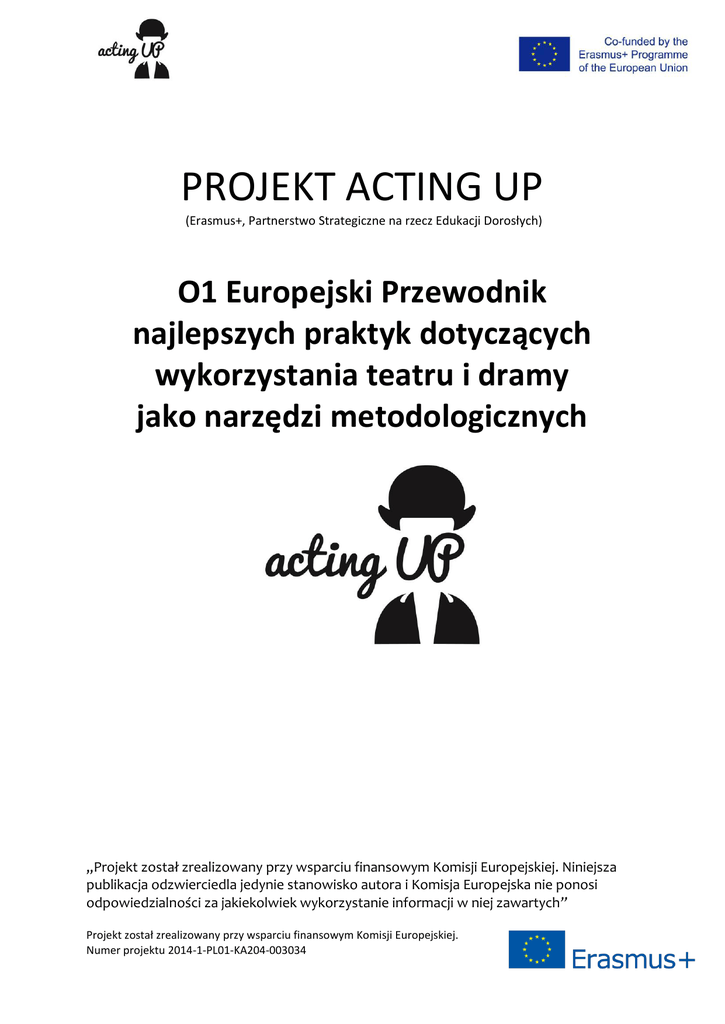 PROJEKT ACTING UP (Erasmus+, Partnerstwo Strategiczne na rzecz Edukacji Dorosłych) O1 Europejski Przewodnik najlepszych praktyk dotyczących wykorzystania teatru i dramy jako narzędzi metodologicznych „Projekt został zrealizowany przy wsparciu finansowym Komisji Europejskiej. Niniejsza publikacja odzwierciedla jedynie stanowisko autora i Komisja Europejska nie ponosi odpowiedzialności za jakiekolwiek wykorzystanie informacji w niej zawartych” Projekt został zrealizowany przy wsparciu finansowym Komisji Europejskiej. Numer projektu 2014-1-PL01-KA204-003034 Spis treści Spis treści................................................................................................................................................. 2 Wprowadzenie ........................................................................................................................................ 3 Francja ..................................................................................................................................................... 4 Włochy................................................................................................................................................... 14 Polska .................................................................................................................................................... 43 Portugalia .............................................................................................................................................. 53 Szkocja ................................................................................................................................................... 63 Projekt został zrealizowany przy wsparciu finansowym Komisji Europejskiej. Numer projektu 2014-1-PL01-KA204-003034 Wprowadzenie Projekt ACTING UP ma na celu zaangażowanie uczących się dorosłych (zwłaszcza tych o niskich kwalifikacjach, z mniejszymi szansami na rynku pracy) do kontynuowania kształcenia poprzez wykorzystanie technik teatralnych i szkolenie umiejętności w tym zakresie, aby pomóc im w znajdowaniu odpowiednich ścieżek kształcenia i zatrudnienia. ACTING UP zapewni specjalistów, takich jak trenerów, doradców, specjalistów pracy socjalnej i pozostałą kadrę nauczycielską specjalizującą się pracy z osobami w trudnej sytuacji i niskowykwalifikowanymi, specjalistów w metodologii, posiadających praktyczne umiejętności, jak wykorzystać techniki teatralne żeby motywować swoich beneficjentów, aby pomóc im w znalezieniu własnych ścieżek kariery, angażując się w uczenie się przez całe życie. Na początkowym etapie partnerzy projektu z Francji, Włoch, Polski, Portugalii i Szkocji prowadzili działalność badawczą, aby przygotować grunt dla rozwoju, adaptacji i pilotowania metodologii projektu ACTING UP. Ten Europejski Przewodnik na temat najlepszych praktyk w korzystaniu z teatru jako narzędzia metodologicznego został opracowany w celu ułatwienia dalszej realizacji. Raport przedstawia przegląd dobrych praktyk w zakresie wykorzystania technik dramatycznych i teatralnych w pięciu krajach europejskich zaangażowanych w projekt ACTING UP. Każdy z partnerów podał cztery przykłady najlepszych praktyk w zakresie wykorzystywania teatru we wspieraniu nauczania dorosłych zagrożonych wykluczeniem społecznym (w tym więźniów, osób długotrwale bezrobotnych, o niskich kwalifikacjach). Wynikiem tego działania jest Europejski Przewodnik na temat najlepszych praktyk w korzystaniu z teatru jako narzędzia metodologicznego. Projekt został zrealizowany przy wsparciu finansowym Komisji Europejskiej. Numer projektu 2014-1-PL01-KA204-003034 Francja 1. Zawody przed sądem TYTUŁ Zawody przed sądem (Jobs on Trial) MIEJSCE Narzędzie wykorzystywane głównie we Francji i Quebecu ORGANIZACJA / INSTYTUCJA Praktyka stworzona w Quebecu Denis Pelletier, Charles Bujold et Gilles Noiseux w 1974 w ramach podejścia "Aktywizacji rozwoju osobistego i zawodowego" (PvdA). Narzędzie to jest wykorzystywane przez różne ośrodki szkoleniowe we Francji i Kanadzie oraz sieci GRETA z Dolnej Normandii. GIP FCIP de Basse Normandie 168 Rue Caponière, 14000 Caen France DANE KONTAKTOWE +33 231301571 [email protected] GRUPA DOCELOWA/ KONTEKST http://jobsontrial.weebly.com/ Projekt "Zawody przed sądem" to symulacja procesu, gdzie zawód jest oskarżony o niewystarczającą atrakcyjność w kontekście tworzenia prawdziwej polityki równości szans. Jest to działalność pedagogiczna dająca beneficjentom możliwość nawiązania kontaktu w kwestii zatrudnienia oraz świata pracy i w związku z tym. Kładzie nacisk na aktywne wyrażenie siebie, jako krok do przodu w kierunku doradztwa zawodowego. Wyzwaniem nie jest odegranie procesu sądowego, ale stworzenie okazji do przedstawienia argumentów i wymiany poglądów. Narzędzie to jest wykorzystywane w ścieżkach dydaktycznych dotyczących poradnictwa i obejmuje około 15 beneficjentów. ZAWARTOŚĆ / EFEKTY KSZTAŁCENIA Celem kursu jest przede wszystkim zainspirowanie uczestników do podjęcia pracy w handlu, które jest głównym przedmiotem rozważań. Kurs powinien rozwiać uprzedzenia dotyczące zatrudnienia i rozwinąć świadomość na temat równości płci. Cele można przedstawić jako: Odkrycie przed uczestnikami nierozważanych propozycji zatrudnienia dzięki sposobom ułatwiającym adaptację. Umożliwienie uczestnikom poszerzania horyzontów i skonfrontowania swoich wyobrażeń (zawodowych i społecznych) na temat określonej branży, zawodu lub pracy. Uświadomienie uczestnikom subiektywizmu wyborów i prezentacji. Rozwijanie świadomości tej właśnie subiektywności wyborów i Projekt został zrealizowany przy wsparciu finansowym Komisji Europejskiej. Numer projektu 2014-1-PL01-KA204-003034 przedstawień. Zachęcenie do zastanowienia się nad mniej widocznymi aspektami transakcji z pozoru nieatrakcyjnych. Rozpowszechnianie wiedzy, możliwości i mi