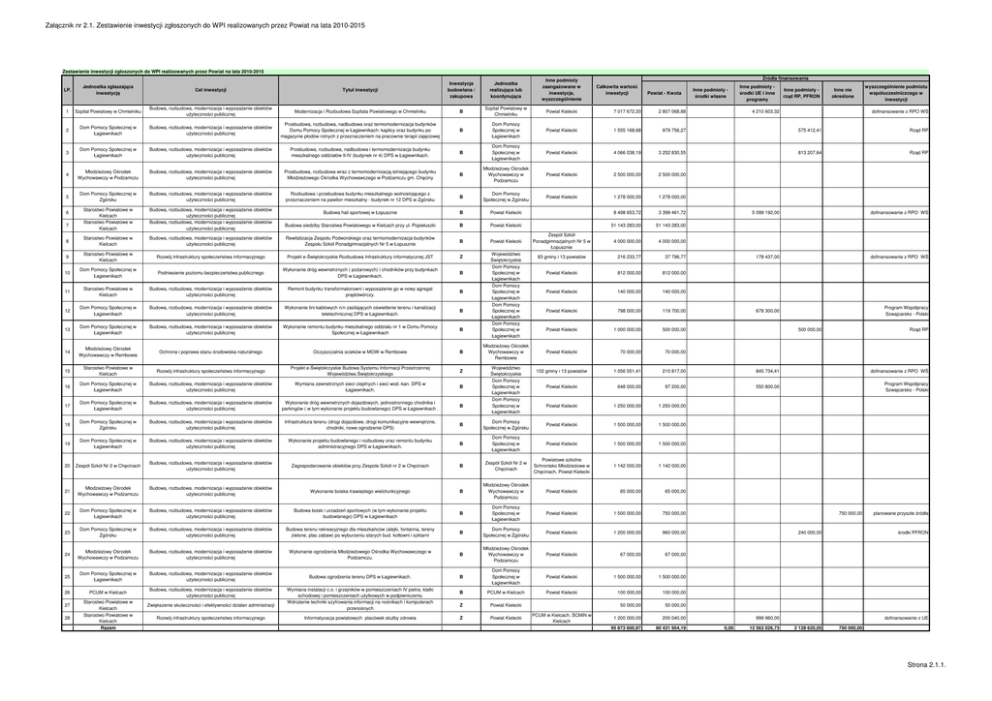 Załącznik nr 2.1. Zestawienie inwestycji zgłoszonych do WPI realizowanych przez Powiat na lata 2010-2015 Zestawienie inwestycji zgłoszonych do WPI realizowanych przez Powiat na lata 2010-2015 Źródła finansowania LP. Jednostka zgłaszająca inwestycję Cel inwestycji Tytuł inwestycji Inwestycja budowlana / zakupowa Jednostka realizująca lub koordynująca Inne podmioty zaangażowane w inwestycje, wyszczególnienie 1 Szpital Powiatowy w Chmielniku Budowa, rozbudowa, modernizacja i wyposażenie obiektów użyteczności publicznej Modernizacja i Rozbudowa Szpitala Powiatowego w Chmielniku B Szpital Powiatowy w Chmielniku Powiat Kielecki 7 017 672,20 2 807 068,88 2 Dom Pomocy Społecznej w Łagiewnikach Budowa, rozbudowa, modernizacja i wyposażenie obiektów użyteczności publicznej Przebudowa, rozbudowa, nadbudowa oraz termomodernizacja budynków Domu Pomocy Społecznej w Łagiewnikach: kaplicy oraz budynku po magazynie płodów rolnych z przeznaczeniem na pracownie terapii zajęciowej B Dom Pomocy Społecznej w Łagiewnikach Powiat Kielecki 1 555 168,68 979 756,27 575 412,41 Rząd RP 3 Dom Pomocy Społecznej w Łagiewnikach Budowa, rozbudowa, modernizacja i wyposażenie obiektów użyteczności publicznej Przebudowa, rozbudowa, nadbudowa i termomodernizacja budynku mieszkalnego oddziałów II-IV (budynek nr 4) DPS w Łagiewnikach. B Dom Pomocy Społecznej w Łagiewnikach Powiat Kielecki 4 066 038,19 3 252 830,55 813 207,64 Rząd RP 4 Młodzieżowy Ośrodek Wychowawczy w Podzamczu Budowa, rozbudowa, modernizacja i wyposażenie obiektów użyteczności publicznej Przebudowa, rozbudowa wraz z termomodernizacją istniejącego budynku Młodzieżowego Ośrodka Wychowawczego w Podzamczu gm. Chęciny B Młodzieżowy Ośrodek Wychowawczy w Podzamczu Powiat Kielecki 2 500 000,00 2 500 000,00 5 Dom Pomocy Społecznej w Zgórsku Budowa, rozbudowa, modernizacja i wyposażenie obiektów użyteczności publicznej Rozbudowa i przebudowa budynku mieszkalnego wolnostojącego z przeznaczeniem na pawilon mieszkalny - budynek nr 12 DPS w Zgórsku B Dom Pomocy Społecznej w Zgórsku Powiat Kielecki 1 278 000,00 1 278 000,00 Starostwo Powiatowe w Kielcach Starostwo Powiatowe w Kielcach Budowa, rozbudowa, modernizacja i wyposażenie obiektów użyteczności publicznej Budowa, rozbudowa, modernizacja i wyposażenie obiektów użyteczności publicznej Budowa hali sportowej w Łopusznie B Powiat Kielecki 8 498 653,72 3 399 461,72 Budowa siedziby Starostwa Powiatowego w Kielcach przy ul. Popiełuszki B Powiat Kielecki 51 143 283,00 51 143 283,00 4 000 000,00 4 000 000,00 93 gminy i 13 powiatów 216 233,77 37 796,77 Powiat Kielecki 812 000,00 812 000,00 Powiat Kielecki 140 000,00 140 000,00 Powiat Kielecki 798 000,00 119 700,00 Powiat Kielecki 1 000 000,00 500 000,00 Powiat Kielecki 70 000,00 70 000,00 1 056 551,41 210 817,00 845 734,41 dofinansowanie z RPO WŚ Powiat Kielecki 648 000,00 97 200,00 550 800,00 Program Współpracy Szwajcarsko - Polski Powiat Kielecki 1 250 000,00 1 250 000,00 6 7 Zespół Szkół Ponadgimnazjalnych Nr 5 w Łopusznie Całkowita wartość inwestycji Powiat - Kwota 8 Starostwo Powiatowe w Kielcach Budowa, rozbudowa, modernizacja i wyposażenie obiektów użyteczności publicznej Rewitalizacja Zespołu Podworskiego oraz termomodernizacja budynków Zespołu Szkół Ponadgimnazjalnych Nr 5 w Łopusznie B 9 Starostwo Powiatowe w Kielcach Rozwój infrastruktury społeczeństwa informacyjnego Projekt e-Świętokrzyskie Rozbudowa Infrastruktury informatycznej JST Z 10 Dom Pomocy Społecznej w Łagiewnikach Podniesienie poziomu bezpieczeństwa publicznego Wykonanie dróg wewnetrznych ( pożarowych) i chodników przy budynkach DPS w Łagiewnikach. B 11 Starostwo Powiatowe w Kielcach Budowa, rozbudowa, modernizacja i wyposażenie obiektów użyteczności publicznej Remont budynku transformatorowni i wyposażenie go w nowy agregat prądotwórczy. B 12 Dom Pomocy Społecznej w Łagiewnikach Budowa, rozbudowa, modernizacja i wyposażenie obiektów użyteczności publicznej Wykonanie lini kablowych n/n zasilających oświetlenie terenu i kanalizacji teletechnicznej DPS w Łagiewnikach. B 13 Dom Pomocy Społecznej w Łagiewnikach Budowa, rozbudowa, modernizacja i wyposażenie obiektów użyteczności publicznej Wykonanie remontu budynku mieszkalnego oddziału nr 1 w Domu Pomocy Społecznej w Łagiewnikach B 14 Młodzieżowy Ośrodek Wychowawczy w Rembowie Ochrona i poprawa stanu środowiska naturalnego Oczyszczalnia scieków w MOW w Rembowie B 15 Starostwo Powiatowe w Kielcach Rozwój infrastruktury społeczeństwa informacyjnego Projekt e-Świętokrzyskie Budowa Systemu Informacji Przestrzennej Województwa Świętokrzyskiego Z 16 Dom Pomocy Społecznej w Łagiewnikach Budowa, rozbudowa, modernizacja i wyposażenie obiektów użyteczności publicznej Wymiana zewnetrznych sieci cieplnych i sieci wod.-kan. DPS w Łagiewnikach. B 17 Dom Pomocy Społecznej w Łagiewnikach Budowa, rozbudowa, modernizacja i wyposażenie obiektów użyteczności publicznej Wykonanie dróg wewnetrznych dojazdowych, jednostronnego chodnika i parkingów ( w tym wykonanie projektu budowlanego) DPS w Łagiewnikach . B 18 Dom Pomocy Społecznej w Zgórsku Budowa, rozbudowa, modernizacja i wyposażenie obiektów użyteczności publicznej Infrastruktura terenu (drogi dojazdowe, drogi komunikacyjne wewnętrzne, chodniki, nowe ogrodzenie DPS) B Dom Pomocy Społecznej w Zgórsku Powiat Kielecki 1 500 000,00 1 500 000,00 Powiat Kielecki 1 500 000,00 1 500 000,00 1 142 000,00 1 142 000,00 Powiat Kielecki Województwo Świętokrzyskie Dom Pomocy Społecznej w Łagiewnikach Dom Pomocy Społecznej w Łagiewnikach Dom Pomocy Społecznej w Łagiewnikach Dom Pomocy Społecznej w Łagiewnikach Młodzieżowy Ośrodek Wychowawczy w Rembowie Województwo Świętokrzyskie Dom Pomocy Społecznej w Łagiewnikach Dom Pomocy Społecznej w Łagiewnikach 102 gminy i 13 powiatów 19 Dom Pomocy Społecznej w Łagiewnikach Budowa, rozbudowa, moderniz