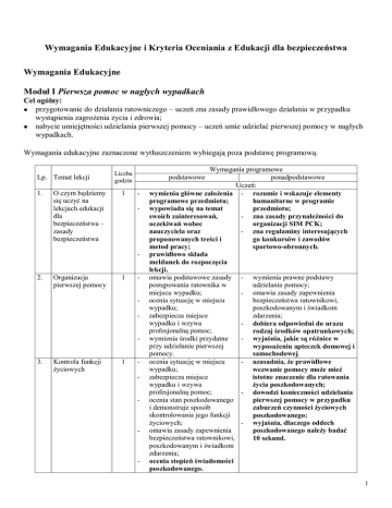 Wymagania Edukacyjne i Kryteria Oceniania z Edukacji dla bezpieczeństwa Wymagania Edukacyjne Moduł I Pierwsza pomoc w nagłych wypadkach Cel ogólny: przygotowanie do działania ratowniczego – uczeń zna zasady prawidłowego działania w przypadku wystąpienia zagrożenia życia i zdrowia; nabycie umiejętności udzielania pierwszej pomocy – uczeń umie udzielać pierwszej pomocy w nagłych wypadkach. Wymagania edukacyjne zaznaczone wytłuszczeniem wybiegają poza podstawę programową. Lp. Temat lekcji 1. O czym będziemy się uczyć na lekcjach edukacji dla bezpieczeństwa – zasady bezpieczeństwa Liczba godzin 1 - - 2. Organizacja pierwszej pomocy 1 - - - 3. Kontrola funkcji życiowych 1 Wymagania programowe ponadpodstawowe Uczeń: wymienia główne założenia - rozumie i wskazuje elementy programowe przedmiotu; humanitarne w programie wypowiada się na temat przedmiotu; swoich zainteresowań, - zna zasady przynależności do oczekiwań wobec organizacji SIM PCK; nauczyciela oraz - zna regulaminy interesujących proponowanych treści i go konkursów i zawodów metod pracy; sportowo-obronnych. prawidłowo składa meldunek do rozpoczęcia lekcji. omawia podstawowe zasady - wymienia prawne podstawy postępowania ratownika w udzielania pomocy; miejscu wypadku; - omawia zasady zapewnienia ocenia sytuację w miejscu bezpieczeństwa ratownikowi, wypadku; poszkodowanym i świadkom zabezpiecza miejsce zdarzenia; wypadku i wzywa - dobiera odpowiedni do urazu profesjonalną pomoc; rodzaj środków opatrunkowych; wymienia środki przydatne - wyjaśnia, jakie są różnice w przy udzielaniu pierwszej wyposażeniu apteczek domowej i pomocy. samochodowej. ocenia sytuację w miejscu - uzasadnia, że prawidłowe wypadku; wezwanie pomocy może mieć zabezpiecza miejsce istotne znaczenie dla ratowania wypadku i wzywa życia poszkodowanych; profesjonalną pomoc; - dowodzi konieczności udzielania ocenia stan poszkodowanego pierwszej pomocy w przypadku i demonstruje sposób zaburzeń czynności życiowych skontrolowania jego funkcji poszkodowanego; życiowych; - wyjaśnia, dlaczego oddech omawia zasady zapewnienia poszkodowanego należy badać bezpieczeństwa ratownikowi, 10 sekund. poszkodowanym i świadkom zdarzenia; ocenia stopień świadomości poszkodowanego. podstawowe - - - - 1 4. Utrata przytomności 1 - - udziela pierwszej pomocy w przypadkach utraty przytomności; ocenia sytuację w miejscu wypadku; zabezpiecza miejsce wypadku i wzywa profesjonalną pomoc. - - - - 5. Resuscytacja krążeniowooddechowa 4 - - 6. Krwawienia i krwotoki 3 - - 7. Uszkodzenia kości i stawów 1 - - - 8. Oparzenia termiczne i chemiczne 1 - - - ocenia sytuację w miejscu wypadku; zabezpiecza miejsce wypadku i wzywa profesjonalną pomoc; udziela pierwszej pomocy w przypadkach utraty oddechu, zatrzymania krążenia. - ocenia sytuację w miejscu wypadku; zabezpiecza miejsce wypadku i wzywa profesjonalną pomoc; omawia zasady zapewnienia bezpieczeństwa ratownikowi, poszkodowanym i świadkom zdarzenia; udziela pierwszej pomocy w przypadkach krwotoków. - ocenia sytuację w miejscu wypadku; zabezpiecza miejsce wypadku i wzywa profesjonalną pomoc; omawia zasady zapewnienia bezpieczeństwa ratownikowi, poszkodowanym i świadkom zdarzenia; udziela pierwszej pomocy w przypadkach złamań i zwichnięć. ocenia sytuację w miejscu wypadku; zabezpiecza miejsce wypadku i wzywa profesjonalną pomoc; omawia zasady zapewnienia bezpieczeństwa ratownikowi, poszkodowanym i świadkom zdarzenia; udziela pierwszej pomocy w - - - - - - - - - omawia zasady zapewnienia bezpieczeństwa ratownikowi, poszkodowanym i świadkom zdarzenia; wykazuje związek miedzy utratą przytomności a zagrożeniem życia; omawia zasady udzielania pomocy nieprzytomnej kobiecie w ciąży; omawia zasady postępowania w urazach termicznych (w udarze słonecznym i cieplnym). omawia zasady zapewnienia bezpieczeństwa ratownikowi, poszkodowanym i świadkom zdarzenia; wymienia najczęstsze przyczyny zaburzeń czynności życiowych poszkodowanego; omawia zasady wykonywania RKO kobiety w ciąży i laryngektomowanego. układa poszkodowanego we właściwe pozycji, w zależności od umiejscowienia urazu; wyjaśnia, dlaczego duży krwotok i wstrząs pourazowy zagrażają życiu; uzasadnia konieczność podjęcia szybkiej akcji ratunkowej; omawia zasady postępowania w krwotokach wewnętrznych. wymienia przyczyny urazów kostno-stawowych; udziela pomocy w przypadku urazów kości i uszkodzeń stawów kończyn dolnych i górnych; wyjaśnia zasady postępowania przy urazach głowy, kręgosłupa i miednicy; omawia zasady postępowania przy urazach żeber. charakteryzuje stopnie oparzeń termicznych; charakteryzuje rodzaje zagrożeń towarzyszących rozległym oparzeniom; wyjaśnia zasady zapobiegania wstrząsowi w rozległym oparzeniu; omawia zasady postępowania przy oparzeniach chemicznych; 2 9. Ciała obce w organizmie 1 - 10. Wstrząs pourazowy 1 - - przypadkach oparzeń. - ocenia sytuację w miejscu wypadku; zabezpiecza miejsce wypadku i wzywa profesjonalną pomoc; udziela pierwszej pomocy w przypadkach dławienia się ciałem obcym. ocenia sytuację w miejscu wypadku; zabezpiecza miejsce wypadku i wzywa profesjonalną pomoc; udziela pierwszej pomocy w przypadkach wstrząsu pourazowego. - - - - - 11. Pogryzienia, użądlenia, ukąszenia 1 Temat wykracza poza podstawę 12. Nagłe zachorowania – chorzy są wśród nas 1 - Temat wykracza poza podstawę 13. Powtórzenie i utrwalenie wiadomości z zakresu udzielania pierwszej pomocy - - 1 - - ocenia sytuację w miejscu wypadku; zabezpiecza miejsce wypadku i wzywa profesjonalną pomoc; udziela pierwszej pomocy w przypadkach ukąszeń, użądleń i pogryzień. ocenia sytuację w miejscu wypadku; zabezpiecza miejsce wypadku i wzywa profesjonalną pomoc; udziela pierwszej pomocy w przypadkach nagłych zachorowań (zawał serca, napad astmy oskrzelowej, epilepsja, niedocukrzenie krwi, udar mózgu, ostre bóle brzucha). stosu