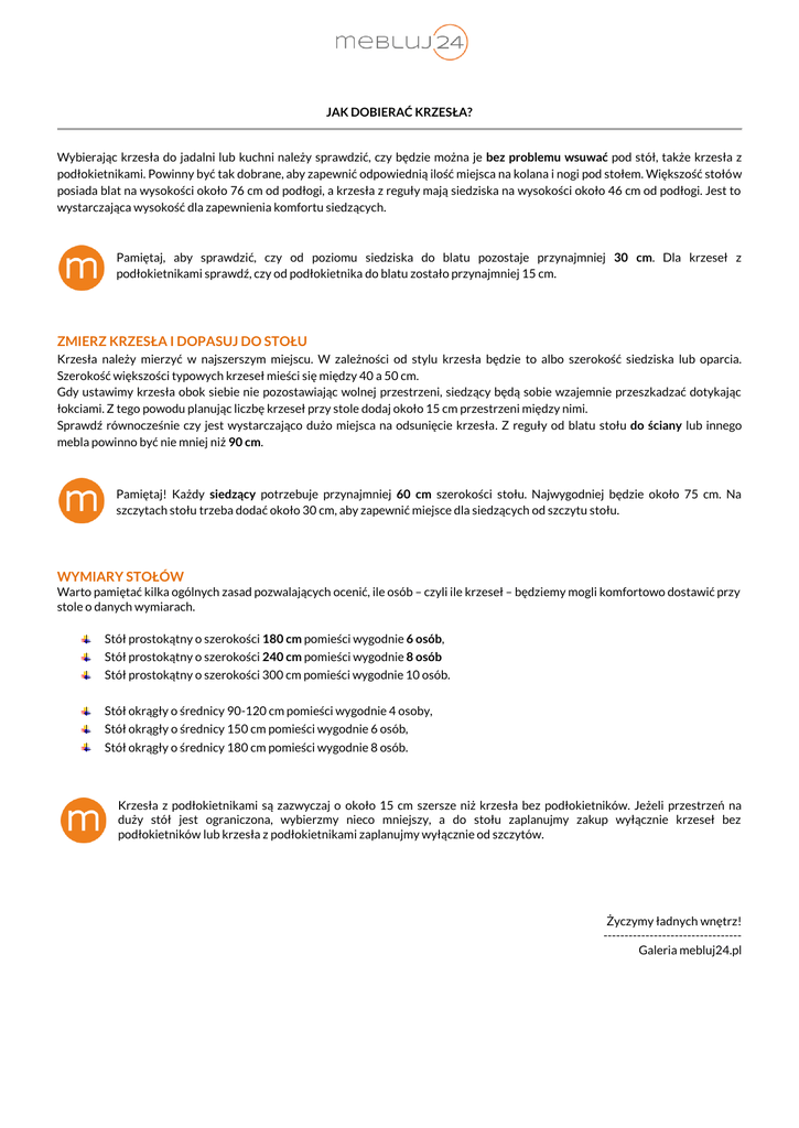 JAK DOBIERAĆ KRZESŁA? Wybierając krzesła do jadalni lub kuchni należy sprawdzić, czy będzie można je bez problemu wsuwać pod stół, także krzesła z podłokietnikami. Powinny być tak dobrane, aby zapewnić odpowiednią ilość miejsca na kolana i nogi pod stołem. Większość stołów posiada blat na wysokości około 76 cm od podłogi, a krzesła z reguły mają siedziska na wysokości około 46 cm od podłogi. Jest to wystarczająca wysokość dla zapewnienia komfortu siedzących. Pamiętaj, aby sprawdzić, czy od poziomu siedziska do blatu pozostaje przynajmniej 30 cm. Dla krzeseł z podłokietnikami sprawdź, czy od podłokietnika do blatu zostało przynajmniej 15 cm. ZMIERZ KRZESŁA I DOPASUJ DO STOŁU Krzesła należy mierzyć w najszerszym miejscu. W zależności od stylu krzesła będzie to albo szerokość siedziska lub oparcia. Szerokość większości typowych krzeseł mieści się między 40 a 50 cm. Gdy ustawimy krzesła obok siebie nie pozostawiając wolnej przestrzeni, siedzący będą sobie wzajemnie przeszkadzać dotykając łokciami. Z tego powodu planując liczbę krzeseł przy stole dodaj około 15 cm przestrzeni między nimi. Sprawdź równocześnie czy jest wystarczająco dużo miejsca na odsunięcie krzesła. Z reguły od blatu stołu do ściany lub innego mebla powinno być nie mniej niż 90 cm. Pamiętaj! Każdy siedzący potrzebuje przynajmniej 60 cm szerokości stołu. Najwygodniej będzie około 75 cm. Na szczytach stołu trzeba dodać około 30 cm, aby zapewnić miejsce dla siedzących od szczytu stołu. WYMIARY STOŁÓW Warto pamiętać kilka ogólnych zasad pozwalających ocenić, ile osób – czyli ile krzeseł – będziemy mogli komfortowo dostawić przy stole o danych wymiarach. Stół prostokątny o szerokości 180 cm pomieści wygodnie 6 osób, Stół prostokątny o szerokości 240 cm pomieści wygodnie 8 osób Stół prostokątny o szerokości 300 cm pomieści wygodnie 10 osób. Stół okrągły o średnicy 90-120 cm pomieści wygodnie 4 osoby, Stół okrągły o średnicy 150 cm pomieści wygodnie 6 osób, Stół okrągły o średnicy 180 cm pomieści wygodnie 8 osób. Krzesła z podłokietnikami są zazwyczaj o około 15 cm szersze niż krzesła bez podłokietników. Jeżeli przestrzeń na duży stół jest ograniczona, wybierzmy nieco mniejszy, a do stołu zaplanujmy zakup wyłącznie krzeseł bez podłokietników lub krzesła z podłokietnikami zaplanujmy wyłącznie od szczytów. Życzymy ładnych wnętrz! --------------------------------Galeria mebluj24.pl