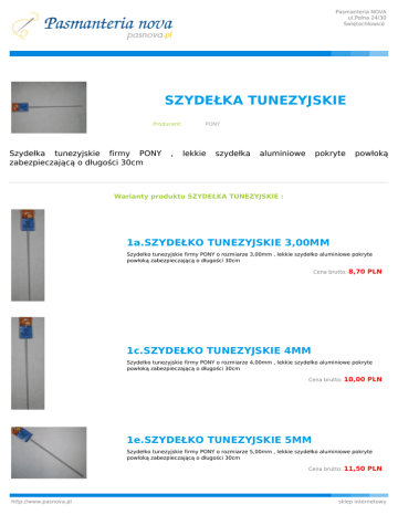 Pasmanteria NOVA ul.Polna 24/30 Świętochłowice SZYDEŁKA TUNEZYJSKIE Producent: Szydełka tunezyjskie firmy PONY zabezpieczającą o długości 30cm , PONY lekkie szydełka aluminiowe pokryte powłoką Warianty produktu SZYDEŁKA TUNEZYJSKIE : 1a.SZYDEŁKO TUNEZYJSKIE 3,00MM Szydełko tunezyjskie firmy PONY o rozmiarze 3,00mm , lekkie szydełko aluminiowe pokryte powłoką zabezpieczającą o długości 30cm Cena brutto: 8,70 PLN 1c.SZYDEŁKO TUNEZYJSKIE 4MM Szydełko tunezyjskie firmy PONY o rozmiarze 4,00mm , lekkie szydełko aluminiowe pokryte powłoką zabezpieczającą o długości 30cm Cena brutto: 10,00 PLN 1e.SZYDEŁKO TUNEZYJSKIE 5MM Szydełko tunezyjskie firmy PONY o rozmiarze 5,00mm , lekkie szydełko aluminiowe pokryte powłoką zabezpieczającą o długości 30cm Cena brutto: http://www.pasnova.pl 11,50 PLN sklep internetowy Pasmanteria NOVA ul.Polna 24/30 Świętochłowice 1f.SZYDEŁKO TUNEZYJSKIE 6MM Szydełko tunezyjskie firmy PONY o rozmiarze 6,00mm , lekkie szydełko aluminiowe pokryte powłoką zabezpieczającą o długości 30cm Cena brutto: http://www.pasnova.pl 11,50 PLN sklep internetowy