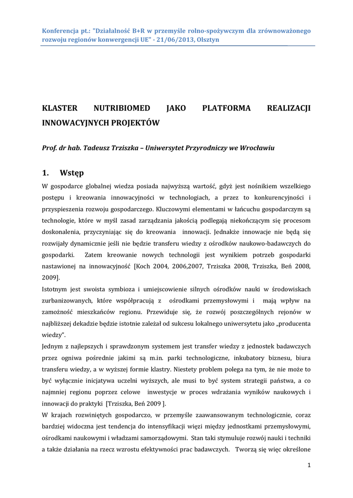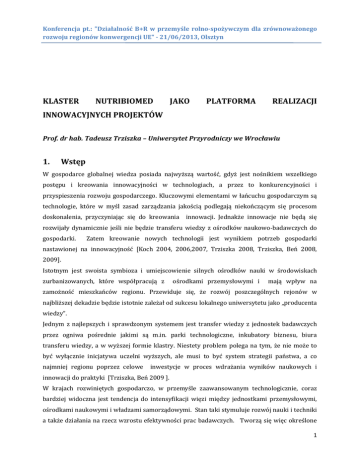 Konferencja pt.: "Działalność B+R w przemyśle rolno-spożywczym dla zrównoważonego rozwoju regionów konwergencji UE" - 21/06/2013, Olsztyn KLASTER NUTRIBIOMED JAKO PLATFORMA REALIZACJI INNOWACYJNYCH PROJEKTÓW Prof. dr hab. Tadeusz Trziszka – Uniwersytet Przyrodniczy we Wrocławiu 1. Wstęp W gospodarce globalnej wiedza posiada najwyższą wartość, gdyż jest nośnikiem wszelkiego postępu i kreowania innowacyjności w technologiach, a przez to konkurencyjności i przyspieszenia rozwoju gospodarczego. Kluczowymi elementami w łańcuchu gospodarczym są technologie, które w myśl zasad zarządzania jakością podlegają niekończącym się procesom doskonalenia, przyczyniając się do kreowania innowacji. Jednakże innowacje nie będą się rozwijały dynamicznie jeśli nie będzie transferu wiedzy z ośrodków naukowo-badawczych do gospodarki. Zatem kreowanie nowych technologii jest wynikiem potrzeb gospodarki nastawionej na innowacyjność [Koch 2004, 2006,2007, Trziszka 2008, Trziszka, Beń 2008, 2009]. Istotnym jest swoista symbioza i umiejscowienie silnych ośrodków nauki w środowiskach zurbanizowanych, które współpracują z ośrodkami przemysłowymi i mają wpływ na zamożność mieszkańców regionu. Przewiduje się, że rozwój poszczególnych rejonów w najbliższej dekadzie będzie istotnie zależał od sukcesu lokalnego uniwersytetu jako „producenta wiedzy”. Jednym z najlepszych i sprawdzonym systemem jest transfer wiedzy z jednostek badawczych przez ogniwa pośrednie jakimi są m.in. parki technologiczne, inkubatory biznesu, biura transferu wiedzy, a w wyższej formie klastry. Niestety problem polega na tym, że nie może to być wyłącznie inicjatywa uczelni wyższych, ale musi to być system strategii państwa, a co najmniej regionu poprzez celowe inwestycje w proces wdrażania wyników naukowych i innowacji do praktyki [Trziszka, Beń 2009 ]. W krajach rozwiniętych gospodarczo, w przemyśle zaawansowanym technologicznie, coraz bardziej widoczna jest tendencja do intensyfikacji więzi między jednostkami przemysłowymi, ośrodkami naukowymi i władzami samorządowymi. Stan taki stymuluje rozwój nauki i techniki a także działania na rzecz wzrostu efektywności prac badawczych. Tworzą się więc określone 1 Konferencja pt.: "Działalność B+R w przemyśle rolno-spożywczym dla zrównoważonego rozwoju regionów konwergencji UE" - 21/06/2013, Olsztyn układy kooperacyjne w których współpracujące podmioty niezależne ekonomicznie, odmienne organizacyjnie łączy określony charakter współzależności techniczno-produkcyjnych [Santarek i wsp.2008, Trziszka, Dobrzański 2008]. Procesowi rozwoju gospodarczego towarzyszy wzrost wagi wykształcenia, które stało się główną drogą prowadzącą do zajęcia wysokiej pozycji na płaszczyźnie konkurencyjności. Zaostrzająca się rywalizacja w gospodarce globalnej stała się motorem rozwoju nowych form współpracy pomiędzy placówkami naukowymi a przemysłem, ponadto w proces ten coraz częściej włączane są władze publiczne, głównie na szczeblu lokalnym lub regionalnym. Uczelnia obok pozyskiwania dodatkowych środków finansowych na swoje programy badawcze jest postrzegana w środowisku przemysłowym jako dostawca praktycznej i użytecznej wiedzy, co w dalszej perspektywie powoduje większe zainteresowanie studentów nauką w tej właśnie jednostce. Nauczyciele akademiccy mają możliwość zdobycia nowych doświadczeń, współpracując ze specjalistami w gospodarce. Studenci mają możliwość podnoszenia swoich kwalifikacji uczestnicząc aktywnie w praktykach przemysłowych. Aktualna polaryzacja w obszarze badań naukowych w kraju i na świecie oraz trendy w zakresie powiązań kooperacyjnych pomiędzy instytucjami naukowymi a gospodarką, skutkuje wzrostem znaczenia klastrów oraz ich roli w rozwoju gospodarczym. 2. Przedsiębiorczość akademicka Przedsiębiorczość akademicka jest zorganizowanym procesem ukierunkowanym na wykorzystanie nowatorskiego pomysłu w celu generowania korzyści dla przedsiębiorców, organizacji i społeczeństwa. Ważnym jest umiejętność wykorzystania pojawiających się szans przy jednoczesnym, reagowaniu na zagrożenia. Wejściem do procesu są uwarunkowania zewnętrze i wewnętrzne, a wśród nich najważniejsze to decyzje o budowie infrastruktury sprzyjającej wdrażaniu zmian. Na wyjściu są wyniki zamierzone i niezamierzone, ocena tych wyników stanowi istotny impuls do kolejnych zmian [Santarek i wsp. 2008]. Przedsiębiorcza uczelnia W uczelni musi być odpowiedni klimat i przestrzeń oraz sprzyjająca kultura dla rozwoju przedsiębiorczości studenckiej i pracowników. Powinny działać efektywnie komórki i jednostki organizacyjne wspierające transfer wiedzy i przedsiębiorczość. Prowadzone badania powinny być ukierunkowane na potrzeby gospodarki i społeczności lokalnej. Wyniki tych badań mogą być wdrażane zarówno przez uczelnię, jak również przez firmy odpryskowe typu spin-off oraz start up . Stosownie do wielkości uczelni efektywność tych działań musi być wspomagana przez uczelniane systemy informatyczne, systemy zapewnienia jakości kształcenia, badań i transferu 2 Konferencja pt.: "Działalność B+R w przemyśle rolno-spożywczym dla zrównoważonego rozwoju regionów konwergencji UE" - 21/06/2013, Olsztyn technologii, zapewnienia jakości obsługi administracyjnej oraz inne wdrażane systemy autonomicznie przez wydziały stosownie do potrzeb. Uczelnia przedsiębiorcza ma określoną misję, strategię i plany działania w których kształcenie, badania oraz transfer wiedzy mają jednakowy priorytet. Jest to tzw. „uniwersytet trzeciej generacji” [Santarek i wsp. 2008, Wissema 2009]. Parki technologiczne Parki technologiczne są miejscem tworzenia i rozwijania przedsiębiorczości, a więc rozwijania sztuki zarządzania. W parkach gromadzi się w jednym miejscu sprzęt, laboratoria, potencjał intelektualny w p
