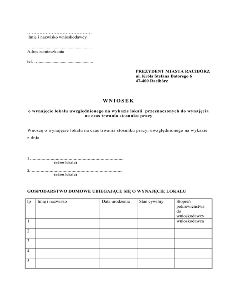 …………………………………… Imię i nazwisko wnioskodawcy ….................................................... Adres zamieszkania tel. …............................................... PREZYDENT MIASTA RACIBÓRZ ul. Króla Stefana Batorego 6 47-400 Racibórz WNIOSEK o wynajęcie lokalu uwzględnionego na wykazie lokali przeznaczonych do wynajęcia na czas trwania stosunku pracy Wnoszę o wynajęcie lokalu na czas trwania stosunku pracy, uwzględnionego na wykazie z dnia ………………………… 1 ………………………………………………………………. (adres lokalu) 2………………………………………………………………. (adres lokalu) GOSPODARSTWO DOMOWE UBIEGAJĄCE SIĘ O WYNAJĘCIE LOKALU lp 1 2 3 4 5 Imię i nazwisko Data urodzenia Stan cywilny Stopień pokrewieństwa do wnioskodawcy wnioskodawca Oświadczam, że łączny okres pozostawania w stosunku pracy (zaznaczyć właściwy kwadrat) □ w podmiocie, którego siedziba, oddział, filia znajduje się na terenie Miasta Racibórz □ w podmiocie, którego siedziba, oddział, filia nie znajduje się na terenie Miasta Racibórz, ale wykonuję/wykonywałem pracę na terenie Miasta Racibórz WYNOSI ……………………………………… (należy podać ilość lat, miesięcy, dni) Oświadczam, że (zaznaczyć właściwy kwadrat) □ nie jestem właścicielem lub użytkownikiem wieczystym nieruchomości gruntowej zabudowanej budynkiem przeznaczonym na cele mieszkalne, nieruchomości lokalowej przeznaczonej na cele mieszkalne, a także nie posiadam spółdzielczego własnościowego prawa do lokalu mieszkalnego □ inne ................................................................................................................................................ …….…………………………… (podpis wnioskodawcy) Załączniki: 1) Zaświadczenie o zatrudnieniu według wzoru stanowiącego załącznik do wniosku lub kopia świadectwo pracy. W przypadku świadectwa pracy, z którego nie będzie wynikało, że oddział, filia lub wykonywana praca znajdowały się na terenie Miasta Racibórz należy dołączyć zaświadczenie wystawione przez poprzedniego pracodawcę. 2) Kopia dyplomu ukończenia szkoły wyższej 3) W przypadku osób, które nie posiadają zameldowania na terenie Miasta Racibórz należy przedłożyć dokument tożsamości lub inny dokument potwierdzający datę urodzenia wnioskodawcy 4) Opinia pracodawcy - załącznik ten nie jest obowiązkowy 5) Wniosek o wynajęcie lokalu wchodzącego w skład mieszkaniowego zasobu Miasta Racibórz – załącznik ten nie jest obowiązkowy UWAGA • Wniosek o wynajęcie lokalu może zostać złożony na maksymalnie dwa lokale (należy wskazać kolejność) • Osoby, które uzyskają tytuł prawny do lokalu wynajmowanego na czas trwania stosunku pracy zobowiązane są w terminie do 31 marca każdego roku kalendarzowego złożyć w Oddziale Gospodarki Mieszkaniowej Miejskiego Zarządu Budynków w Raciborzu, przy ul. Kolejowej 21 aktualne zaświadczenie o pozostawaniu w stosunku pracy w podmiocie, którego siedziba, oddział, filia znajduje się na terenie Miasta Racibórz, lub w podmiocie, którego siedziba, oddział, filia nie znajduje się na terenie Miasta Racibórz, ale osoba wykonuje pracę na terenie Miasta Racibórz, wg wzoru stanowiącego załącznik nr 11 do niniejszego zarządzenia. Załącznik do wniosku o wynajęcie lokalu uwzględnionego na wykazie lokali przeznaczonych do wynajęcia na czas trwania stosunku pracy Nazwa i adres zakładu pracy ZAŚWIADCZENIE Zaświadcza się, że Pan(i) ……………………………………… ur. …………………, aktualnie zajmowane stanowisko ……………………………………………………. jest zatrudniony w podmiocie ………………………………………………………., którego (nazwa podmiotu) □* siedziba, oddział, filia - znajduje się na terenie Miasta Racibórz lub □* siedziba, oddział, filia - nie znajduje się na terenie Miasta Racibórz, ale wyżej wymieniona osoba wykonuje pracę na terenie Miasta Racibórz Od ………………………………………………………………………………………………………. (należy podać datę zawarcia umowy o pracę) ……………………………… (Data) * (zaznaczyć właściwy kwadrat) …………………………………. (Podpis osoby uprawnionej)
