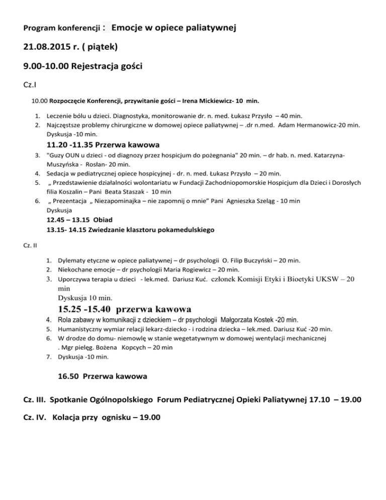 Program konferencji : Emocje w opiece paliatywnej 21.08.2015 r. ( piątek) 9.00-10.00 Rejestracja gości Cz.I 10.00 Rozpoczęcie Konferencji, przywitanie gości – Irena Mickiewicz- 10 min. 1. Leczenie bólu u dzieci. Diagnostyka, monitorowanie dr. n. med. Łukasz Przysło – 40 min. 2. Najczęstsze problemy chirurgiczne w domowej opiece paliatywnej – .dr n.med. Adam Hermanowicz-20 min. Dyskusja -10 min. 11.20 -11.35 Przerwa kawowa 3. "Guzy OUN u dzieci - od diagnozy przez hospicjum do pożegnania" 20 min. – dr hab. n. med. KatarzynaMuszyńska - Rosłan- 20 min. 4. Sedacja w pediatrycznej opiece hospicyjnej - dr. n. med. Łukasz Przysło – 20 min. 5. „ Przedstawienie działalności wolontariatu w Fundacji Zachodniopomorskie Hospicjum dla Dzieci i Dorosłych filia Koszalin – Pani Beata Staszak - 10 min 6. „ Prezentacja „ Niezapominajka – nie zapomnij o mnie” Pani Agnieszka Szeląg - 10 min Dyskusja 12.45 – 13.15 Obiad 13.15- 14.15 Zwiedzanie klasztoru pokamedulskiego Cz. II 1. Dylematy etyczne w opiece paliatywnej – dr psychologii O. Filip Buczyński – 20 min. 2. Niekochane emocje – dr psychologii Maria Rogiewicz – 20 min. 3. Uporczywa terapia u dzieci - lek.med. Dariusz Kuć. członek Komisji Etyki i Bioetyki UKSW – 20 min Dyskusja 10 min. 15.25 -15.40 przerwa kawowa 4. Rola zabawy w komunikacji z dzieckiem – dr psychologii Małgorzata Kostek -20 min. 5. Humanistyczny wymiar relacji lekarz-dziecko - i rodzina dziecka – lek.med. Dariusz Kuć -20 min. 6. W drodze do domu- niemowlę w stanie wegetatywnym w domowej wentylacji mechanicznej . Mgr pielęg. Bożena Kopcych – 20 min 7. Dyskusja -10 min. 16.50 Przerwa kawowa Cz. III. Spotkanie Ogólnopolskiego Forum Pediatrycznej Opieki Paliatywnej 17.10 – 19.00 Cz. IV. Kolacja przy ognisku – 19.00 22.08.2015 ( sobota) 9.00 -12.00 9.00 -Identyfikowania własnych potrzeb i poszukiwanie wsparcia i pomocy jako czynnik profilaktyki wypalenia w opiece nad terminalnie chorymi". Wykład Mgr psychologii Monika Rutke – 40 min. 9.40 – 10.00 przerwa na kawę Cz. III Warsztaty ( czas trwania jednego warsztatu ok.1,5 godziny) I. "Dlaczego oni nie są wypaleni a ja ledwo zipię ?" (Dlaczego ja?; Czy można coś zrobić aby tego uniknąć ?; Czy to jest możliwe aby się uchronić ?...) dr psychologii Maria Rogiewicz II. Identyfikacji własnych potrzeb i poszukiwania sposobów na ich zaspokajanie w trudnej sytuacji życiowej – mgr psychologii Monika Rutke III. Techniki relaksacyjne- mgr psychologii Monika Rutke 12.00 – 12.30 Obiad 18.00 -18.30 Kolacja Imprezy towarzyszące: W przerwie miedzy wykładami zwiedzanie klasztoru pokamedulskiego muzeum Jana Pawła II na Wigrach ,podziemi kościoła gdzie znajdują się katakumby kamedulskie. Widoczne są w nich nisze ze szczątkami zmarłych ojców kamedułów oraz grobowiec biskupa wigierskiego Michała Karpowicza. Na jednej ze ścian krypty znajduje się XVIII wieczne malowidło zwane „Tańcem śmierci”, wieży zegarowej 21 sierpnia w godzinach wieczornych ognisko połączone ze wspólnym śpiewaniem 22 sierpnia po warsztatach planowane są następujące atrakcje do wyboru : Rejs statkiem papieskim po jeziorze Wigry około 1 godzina Spływ kajakiem po Czarnej Hańczy 3-4 godziny Przejażdżka rowerem z przewodnikiem po terenach Wigierskiego Parku Narodowego – 2 godziny Jednocześnie informujemy, że jest możliwość zarezerwowania wycieczki do Wilna w dniu 23 sierpnia 2015 r. Koszt wycieczki około 120 zł wraz z obiadem. Planowany wyjazd około godziny 6.30 rano, przyjazd około 21-22 godziny tego samego dnia. Ze względów organizacyjnych prosimy o wcześniejsza informacje nt. udziału w w/wym wycieczce - spzop@list. Formularz zgłoszenia Konferencja Ogólnopolskiego Forum Pediatrycznej Opieki Paliatywnej „ Emocje w opiece paliatywnej” 21-22 sierpnia 2015 r. Mapa dojazdu: http://www.wigry.pro/index.php?option=com_phocamaps&view=map&id=1&Itemid=138 Proszę przesłać faxem 875676910 lub mailem: [email protected] Nazwa instytucji ...................................................................................................................... Adres ........................................................................................................................................ Zgłaszam uczestnictwo w Konferencji Ogólnopolskiego Forum Pediatrycznej Opieki Paliatywnej w dniach 21-22 sierpnia na Wigrach koło Suwałk następujące osoby (imię i nazwisko, zawód) I............................................................................................................................................ Zawód ........................................data przyjazdu ............................data wyjazdu......................... Udział w następujących warsztatach w dniu 22.08.2015 r. ................................................... ----------------------------------------------------------------------------------------------------------------Planowany udział w następujących imprezach: Rejs statkiem tak/nie Spływ kajakiem tak/nie Przejażdżka rowerem z przewodnikiem tak/nie Wycieczka do Wilna tak/nie II............................................................................................................................................ Zawód ........................................data przyjazdu ............................data wyjazdu......................... Udział w następujących warsztatach w dniu 22.08.2015 r. ................................................... ..................................................................................................................................................... Planowany udział w następujących imprezach: Rejs statkiem tak/nie Spływ kajakiem tak/nie Przejażdżka rowerem z przewodnikiem tak/nie Wycieczka do Wilna tak/nie III........................................................................................................................................... Zawód .......
