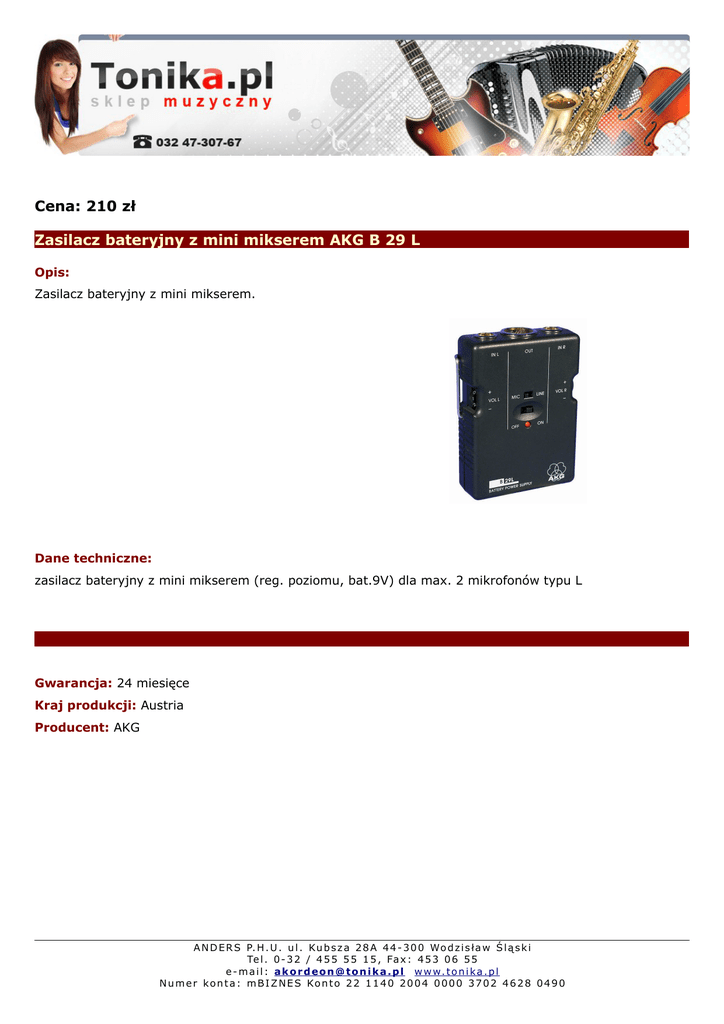 Cena: 210 zł Zasilacz bateryjny z mini mikserem AKG B 29 L Opis: Zasilacz bateryjny z mini mikserem. Dane techniczne: zasilacz bateryjny z mini mikserem (reg. poziomu, bat.9V) dla max. 2 mikrofonów typu L Gwarancja: 24 miesięce Kraj produkcji: Austria Producent: AKG A N D E R S P. H . U . u l . Ku b s z a 2 8 A 4 4 - 3 0 0 Wo d z i s ł a w Ś l ą s k i Te l . 0 - 3 2 / 4 5 5 5 5 1 5 , Fa x : 4 5 3 0 6 5 5 e - m a i l : a k o r d e o n @ t o n i k a . p l w w w. t o n i k a . p l N u m e r k o n t a : m B I Z N E S Ko n t o 2 2 1 1 4 0 2 0 0 4 0 0 0 0 3 7 0 2 4 6 2 8 0 4 9 0