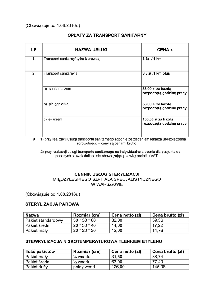 (Obowiązuje od 1.08.2016r.) OPŁATY ZA TRANSPORT SANITARNY LP NAZWA USŁUGI CENA x 1. Transport sanitarny/ tylko kierowcą 3,3zł / 1 km 2. Transport sanitarny z: 3,3 zł /1 km plus a) sanitariuszem 33,00 zł za kaŜdą rozpoczętą godzinę pracy b) pielęgniarką 53,00 zł za kaŜdą rozpoczętą godzinę pracy c) lekarzem 105,00 zł za kaŜdą rozpoczętą godzinę pracy X 1) przy realizacji usługi transportu sanitarnego zgodnie ze zleceniem lekarza ubezpieczenia zdrowotnego – ceny są cenami brutto, 2) przy realizacji usługi transportu sanitarnego na indywidualne zlecenie dla pacjenta do podanych stawek dolicza się obowiązującą stawkę podatku VAT. CENNIK USŁUG STERYLIZACJI MIĘDZYLESKIEGO SZPITALA SPECJALISTYCZNEGO W WARSZAWIE (Obowiązuje od 1.08.2016r.) STERYLIZACJA PAROWA Nazwa Pakiet standardowy Pakiet średni Pakiet mały Rozmiar (cm) 30 * 30 * 60 20 * 30 * 40 20 * 20 * 20 Cena netto (zł) 32,00 14,00 12,00 Cena brutto (zł) 39,36 17,22 14,76 STEWRYLIZACJA NISKOTEMPERATUROWA TLENKIEM ETYLENU Ilość pakietów Pakiet mały Pakiet średni Pakiet duŜy Rozmiar (cm) ¼ wsadu ½ wsadu pełny wsad Cena netto (zł) 31,50 63,00 126,00 Cena brutto (zł) 38,74 77,49 145,98 (Obowiązuje od 1.08.2016r.) WYNAJEM SALI KONFERENCYJNEJ ceny zawierają podatek vat 23% LP NAZWA USŁUGI CENA brutto 1 Wynajem sali konferencyjnej do 140 osób- 1 godzina 150,00 2 Wynajem sali konferencyjnej do 140 osób - 1 dzień 450,00 3 Wynajem sali konferencyjnej do 140 osób - 1 tydzień 1 500,00 4 Wynajem sali konferencyjnej do 100 osób- 1 godzina 100,00 5 Wynajem sali konferencyjnej do 100 osób - 1 dzień 350,00 6 Wynajem sali konferencyjnej do 100 osób - 1 tydzień 7 Wynajem sali konferencyjnej do 35 osób- 1 godzina 8 Wynajem sali konferencyjnej do 35 osób - 1 dzień 150,00 9 Wynajem sali konferencyjnej do 35 osób - 1 tydzień 500,00 1 000,00 50,00 WyposaŜenie standardowe sali: nagłośnienie, mikrofon bezprzewodowy, ekran