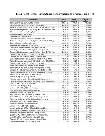 Lista Podst_Uzup odp atno pacj. zwi kszona o wi cej, ni 1,- z nazwa leku Torvacard 40 tabl.powl. 0,04 g 90 tabl. Oranex gran.do p.syr. 0,2 g/5ml 1 but.a 30ml AziTeva pr.do p.zaw.doust. 0,2 g/5ml 1 but.a 30ml(27,5g) Sumamed forte gran.do p.syr. 0,2 g/5ml 1 but.HDPE a 30ml Clobex szamp.leczn. 0,5 mg/1g 60 ml Elocom maœæ 1 mg/1g 30 g Elocom krem 1 mg/1g 30 g Rawel SR tabl.powl.o p.uwaln. 1,5 mg 60 tabl. AziTeva pr.do p.zaw.doust. 0,2 g/5ml 1 but.a 22,5ml(22 g) Sortis 80 tabl.powl. 0,08 g 30 tabl. Elocom p³yn na skórê 1 mg/1g 20 ml Climara 50 syst.transderm. 0,05 mg/24h 4 szt. Fem 7 syst.transderm. 0,05 mg/24h 4 szt. (15cm2) Sumamed forte gran.do p.syr. 0,2 g/5ml 1 but.HDPE a 20ml Oranex gran.do p.syr. 0,2 g/5ml 1 but.a 20ml Diuresin SR tabl.powl.o p.uwaln. 1,5 mg 50 tabl. Sumamed gran.do p.syr. 0,1 g/5ml 1 but.HDPE a 20ml AzitroLEK pr.do p.zaw.doust. 0,1 g/5ml 1 but.a 20ml(16,5g) Oranex gran.do p.syr. 0,1 g/5ml 1 but.a 20ml Atoris tabl.powl. 0,02 g 90 tabl.(9 blist.x10 szt. Torvacard 20 tabl.powl. 0,02 g 90 tabl.(9 blist.x10 szt. Diuresin SR tabl.powl.o p.uwaln. 1,5 mg 40 tabl.(4x10) Ramipril-ratiopharm tabl. 0,01 g 30 tabl.(3 blist.x10szt.) Piramil 10 mg tabl. 0,01 g 30 tabl.(3x10) Ampril 10 mg tabl. 0,01 g 30 tabl. Ramicor kaps.twarde 0,01 g 30 kaps.(3 blist.po 10 sz AzitroLEK pr.do p.zaw.doust. 0,2 g/5ml 1 but.a 20ml(16,5g) Encorton tabl. 0,02 g 20 tabl.(fiol.) Elosone krem 1 mg/1g 30 g Lisiprol tabl. 0,02 g 56 tabl.(4 blist.po 14 sz Axtil tabl. 0,01 g 28 tabl.(4 blist.po 7 szt Ramistad 10 tabl. 0,01 g 28 tabl. Apo-Rami tabl. 0,01 g 28 tabl.(2 blist.po 14 sz Zocor 80 tabl.powl. 0,08 g 28 tabl.(2 blist.po 14 sz Simcovas tabl.powl. 0,08 g 28 tabl.(2 blist.po 14 sz Mycosyst kaps. 0,2 g 7 kaps.(blister) Flumycon kaps. 0,2 g 7 kaps.(blister) Vivace 10 mg tabl. 0,01 g 30 tabl. Imuran tabl.powl. 0,05 g 100 tabl.(4 blist.po 25 s Tertensif SR tabl.powl.o p.uwaln. 1,5 mg 30 tabl. Rawel SR tabl.powl.o p.uwaln. 1,5 mg 30 tabl. Ipres long 1,5 tabl.o przed³.uwaln. 1,5 mg 30 tabl. Indix SR tabl.o przed³.uwaln. 1,5 mg 30 tabl. Diuresin SR tabl.powl.o p.uwaln. 1,5 mg 30 tabl. Captopril Polfarmex tabl. 0,05 g 90 tabl. stara zap ata 60,15 z 29,03 z 22,90 z 30,02 z 19,49 z 12,80 z 12,80 z 9,05 z 18,88 z 96,51 z 9,98 z 15,45 z 15,45 z 24,63 z 23,39 z 7,76 z 15,92 z 9,84 z 15,91 z 73,02 z 30,08 z 6,21 z 5,98 z 3,50 z 4,68 z 8,85 z 15,17 z 3,20 z 12,65 z 29,63 z 6,83 z 5,97 z 3,20 z 47,93 z 17,09 z 16,35 z 16,34 z 5,98 z 6,40 z 11,34 z 5,08 z 5,08 z 5,08 z 5,08 z 12,71 z nowa zap ata 70,77 z 38,48 z 32,35 z 39,47 z 28,78 z 20,35 z 20,35 z 16,48 z 25,96 z 103,60 z 16,55 z 21,88 z 21,88 z 30,93 z 29,69 z 13,95 z 21,33 z 15,25 z 21,32 z 78,33 z 35,39 z 11,16 z 10,90 z 8,42 z 9,60 z 13,77 z 19,99 z 7,96 z 17,31 z 34,22 z 11,42 z 10,56 z 7,79 z 52,34 z 21,50 z 20,43 z 20,42 z 9,88 z 10,11 z 15,05 z 8,79 z 8,79 z 8,79 z 8,79 z 16,42 z ró nica zap aty 10,62 z 9,45 z 9,45 z 9,45 z 9,29 z 7,55 z 7,55 z 7,43 z 7,09 z 7,08 z 6,58 z 6,43 z 6,43 z 6,30 z 6,30 z 6,19 z 5,41 z 5,41 z 5,41 z 5,31 z 5,31 z 4,95 z 4,92 z 4,92 z 4,92 z 4,92 z 4,82 z 4,76 z 4,66 z 4,59 z 4,59 z 4,59 z 4,59 z 4,40 z 4,40 z 4,07 z 4,07 z 3,90 z 3,71 z 3,71 z 3,71 z 3,71 z 3,71 z 3,71 z 3,71 z Elocom maœæ 1 mg/1g 15 g Elocom krem 1 mg/1g 15 g Momederm maœæ 1 mg/1g 15 g Encorton tabl. 0,01 g 20 tabl.(fiol.) Cutivate krem 0,5 mg/1g 15 g Cutivate maœæ 0,05 mg/1g 15 g Torvalipin tabl.powl. 0,04 g 30 tabl.(3x10) Larus tabl.powl. 0,04 g 30 tabl.(3 blist.x10szt.) Atractin (Copastatin) tabl.powl. 0,04 g 30 tabl.(blistry) Sortis 40 tabl.powl. 0,04 g 30 tabl. Polpril kaps.twarde 0,01 g 28 kaps.(4x7) Polpril kaps.twarde 0,01 g 28 kaps.(2x14) Indapres tabl.powl. 2,5 mg 30 tabl.(2x15) Apo-Indap tabl.powl. 2,5 mg 30 tabl. Arifon tabl.powl. 2,5 mg 30 tabl. Omar kaps.dojel.twarde 0,02 g 30 kaps.(pojem.) Ramve 10 mg kaps.twarde 0,01 g 28 kaps.(2x14) Sortis 80 tabl.powl. 0,08 g 14 tabl. Q-pril tabl.powl. 0,04 g 30 tabl.(5 blist.po 6 szt Quinapril TEVA 40 mg tabl.powl. 0,04 g 30 tabl. AprilGen 40 mg tabl.powl. 0,04 g 30 tabl. Piramil 10 mg tabl. 0,01 g 28 tabl.(blistry) Piramil 10 mg tabl. 0,01 g 28 tabl.(4 blist.po 7 szt Elosone krem 1 mg/1g 15 g Dermovate roztwór na skórê 0,5 mg/1ml 50 ml (butelka) Lanzostad kaps.dojel.twarde 0,03 g 28 kaps.(4x7) Lantrea kaps.dojel.twarde 0,03 g 28 kaps.(butel.) LansoLEK 30 kaps.dojel.twarde 0,03 g 28 kaps.(4x7) Renazol kaps.dojel.twarde 0,03 g 28 kaps.(4x7) Helicid 20 kaps. 0,02 g 28 kaps.(butel.) Notis 20 kaps.dojel.twarde 0,02 g 28 kaps. Panogastin tabl.dojelit. 0,04 g 28 tabl.(2 blist.po 14 sz Omeprazol -Egis kaps. 0,02 g 28 kaps. Pantoprazol-ratiopharm tabl.dojelit. 0,04 g 28 tabl.(2 blist.po 14 sz Helopan tabl.dojelit. 0,04 g 28 tabl.(2 blist.po 14 sz Lanzul kaps. 0,03 g 28 kaps. Ortanol kaps.twarde 0,02 g 28 kaps. Panzol tabl.dojelit. 0,04 g 28 tabl.(2 blist.po 14 sz Rapilazole kaps.dojel.twarde 0,03 g 28 kaps. Lanbax kaps.dojel.twarde 0,03 g 28 kaps.(4x7) Exter kaps. 0,02 g 28 kaps.(4x7) Loseprazol 20 kaps.dojel.twarde 0,02 g 28 kaps. Contix tabl.dojelit. 0,04 g 28 tabl.(2 blist.po 14 sz Prazol kaps. 0,02 g 28 kaps. Progastim kaps.dojel. 0,02 g 28 kaps.(butel.) Amertil rozt.doust. 1 mg/1ml 200 ml (butelka) Benazepril STADA 20 tabl.powl. 0,02 g 30 tabl. Lotensin tabl.powl. 0,02 g 28 tabl.(2 blist.po 14 sz 8,94 z 8,94 z 6,18 z 3,20 z 6,10 z 6,10 z 19,97 z 18,54 z 19,72 z 121,73 z 5,90 z 5,90 z 5,05 z 4,88 z 9,70 z 15,34 z 4,40 z 47,75 z 23,95 z 26,53 z 26,54 z 3,20 z 3,20 z 6,19 z 11,61 z 26,53 z 16,49 z 18,29 z 18,29 z 10,34 z 16,95 z 16,71 z 30,04 z 17,00 z 12,58 z 12,58 z 9,81 z 6,77 z 9,65 z 9,65 z 23,51 z 22,08 z 23,26 z 125,27 z 9,34 z 9,34 z 8,44 z 8,27 z 13,09 z 18,67 z 7,71 z 51,06 z 27,23 z 29,81 z 29,82 z 6,40 z 6,40 z 9,33 z 14,72 z 29,63 z 19,59 z 21,39 z 21,39 z 13,44 z 20,05 z 19,81 z 33,14 z 20,10 z 3,64 z 3,64 z 3,63 z 3,57 z 3,55 z 3,55 z 3,54 z 3,54 z 3,54 z 3,54 z 3,44 z 3,44 z 3,39 z 3,39 z 3,39 z 3,33 z 3,31 z 3,30 z 3,28 z 3,28 z 3,28 z 3,20 z 3,20 z 3,14 z 3,11 z 3,10 z 3,10 z 3,10 z 3,