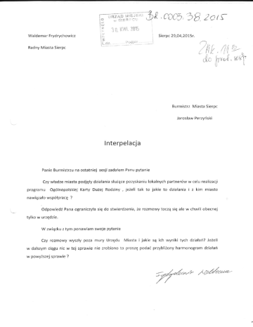 o iłlr':s'ąl iHźąg . .t.Ę- '_q ,!.,cac1,)B zctr Llf j., Waldemar Frydrychowicz Rad ny Miasta Sierpc i :jt" lir,ryi. ?015 Sierpc 29,04,201.5r. i:.. iL. dz. . .. . i'ix.l;ll:' . ?tłt ł, /lt t,> r'r,"i. *q\ ii"t Burmistrz Miasta Sierpc Ja rosłaW Perzyński lnterpelacja Panie Burmistrzu na ostatniej sesji zadałem Panu pytanie Czy wladze miasta podjęły działania służącepozyskaniu lokalnych pańnerów w celu realizacji pro8ramu ogó|nopolskiej Karty Dużej Rodziny , jeżeli tak to jakie to działania i z klm miasto nawiązało współpracę ? odpowiedź Pana ograniczyła się do stwierdzenia, że rozmowy toczą 5ię a]e w chwili obecnej tylko W urzędzie. W związku z tym ponawiam swoje pytanie czy rozmowy wyszły poza mury Urzędu Miasta ijakie są ich wyniki tych działań? Jeżeli w dalszym ciągu nic W tej sprawie nie zrobiono to proszę podać przybliżony harmonogram działań w powyższej sprawie ? ,ź.".p ,ł.p/ńou''
