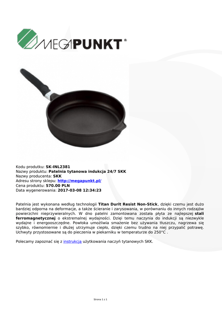 Kodu produtku: SK-INL2381 Nazwy produktu: Patelnia tytanowa indukcja 24/7 SKK Nazwy producenta: SKK Adresu strony sklepu: http://megapunkt.pl/ Cena produktu: 570.00 PLN Data wygenerowania: 2017-03-08 12:34:23 Patelnia jest wykonana według technologii Titan Durit Resist Non-Stick, dzięki czemu jest dużo bardziej odporna na deformacje, a także ścieranie i zarysowania, w porównaniu do innych rodzajów powierzchni nieprzywieralnych. W dno patelni zamontowana została płyta ze najlepszej stali ferromagnetycznej o ekstremalnej wydajności. Dzięi temu naczynia do indukcji są niezwykle wydajne i energooszczędne. Powłoka umożliwia smażenie bez używania tłuszczu, nagrzewa się szybko, równomiernie i dłużej utrzymuje ciepło, dzięki czemu trudno na niej przypalić potrawę. Uchwyty przystosowane są do pieczenia w piekarniku w temperaturze do 250°C . Polecamy zapoznać się z instrukcją użytkowania naczyń tytanowych SKK. Strona 1 z 1