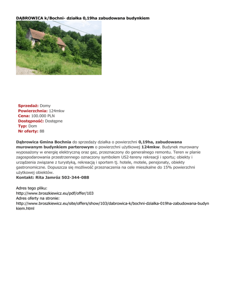 DĄBROWICA k/Bochni- działka 0,19ha zabudowana budynkiem Sprzedaż: Domy Powierzchnia: 124mkw Cena: 100.000 PLN Dostępność: Dostępne Typ: Dom Nr oferty: 88 Dąbrowica Gmina Bochnia do sprzedaży działka o powierzchni 0,19ha, zabudowana murowanym budynkiem parterowym o powierzchni użytkowej 124mkw. Budynek murowany wyposażony w energię elektryczną oraz gaz, przeznaczony do generalnego remontu. Teren w planie zagospodarowania przestrzennego oznaczony symbolem US2-tereny rekreacji i sportu; obiekty i urządzenia związane z turystyką, rekreacją i sportem tj. hotele, motele, pensjonaty, obiekty gastronomiczne. Dopuszcza się możliwość przeznaczenia na cele mieszkalne do 15% powierzchni użytkowej obiektów. Kontakt: Rita Jamróz 502-344-088 Adres tego pliku: http://www.broszkiewicz.eu/pdf/offer/103 Adres oferty na stronie: http://www.broszkiewicz.eu/site/offers/show/103/dabrowica-k/bochni-dzialka-019ha-zabudowana-budyn kiem.html