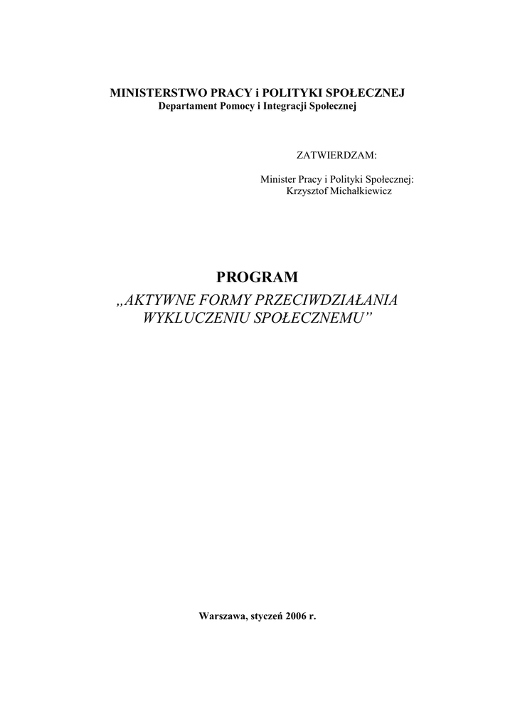 MINISTERSTWO PRACY i POLITYKI SPOŁECZNEJ Departament Pomocy i Integracji Społecznej ZATWIERDZAM: Minister Pracy i Polityki Społecznej: Krzysztof Michałkiewicz PROGRAM „AKTYWNE FORMY PRZECIWDZIAŁANIA WYKLUCZENIU SPOŁECZNEMU” Warszawa, styczeń 2006 r. I. UWARUNKOWANIA PROGRAMU Rok 2004 traktowany był jako okres pilotażowy we wprowadzaniu w życie rozwiązań prawno-ekonomicznych, uchwalonej w dniu 13 czerwca 2003 roku ustawy o zatrudnieniu socjalnym (Dz.U.122,1134 z późn. zm), natomiast w 2005 roku odnotowano pierwsze efekty działania centrów integracji społecznej. W tym roku, pierwsi uczestnicy zajęć w centrach zaczęli korzystać z kolejnej aktywnej formy pomocy jaką jest zatrudnienie wspierane (pomoc urzędów pracy, zatrudnienie w centrum) bądź też, rozpoczęli tworzenie własnych miejsc pracy wykorzystując formułę spółdzielni socjalnej. Doświadczenia działających w 2005 r. centrów, którymi były między innymi takie ośrodki jak: Olsztyn, Bystrzyca Kłodzka, Kielce, Toruń, Gorzów Wlkp., Poznań, Byczyna (woj. opolskie), Drezdenko (woj. lubuskie), oraz Zielona Góra są wzorcem dla innych instytucji chcących tworzyć te podmioty. Proces inicjowania nowych aktywnych form udzielania pomocy osobom z grup szczególnego ryzyka, zagrożonych realnym wykluczeniem społecznym jest jednak spowolniony, a w niektórych rejonach kraju nawet zbyt mało rozpowszechniony wśród służb pomocy społecznej oraz służb zatrudnienia. Inspiracją dla opracowania resortowego Programu pod nazwą „Aktywne formy przeciwdziałania wykluczeniu społecznemu” (zwanego dalej: Programem) są: 1) priorytet nr 3 Krajowego Plan Działania na rzecz Integracji Społecznej na lata 2004-2006 – Aktywizacja i integracja grup zagrożonych wykluczeniem społecznym, 2) wytyczna nr 3 Rady Europejskiej dla polityk społecznych krajów UE (Nicea 2000) - zwalczanie ubóstwa oraz wszelkich form wykluczenia i dyskryminacji w celu promowania integracji społecznej, 3) najważniejszy priorytet Narodowej Strategii Zatrudnienia na lata 2000-2006 - wzrost liczby pracujących w ogóle oraz obsadzenie wszystkich dostępnych miejsc pracy. Koncepcja Programu zmierza do zintensyfikowania w kraju działań wykorzystujących instrumentarium dwóch ustaw a mianowicie: 1) ustawy z 13 czerwca 2003 roku o zatrudnieniu socjalnym (Dz.U.122, 1134 z późn. zm), 2) ustawy z dnia 20 kwietnia 2004 r. o promocji zatrudnienia i instytucjach rynku pracy (Dz. U. Nr 99, poz. 1001, z późn. zm) oraz towarzyszących jej aktów wykonawczych, oraz szerszego wykorzystania wprowadzonego od 1 listopada 2005 roku nowego instrumentu aktywizacji osób bezrobotnych, którym są programy prac społecznie użytecznych. Ten instrument jest jeszcze mało rozpowszechniony wśród samorządów gmin, wskazanych jako głównych organizatorów tych prac, a z kolei ukierunkowanie jego na grupy osób bezrobotnych, korzystających ze świadczeń pomocy społecznej czyni z tego instrumentu ważne narzędzie w procesie aktywizacji zawodowej oraz przywracania tych osób do pełnienia ponownych ról społecznych na rynku pracy. Jednym z celów Programu jest wskazanie i promowanie dobrych wzorców współpracy różnych partnerów instytucjonalnych, w tym centrów integracji społecznej, ośrodków pomocy społecznej, oraz urzędów pracy na obszarze powiatu a nawet całego województwa, działających na rzecz likwidacji czynników uznanych jako te, które w zdecydowany sposób determinują aktualną trudną sytuację grup najbardziej narażonych na wykluczenie społeczne. 2 Realizacja poszczególnych komponentów Programu pozwoli na szybsze wydostawanie się osób, bądź rodzin z kręgu ubóstwa stwarzając im szanse aktywnego włączenia się w przełamywanie podstawowych barier w powrocie na rynek pracy i pełnieniu ról społecznych. Jednym z zadań Programu jest też utworzenie na bazie istniejących centrów integracji społecznej dwóch lub trzech ośrodków edukacyjno-szkoleniowych dla przyszłej kadry pracowników tych centrów. II. PROMOTOR I REALIZATORZY PROGRAMU Promotorem Programu jest Minister Pracy i Polityki Społecznej (dalej: Promotor Programu), który zwróci się do wszystkich marszałków województw o aktywne włączenie się w jego realizację regionalnych ośrodków polityki społecznej, wojewódzkich urzędów pracy, szczególnie w zakresie nakłaniania samorządów gmin do tworzenia koncepcji budowy centrów i klubów integracji społecznej, a także udzielania pomocy osobom, zaliczanym do wybranych grup zagrożonych wykluczeniem społecznym poprzez inicjowanie programów prac społecznie użytecznych. Na liście realizatorów i potencjalnych partnerów Programu umieszczono: 1) samorządy gmin i powiatów oraz regionalne ośrodki polityki społecznej i wojewódzkie urzędy pracy, 2) organizacje pozarządowe, posiadające doświadczenie w działalności na rzecz przeciwdziałania wykluczeniu społecznemu, 3) centra i kluby integracji społecznej, jakie działały w 2005 roku, świadcząc usługi wobec grup szczególnego ryzyka na rynku pracy. Lista realizatorów Programu jest otwarta co oznacza, że inne instytucje mogą przystępować do niego na zasadach utworzenia porozumień o współpracy lokalnej. W grupie innych partnerów pożądanymi instytucjami są: Ochotnicze Hufce Pracy, Akademickie Biura Karier, Szkolne Ośrodki Karier, Gminne Centra Informacji oraz Kluby Pracy. Zawiązywanie lokalnych partnerstw na rzecz realizacji Programu oparte powinno być na przestrzeganiu takich zasad i reguł postępowania jak: 1) dobrowolność uczestnictwa poszczególnych instytucji i organizacji, 2) efektywność pomocy udzielanej osobom zagrożonym wykluczeniem, 3) maksymalne wykorzystanie potencjału organizacyjnego, merytorycznej wiedzy i doświadczeń partnerów, 4) działanie pozbawione nastawienia się na ekonomiczny zysk partnerów, III. PODSTAWOWE CELE PROGRAMU Program zakłada uzyskanie następujących celów: 1) m