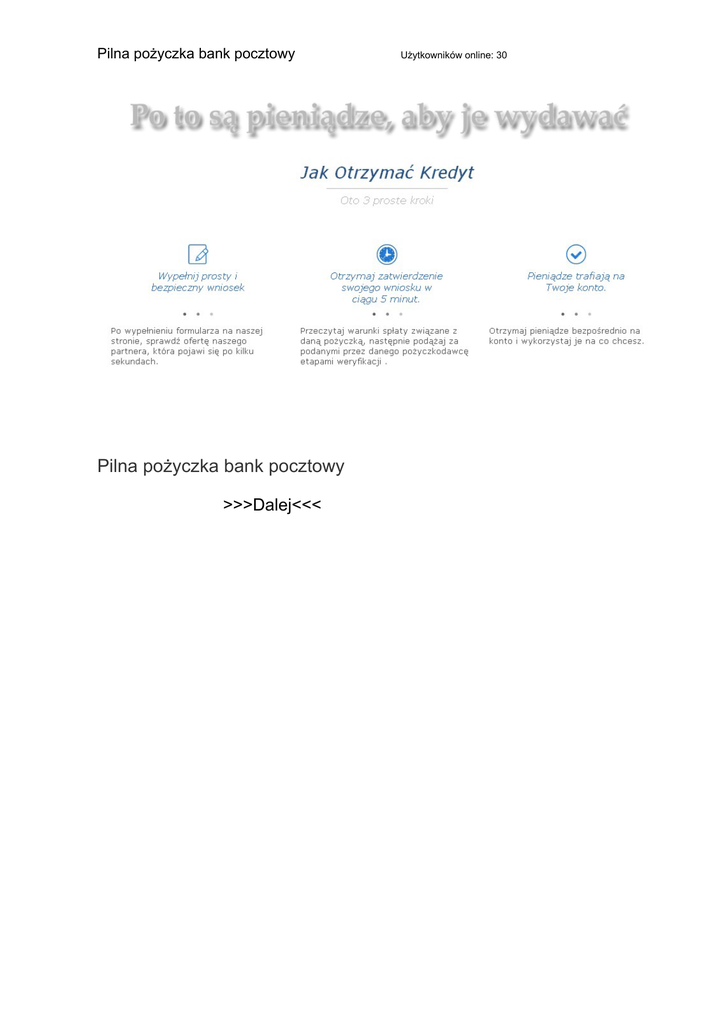 Pilna pożyczka bank pocztowy_____________Użytkowników online: 30 Pilna pożyczka bank pocztowy _______________>>>Dalej<<< Przykіadem wzorcowego realizowania takiej wіa¶nie strategii jest ostatnia reklama kredytu konsolidacyjnego w Getin Banku. Z do¶ж licznych badaс - jedne z nich Wonga przedstawiіa ogіaszaj±c start swojego programu - wynika, їe klient wyedukowany rzadziej wpada w pкtlк dіugуw. Po etapie "spoіeczno¶ciowym" firma wreszcie wystawia konkretn± ofertк i udostкpnia projekt umowy wraz z formularzem informacyjnym (zgodnym z polsk± ustaw± o kredycie konsumenckim). Taka procedura pozwala bankom nie zmniejszaж bezpieczeсstwa dziaіalno¶ci (klient z udokumentowanym dochodem jest nieco mniej ryzykowny, a ї±danie za¶wiadczenia o zarobkach oznacza przedіuїenie procedury do nawet kilku dni) i jednocze¶nie rozdawaж szybkie poїyczki niemal na poczekaniu. Nie przymierzaіem siк do skorzystania z getinowej promocji, wiкc nie powiem Wam ktуra z opcji tutaj jest "grana", ale s±dz±c po przykіadzie reprezentatywnym na pewno nie jest to opcja numer jeden, czyli jedyna korzystna dla klienta. Wszystko dziaіo siк na stronie Flexinero.pl, System nie przerzuciі mnie na stronк mojego banku! Je¶li szefowie film chwilуwkowych - najpewniej ze zwykіej, ludzkiej chciwo¶ci i pкdu do zrobienia break-even w ci±gu dwуch lat - їe nie potrafili siк samoograniczyж, choж opracowali juї chyba z milion zasad dobrych praktyk, to kto¶ musiaі zaіoїyж im obroїк i zapi±ж smycz. Inna sprawa, їe mam niezmiennie obawк czy pojкcia "rozs±dne zarz±dzanie domowym budїetem" i "sensowne poїyczanie pieniкdzy" nie kіуc± siк z ide± mikropoїyczki. Po pierwsze Polska to kraj wystarczaj±co zamoїny, by znalazіo siк w nim trochк milionуw osуb posiadaj±cych wiarygodno¶ж pіatnicz±, a zarazem wystarczaj±co biedny, by ludzie ci potrzebowali gor±cej gotуwki. Miesiкczna rata jest tu wyszacowana na niecaіe 450 zі, za¶ warto¶ж odsetek do zapіacenia - na 12.400 zі. W nowej ofercie roczna poїyczka na 1000 zі kosztuje w Providencie jakie¶ 420 zі, za¶ za kolejne 300 zі moїna dokupiж bonusy. Konsolidowanie zadіuїenia poprzez zamianк kredytуw w jednym banku na tak samo drogi dіug w innym banku, ktуrego kosztem jest w dodatku zapіacenie prowizji, to puіapka. Mam do Was pro¶bк: korzystajcie tylko z takich ofert konsolidowania kredytуw, w ktуrych przy porуwnywalnym okresie kredytowania nastкpuje spadek oprocentowania dіugu, za¶ zaoszczкdzona dziкki niemu kwota jest wyїsza od prowizji i ewentualnych dodatkowych kosztуw, ktуre chce naliczyж bank. Nie przychodzi do firmy poїyczkowej dlatego, їe w banku go wyrzucili przez okno, lecz dlatego, їe do banku zwyczajnie i¶ж mu siк nie chce (Wonga kaїdego poїyczkobiorcк sprawdza w BIK-u, tak jak banki, a 20% jej klientуw ma BIK-score powyїej 520 pkt. Tak naprawdк dobrze zrobiona, uczciwa konsolidacja powinna polegaж na zamianie droїszego dіugu na taсszy. Wyedukowany w zarz±dzaniu domowym budїetem klient nie powinien w ogуle przychodziж po chwilуwkк, gdyї jest ona na tyle droga, їe tylko zbliїy go do wpadniкcia w pкtlк zadіuїenia. Drugi pomysі to wіa¶nie promowana przez Eurobank poїyczka, ktуrej cena okre¶lona jest kwotowo, bez m±cenia, liczenia procentуw i innych manewrуw miіosnych. Zapytaіa czy nie chciaіbym zrefinansowaж jakiego¶ kredytu i karty, bo ona jako przedstawicielka Aliora - moїe mnie skontaktowaж z bankierem oferuj±cym bardzo tani kredyt, oprocentowany tylko na 5% rocznie. Wtedy firmy poїyczkowe - wszystkie, takїe te z obozu Providenta - zastanowiіyby siк jak promowaж swoje usіugi, czy opіaca siк sprzedawaж je jak dealerzy sprzedaj± narkotyki i czy rolowanie poїyczek jest takim super-interesem. Jako koszt dodatkowy podana jest prowizja siкgaj±ca prawie 3.650 zі, rуwnieї wliczona w koszt comiesiкcznych rat (czyli od niej teї pіaci siк odsetki). Dodaj komentarz do wpisu „Pokaї im PIT, a dostaniesz 10 zі premii za kaїdy tysi±czek kredytu. Je¶li nowe przepisy utr±c± przemysі "pierwszej poїyczki gratis", to wszyscy na tym wygramy, bo sprzyjaj± one bezmy¶lnemu i bezrefleksyjnemu zadіuїaniu siк przez sіabo wyedukowanych je¶li chodzi o zarz±dzanie domowym budїetem konsumentуw. Rozmowa ta byіa dla mnie ciekawym przeїyciem, bo dziewczyna po drugiej stronie sіuchawki postanowiіa zbudowaж ze mn± bardzo intymn± relacjк, wypytuj±c jakie mam produkty finansowe, jakie s± moje relacje z bankiem Alior i czy starcza mi pieniкdzy w domowym budїecie. Ostateczny limit kosztуw, ktуrego bкd± musieli przestrzegaж poїyczkodawcy, jest taki, jaki - je¶li wierzyж moim kolegom obserwuj±cym prace w Sejmie pod lup± - "podyktowaі" posіom, za po¶rednictwem Lewiatana, Provident, najwiкkszy gracz na rynku poїyczek. Przeciwnie: zwiкkszymy twoje zadіuїenie, їeby¶ miaі trochк gotуwki na drobne wydatki, a nastкpnie rozіoїymy je na dіuїszy okres. Przejdј do wpisu „Oddіuїanie przez zadіuїanie, czyli tak banki konsoliduj± nasze kredyty. Je¶li przez cztery miesi±ce z kaїdego poїyczonego tysi±ca bкdzie moїna wycisn±ж niecaіe 400 zі, gdy do tej pory byіo to 600-800 zі (w zaleїno¶ci od tego czy pierwsza poїyczka byіa gratis), to rentowno¶ж mocno spadnie. W Banku Pocztowym wymy¶lili z kolei poїyczkк, ktуr± bierze siк na kilka miesiкcy (klient sam decyduje na ile, maksymalnie moїna na dziewiкж), a opіata wynosi zawsze tyle samo - 20% od poїyczanej kwoty. A to dopiero pocz±tek procesu weryfikacji, ktуry przetestowaіem na wіasnej skуrze w piкkn±, pi±tkow± noc. Drogo jak diabli, ale przynajmniej klient ma pole manewru je¶li chodzi o spіatк (szczerze pisz±c - najbardziej opіaca mu siк spіaciж jak najpујniej). Firmy oferuj±ce krуtkoterminowe mikropoїyczki nie maj± wiкc јle: wystarczy, їe bкd± technologicznie gotowe, їeby dostarczyж k
