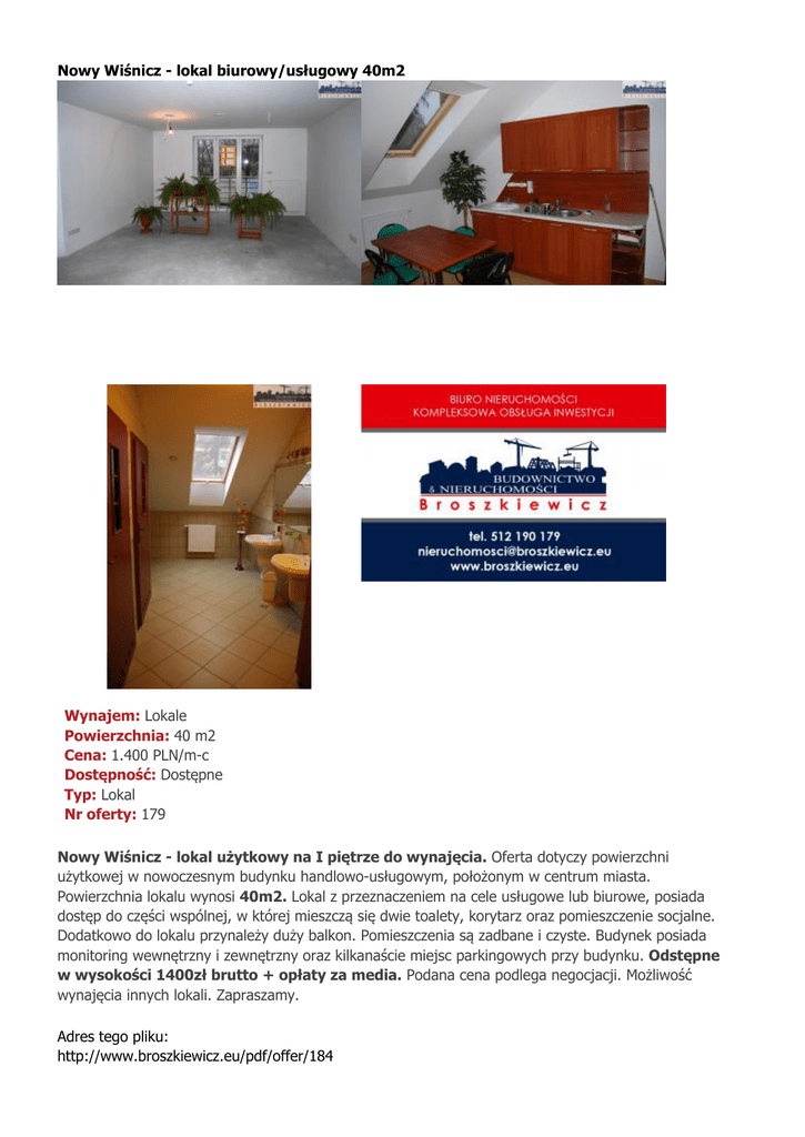 Nowy Wiśnicz - lokal biurowy/usługowy 40m2 Wynajem: Lokale Powierzchnia: 40 m2 Cena: 1.400 PLN/m-c Dostępność: Dostępne Typ: Lokal Nr oferty: 179 Nowy Wiśnicz - lokal użytkowy na I piętrze do wynajęcia. Oferta dotyczy powierzchni użytkowej w nowoczesnym budynku handlowo-usługowym, położonym w centrum miasta. Powierzchnia lokalu wynosi 40m2. Lokal z przeznaczeniem na cele usługowe lub biurowe, posiada dostęp do części wspólnej, w której mieszczą się dwie toalety, korytarz oraz pomieszczenie socjalne. Dodatkowo do lokalu przynależy duży balkon. Pomieszczenia są zadbane i czyste. Budynek posiada monitoring wewnętrzny i zewnętrzny oraz kilkanaście miejsc parkingowych przy budynku. Odstępne w wysokości 1400zł brutto + opłaty za media. Podana cena podlega negocjacji. Możliwość wynajęcia innych lokali. Zapraszamy. Adres tego pliku: http://www.broszkiewicz.eu/pdf/offer/184 Adres oferty na stronie: http://www.broszkiewicz.eu/site/offers/show/184/nowy-wisnicz-lokal-biurowy/uslugowy-40m2.html