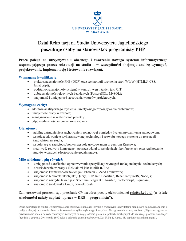 Dział Rekrutacji na Studia Uniwersytetu Jagiellońskiego poszukuje osoby na stanowisko: programisty PHP Praca polega na utrzymywaniu obecnego i tworzeniu nowego systemu informatycznego wspomagającego proces rekrutacji na studia – w szczególności obejmuje analizę wymagań, projektowanie, implementację i testowanie rozwiązań. Wymagane kwalifikacje: praktyczna znajomość PHP (OOP) oraz technologii tworzenia stron WWW (HTML5, CSS, JavaScript); podstawowa znajomość systemów kontroli wersji takich jak: GIT; dobra znajomość relacyjnych baz danych (PostgreSQL, MySQL); znajomość i umiejętność stosowania wzorców projektowych. Wymagane cechy: zdolność analitycznego myślenia i kreatywnego rozwiązywania problemów; umiejętność pracy w zespole; zaangażowanie w realizowane projekty; odpowiedzialność za powierzone zadania. Oferujemy: stabilne zatrudnienie z zachowaniem równowagi pomiędzy życiem prywatnym a zawodowym; współdecydowanie o wykorzystywanej technologii i rozwoju nowego systemu do rekrutacji kandydatów na studia; współpracę w sześcioosobowym zespole usytuowanym w centrum Krakowa; możliwość rozwoju kompetencji poprzez udział w szkoleniach i konferencjach oraz realizowanie studiów wyższych (dostosowanie godzin pracy). Mile widziane będą również: umiejętność określania i opracowywania specyfikacji wymagań funkcjonalnych i technicznych; doświadczenie w pracy z IDE takimi jak: IntelliJ IDEA; znajomość Frameworków takich jak: Phalcon 2, Zend Framework; znajomość bibliotek takich jak: jQuery, PHPUnit, Bootstrap, React, RequireJS, Node.js; znajomość narzędzi takich jak: Selenium, Vagrant + Ansible, CoffeeScript, Liquibase; znajomość środowiska Linux, powłoki bash. Zainteresowani proszeni są o przesłanie CV na adres poczty elektronicznej [email protected] (w tytule wiadomości należy napisać: „praca w DRS —programista”). Dział Rekrutacji na Studia UJ zastrzega sobie możliwość kontaktu jedynie z wybranymi kandydatami oraz prawo do powiadomienia o podjętej decyzji w sprawie obsadzenia stanowiska tylko wybranego kandydata. Na zgłoszeniu należy dopisać: „Wyrażam zgodę na przetwarzanie moich danych osobowych zawartych w mojej ofercie pracy dla potrzeb niezbędnych do realizacji procesu rekrutacji” (zgodnie z ustawą z 29 sierpnia 1997 roku o ochronie danych osobowych, Dz. U. Nr 133, poz. 883 z późniejszymi zmianami).