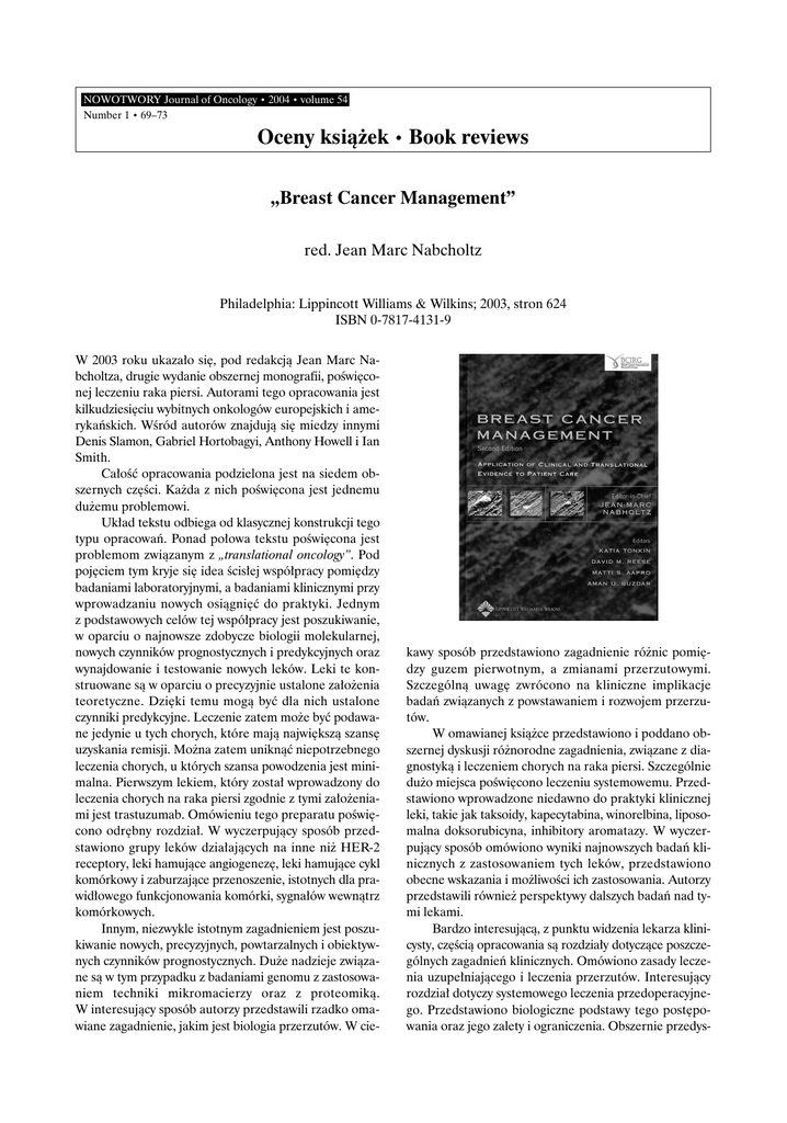 NOWOTWORY Journal of Oncology • 2004 • volume 54 Number 1 • 69–73 Oceny ksià˝ek • Book reviews „Breast Cancer Management” red. Jean Marc Nabcholtz Philadelphia: Lippincott Williams & Wilkins; 2003, stron 624 ISBN 0-7817-4131-9 W 2003 roku ukaza∏o si´, pod redakcjà Jean Marc Nabcholtza, drugie wydanie obszernej monografii, poÊwi´conej leczeniu raka piersi. Autorami tego opracowania jest kilkudziesi´ciu wybitnych onkologów europejskich i amerykaƒskich. WÊród autorów znajdujà si´ miedzy innymi Denis Slamon, Gabriel Hortobagyi, Anthony Howell i Ian Smith. Ca∏oÊç opracowania podzielona jest na siedem obszernych cz´Êci. Ka˝da z nich poÊwi´cona jest jednemu du˝emu problemowi. Uk∏ad tekstu odbiega od klasycznej konstrukcji tego typu opracowaƒ. Ponad po∏owa tekstu poÊwi´cona jest problemom zwiàzanym z „translational oncology”. Pod poj´ciem tym kryje si´ idea Êcis∏ej wspó∏pracy pomi´dzy badaniami laboratoryjnymi, a badaniami klinicznymi przy wprowadzaniu nowych osiàgni´ç do praktyki. Jednym z podstawowych celów tej wspó∏pracy jest poszukiwanie, w oparciu o najnowsze zdobycze biologii molekularnej, nowych czynników prognostycznych i predykcyjnych oraz wynajdowanie i testowanie nowych leków. Leki te konstruowane sà w oparciu o precyzyjnie ustalone za∏o˝enia teoretyczne. Dzi´ki temu mogà byç dla nich ustalone czynniki predykcyjne. Leczenie zatem mo˝e byç podawane jedynie u tych chorych, które majà najwi´kszà szans´ uzyskania remisji. Mo˝na zatem uniknàç niepotrzebnego leczenia chorych, u których szansa powodzenia jest minimalna. Pierwszym lekiem, który zosta∏ wprowadzony do leczenia chorych na raka piersi zgodnie z tymi za∏o˝eniami jest trastuzumab. Omówieniu tego preparatu poÊwi´cono odr´bny rozdzia∏. W wyczerpujàcy sposób przedstawiono grupy leków dzia∏ajàcych na inne ni˝ HER-2 receptory, leki hamujàce angiogenez´, leki hamujàce cykl komórkowy i zaburzajàce przenoszenie, istotnych dla prawid∏owego funkcjonowania komórki, sygna∏ów wewnàtrz komórkowych. Innym, niezwykle istotnym zagadnieniem jest poszukiwanie nowych, precyzyjnych, powtarzalnych i obiektywnych czynników prognostycznych. Du˝e nadzieje zwiàzane sà w tym przypadku z badaniami genomu z zastosowaniem techniki mikromacierzy oraz z proteomikà. W interesujàcy sposób autorzy przedstawili rzadko omawiane zagadnienie, jakim jest biologia przerzutów. W cie- kawy sposób przedstawiono zagadnienie ró˝nic pomi´dzy guzem pierwotnym, a zmianami przerzutowymi. Szczególnà uwag´ zwrócono na kliniczne implikacje badaƒ zwiàzanych z powstawaniem i rozwojem przerzutów. W omawianej ksià˝ce przedstawiono i poddano obszernej dyskusji ró˝norodne zagadnienia, zwiàzane z diagnostykà i leczeniem chorych na raka piersi. Szczególnie du˝o miejsca poÊwi´cono leczeniu systemowemu. Przedstawiono wprowadzone niedawno do praktyki klinicznej leki, takie jak taksoidy, kapecytabina, winorelbina, liposomalna doksorubicyna, inhibitory aromatazy. W wyczerpujàcy sposób omówiono wyniki najnowszych badaƒ klinicznych z zastosowaniem tych leków, przedstawiono obecne wskazania i mo˝liwoÊci ich zastosowania. Autorzy przedstawili równie˝ perspektywy dalszych badaƒ nad tymi lekami. Bardzo interesujàcà, z punktu widzenia lekarza klinicysty, cz´Êcià opracowania sà rozdzia∏y dotyczàce poszczególnych zagadnieƒ klinicznych. Omówiono zasady leczenia uzupe∏niajàcego i leczenia przerzutów. Interesujàcy rozdzia∏ dotyczy systemowego leczenia przedoperacyjnego. Przedstawiono biologiczne podstawy tego post´powania oraz jego zalety i ograniczenia. Obszernie przedys- 70 kutowano zagadnienia zwiàzane ze stosowaniem w codziennej praktyce koniecznej procedury identyfikowania i usuwania w´z∏a ch∏onnego wartowniczego. Autorzy podkreÊlajà znaczenie doÊwiadczenia poszczególnych zespo∏ów dla prawid∏owego wykonania tej procedury. Odr´bne rozdzia∏y poÊwi´cono zagadnieniom zwiàzanym ze stosowaniem hemopoetycznych czynników wzrostu oraz profilaktyce wymiotów i post´powaniu w przypadku nowotworowych owrzodzeƒ skóry. W du˝ej, odr´bnej cz´Êci omówiono problem badaƒ klinicznych. Przedstawiono histori´ wprowadzania badaƒ klinicznych oraz wspó∏czesne zasady ich prowadzenia. Du˝o uwagi autorzy poÊwi´cili zagadnieniom wprowadzania wyników badaƒ klinicznych do praktyki klinicznej oraz problemowi tworzenia rekomendacji i zaleceƒ. W opracowaniu podj´to równie˝ trud przybli˝enia czytelnikom zagadnieƒ zwiàzanych z analizà kosztów leczenia i jej znaczeniem dla codziennej praktyki klinicznej. Do jednego z najbardziej interesujàcych rozdzia∏ów opracowania nale˝y zaliczyç rozdzia∏ poÊwi´cony alternatywnym, innym ni˝ zalecane przez akademickà medycyn´, metodom leczenia. Zagadnienie to bardzo rzadko jest poruszane w czasie zjazdów czy sesji naukowych, rzadko jest te˝ przedmiotem opracowaƒ. Jest to o tyle dziwne, ˝e wszyscy onkolodzy stykajà si´ z tym zagadnieniem w codziennej praktyce klinicznej. Omówione zosta∏y przyczyny stosowania przez pacjentów metod nieuznawanych przez oficjalnà medycyn´. Omówiono poszczególne metody leczenia alternatywnego. Autorzy zwracajà uwag´ na powszechnoÊç stosowania metod medycyny alternatywnej i ogromne wydatki zwiàzane z jej stosowaniem. Istnieje równie˝ niebezpieczeƒstwo zwiàzane ze stosowaniem preparatów o nieznanym sk∏adzie i mechanizmie dzia∏ania. Jak wynika z opracowania amerykaƒskie towa- rzystwa naukowe i instytucje akademickie uruchomi∏y telefoniczne i internetowe banki informacji o alternatywnych metodach leczenia. Podr´cznik zakoƒczony jest krótkim rozdzia∏em o ogólnym znaczeniu. PoÊwi´cony jest on rozwa˝aniom dotyczàcym zasad pojmowania medycyny jako nauki. Podstawowe znaczenie dla medycyny koƒca XIX i ca∏ego XX wieku wywar∏y prace Virchowa. Dla rozwoju onkologii mia∏y one fundamentalne znaczenie. Po dzi