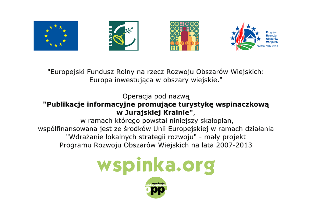 DZIEWCZYNKA Dziewczynka KRAKÓW Map data © OpenStreetMap contributors SKAŁA OLKUSZ Od Krakowa jedziemy szosą nr 94 na Olkusz. Za miejscowością Czajowice skręcamy na Szklary i do centrum Jerzmanowic a następnie po 0,8 km skręcamy w prawo w pierwszą boczną asfaltową drogę. Przejeżdżamy jeszcze 270 metrów i osiągamy Urząd Gminy w Jerzmanowicach, położony po prawej na niewielkim wzniesieniu. Przy nim parkujemy samochód. Jadąc od strony Katowic i Olkusza skręcamy w prawo w Jerzmanowicach na Szklary i dalej tak samo. Odległości od centrum: Katowic – 64 km, Krakowa – 24 km, Olkusza – 20 km Koordynaty geograficzne: parking - Urząd Gminy Jerzmanowice 50º12’52.6’’N, 19º44’46.3’’E (50.214624, 19.746189) Dziewczynka 50º12’23.8’’N, 19º43’33.5’’E (50.206607, 19.725979) Czajowice, WIELKA WIEŚ Bolechowice KRZESZOWICE Z parkingu kierujemy się do Słonecznych Skał zgodnie z opisem i szczegółową mapą, które znajdują się na następnej stronie. ZABIERZÓW ZABIERZÓW Parkowanie samochodów przy asfaltowej drodze w pobliżu skał powoduje konflikty z mieszkańcami i bardzo często jest niezgodne z przepisami ruchu drogowego. Należy liczyć się z możliwością otrzymania mandatu! SŁONECZNE SKAŁY OLKUSZ, KRAKÓW Szklary, KRZESZOWICE Niewielka wapienna turniczka nazwana Dziewczynka sąsiaduje z Ostatnią i oferuje 4 linie posiadające kompletną stałą asekurację. Wysokość skały nie przekracza 14 metrów a mocno nasłoneczniona ściana z drogami ma wystawę północno-zachodnią. Map data © OpenStreetMap contributors Dziewczynka 4 1 2 3 1. Korba VI+/1 (4R+StZ) 2. Dziewczynka z Okapem na Przedzie VI.2 (4R+StZ) 3. Dziewczynka z Pazurkami VI.1+ (6R+StZ) 4. Szklanka VI (3R+StZ)