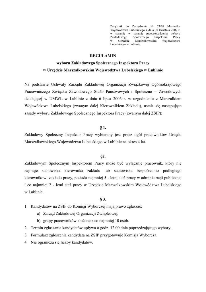 Załącznik do Zarządzenia Nr 73/09 Marszałka Województwa Lubelskiego z dnia 30 kwietnia 2009 r. w sprawie w sprawie przeprowadzenia wyboru Zakładowego Społecznego Inspektora Pracy w Urzędzie Marszałkowskim Województwa Lubelskiego w Lublinie. REGULAMIN wyboru Zakładowego Społecznego Inspektora Pracy w Urzędzie Marszałkowskim Województwa Lubelskiego w Lublinie Na podstawie Uchwały Zarządu Zakładowej Organizacji Związkowej Ogólnokrajowego Pracowniczego Związku Zawodowego SłuŜb Państwowych i Społeczno – Zawodowych działającej w UMWL w Lublinie z dnia 6 lipca 2006 r. w uzgodnieniu z Marszałkiem Województwa Lubelskiego (zwanym dalej Kierownikiem Zakładu), ustala się następujące zasady wyboru Zakładowego Społecznego Inspektora Pracy (zwanym dalej ZSIP): § 1. Zakładowy Społeczny Inspektor Pracy wybierany jest przez ogół pracowników Urzędu Marszałkowskiego Województwa Lubelskiego w Lublinie na okres 4 lat. §2. Zakładowym Społecznym Inspektorem Pracy moŜe być wyłącznie pracownik, który nie zajmuje stanowiska kierownika zakładu lub stanowiska bezpośrednio podległego kierownikowi zakładu pracy, posiada najmniej 5 - letni staŜ pracy w administracji publicznej i co najmniej 2 - letni staŜ pracy w Urzędzie Marszałkowskim Województwa Lubelskiego w Lublinie. § 3. 1. Kandydatów na ZSIP do Komisji Wyborczej mają prawo zgłaszać: a) Zarząd Zakładowej Organizacji Związkowej, b) grupy pracowników złoŜone z co najmniej 10 osób. 2. Termin zgłaszania kandydatów upływa o godz. 12.00 dnia poprzedzającego wybory. 3. Formularz zgłoszenia kandydata na ZSIP przygotowuje Komisja Wyborcza. 4. Nie ogranicza się liczby kandydatów. § 4. 1. W celu przygotowania i przeprowadzenia wyborów zakładowego społecznego inspektora pracy, Marszałek w porozumieniu z zakładową organizacją związkową powołuje komisję wyborczą. 2. Komisja Wyborcza pracuje w pokoju nr 35 budynku Urzędu przy ul. Spokojnej 4 w Lublinie. 1. Do zadań komisji wyborczej naleŜy: a) wywieszenie na tablicy ogłoszeń informacji o powołaniu komisji wyborczej, b) wywieszenie regulaminu wyborów na tablicy ogłoszeń, c) przyjmowanie zgłoszeń kandydatów na ZSIP, d) wywieszenie na tablicy ogłoszeń, nie później niŜ na 7 dni przed wyborami, listy zgłoszonych kandydatów, e) przygotowanie listy obecności pracowników, f) przygotowanie kart do głosowania, g) pisemne powiadomienie kierownika zakładu pracy o wyborze ZSIP, h) zabezpieczenie dokumentów z zebrania, w tym kart do głosowania i przekazanie ich zakładowej organizacji związkowej. § 5. 1. Wybory zakładowego społecznego inspektora pracy odbywają się w trybie tajnym i bezpośrednim. 2. Czynne prawo wyborcze przysługuje kaŜdemu pracownikowi Urzędu Marszałkowskiego Województwa Lubelskiego w Lublinie, bez względu na rodzaj zawartej umowy o pracę oraz bez względu na staŜ pracy w zakładzie. 3. Bierne prawo wyborcze przysługuje pracownikowi spełniającemu przesłanki określone w § 2. 4. Głosuje się za pomocą karty do głosowania z zamieszczonymi w porządku alfabetycznym nazwiskami kandydatów, stawiając znak X przy wybranym nazwisku. 5. Głos uznaje się za niewaŜny w przypadku, gdy na karcie postawiono więcej niŜ jeden znak X przy nazwisku kandydata lub nie postawiono Ŝadnego. 6. Osoba głosująca potwierdza fakt głosowania podpisem na liście pracowników UMWL. 7. Akt głosowania odbywa się poprzez wrzucenie głosu do opieczętowanej urny obnoszonej przez członków Komisji Wyborczej po wszystkich stanowiskach pracy w dniach wyznaczonych na przeprowadzenie wyborów. Załącznik do Zarządzenia Nr 73/09 Marszałka Województwa Lubelskiego z dnia 30 kwietnia 2009 r. w sprawie przeprowadzenia wyboru Zakładowego Społecznego Inspektora Pracy w Urzędzie Marszałkowskim Województwa Lubelskiego w Lublinie. Strona 2 z 3 § 6. Zakładowym Społecznym Inspektorem Pracy zostaje wybrana osoba, która otrzymała największą ilość waŜnie oddanych głosów, bez względu na ilość osób głosujących spośród uprawnionych do głosowania. W przypadku równej ilości głosów ogłasza się dodatkową rundę wyborczą, przy czym na liście znajdują się kandydaci, którzy uzyskali najwyŜszą równą liczbę głosów. Wyniki głosowania dokumentuje się protokołem Komisji Wyborczej i załączonymi kartkami wyborczymi. § 7. Wyniki wyborów ogłasza się 7 dni od daty przeprowadzonych wyborów przez wywieszenie w zakładowych tablicach ogłoszeń protokołu Komisji Wyborczej oraz zawiadomienie Kierownika Zakładu. Za Zarząd Zakładowej Organizacji Związkowej OPZZSPiS-Z w UMWL w Lublinie /-/ Jan Biss Lublin, dnia 03.04.2009 r. Załącznik do Zarządzenia Nr 73/09 Marszałka Województwa Lubelskiego z dnia 30 kwietnia 2009 r. w sprawie przeprowadzenia wyboru Zakładowego Społecznego Inspektora Pracy w Urzędzie Marszałkowskim Województwa Lubelskiego w Lublinie. Strona 3 z 3