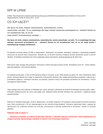 KPP W LIPNIE Źródło: http://www.lipno.kujawsko-pomorska.policja.gov.pl/k36/informacje/wiadomosci/14185,Co-ich-laczy.html Wygenerowano: Środa, 8 marca 2017, 12:34 CO ICH ŁĄCZY? Nie łączy ich wiek, miejsce zamieszkania, wykształcenie, marka samochodu, ani płeć. To co wspólnego dla tego rodzaju sprawców przestępstw to - alkohol! Działa na ich świadomość tak, że za nic mają skutki i konsekwencje swojego ... Nie łączy ich wiek, miejsce zamieszkania, wykształcenie, marka samochodu, ani płeć. To co wspólnego dla tego rodzaju sprawców przestępstw to - alkohol! Działa na ich świadomość tak, że za nic mają skutki i konsekwencje swojego zachowania. Po południu minionej soboty (12.09) w miejscowości Kolankowo, na krajowej „dziesiątce’ policjanci z lipnowskiej drogówki zatrzymali do kontroli fiata cinquecento. Okazało się, że 44-letni kierowca znajduje się pod działaniem ponad 3 promili alkoholu. W dodatku prowadził auto mimo sądowego zakazu kierowania, obowiązującego go do 2013 roku. Wieczorem tego samego dnia policjanci zatrzymali w Kikole kierującą toyotą corolla. Prowadząca auto 35 – letnia kobieta, była pod wpływem 1,62 promila alkoholu. W niedzielę przed godz. 17:00 (13.09) sprawcą kolizji w Trutowie, w gm. Kikół okazał się pijany 49 –letni mieszkaniec tejże gminy. Kierował deawoo tico mając w organizmie 2,28 promila alkoholu. Nie ustąpił pierwszeństwa przejazdu i zderzył się z prawidłowo jadącym, trzeźwym kierowcą vw passata. Sprawca kolizji nie posiadał uprawnień do kierowania i innych wymaganych dokumentów. Tego samego dnia nieco później w Chlebowie gm. Lipno, policjanci zatrzymali do kontroli 34-letniego kierowcę golfa „trójki”. Prowadził niedopuszczone do ruchu auto będąc pod wpływem blisko promila alkoholu, bez uprawnień i zapiętych pasów bezpieczeństwa. Również w niedzielę około godz. 21:00 w Radomicach, na drodze krajowej nr 67 policjanci zatrzymywali do kontroli kierowcę audi, który przekroczył o 70 km obowiązującą na tym odcinku drogi prędkość. Kierowca zignorował znaki i sygnały do zatrzymania się, próbował ratować się ucieczką. Zatrzymany w pościgu wydmuchał w alcosensor ponad 1,5 promila alkoholu. Policjanci biją na alarm !!! Powyższe przykłady są jedynie przekrojem zdarzeń z udziałem pijanych kierowców, które odnotowano na drogach powiatu lipnowskiego, zaledwie w trakcie 2 dni minionego weekendu. Autor: red1.kppl Publikacja: red1.kppl Ocena: 0/5 (0) Tweetnij