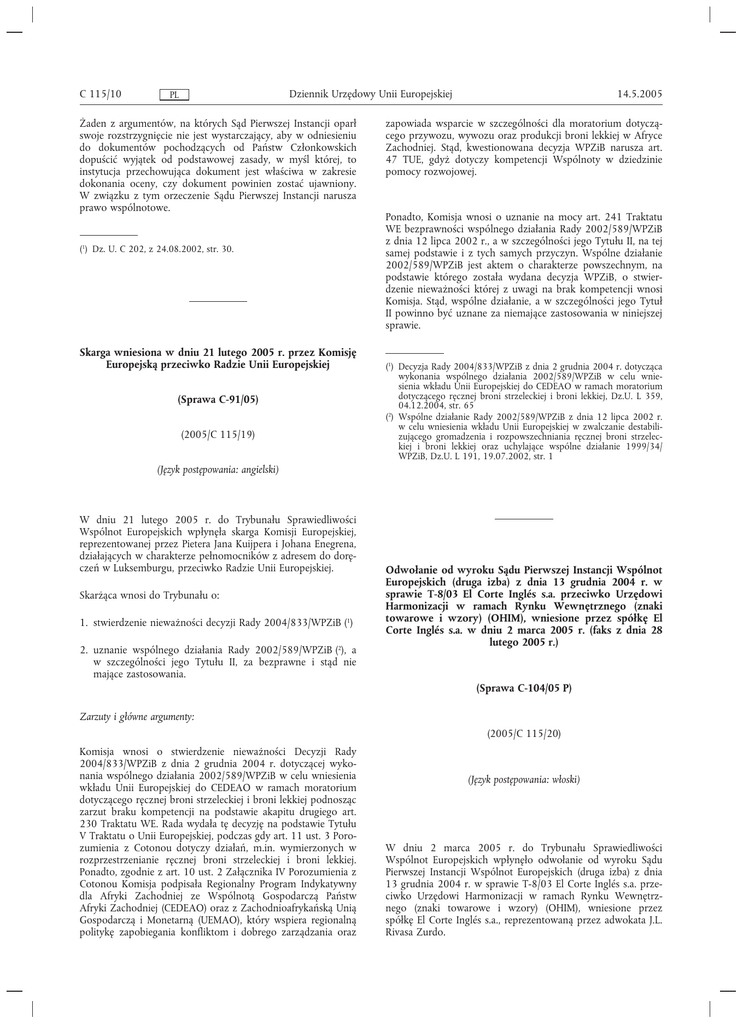 C 115/10 Dziennik Urzędowy Unii Europejskiej PL Żaden z argumentów, na których Sąd Pierwszej Instancji oparł swoje rozstrzygnięcie nie jest wystarczający, aby w odniesieniu do dokumentów pochodzących od Państw Członkowskich dopuścić wyjątek od podstawowej zasady, w myśl której, to instytucja przechowująca dokument jest właściwa w zakresie dokonania oceny, czy dokument powinien zostać ujawniony. W związku z tym orzeczenie Sądu Pierwszej Instancji narusza prawo wspólnotowe. (1) Dz. U. C 202, z 24.08.2002, str. 30. Skarga wniesiona w dniu 21 lutego 2005 r. przez Komisję Europejską przeciwko Radzie Unii Europejskiej (Sprawa C-91/05) (2005/C 115/19) 14.5.2005 zapowiada wsparcie w szczególności dla moratorium dotyczącego przywozu, wywozu oraz produkcji broni lekkiej w Afryce Zachodniej. Stąd, kwestionowana decyzja WPZiB narusza art. 47 TUE, gdyż dotyczy kompetencji Wspólnoty w dziedzinie pomocy rozwojowej. Ponadto, Komisja wnosi o uznanie na mocy art. 241 Traktatu WE bezprawności wspólnego działania Rady 2002/589/WPZiB z dnia 12 lipca 2002 r., a w szczególności jego Tytułu II, na tej samej podstawie i z tych samych przyczyn. Wspólne działanie 2002/589/WPZiB jest aktem o charakterze powszechnym, na podstawie którego została wydana decyzja WPZiB, o stwierdzenie nieważności której z uwagi na brak kompetencji wnosi Komisja. Stąd, wspólne działanie, a w szczególności jego Tytuł II powinno być uznane za niemające zastosowania w niniejszej sprawie. (1) Decyzja Rady 2004/833/WPZiB z dnia 2 grudnia 2004 r. dotycząca wykonania wspólnego działania 2002/589/WPZiB w celu wniesienia wkładu Unii Europejskiej do CEDEAO w ramach moratorium dotyczącego ręcznej broni strzeleckiej i broni lekkiej, Dz.U. L 359, 04.12.2004, str. 65 (2) Wspólne działanie Rady 2002/589/WPZiB z dnia 12 lipca 2002 r. w celu wniesienia wkładu Unii Europejskiej w zwalczanie destabilizującego gromadzenia i rozpowszechniania ręcznej broni strzeleckiej i broni lekkiej oraz uchylające wspólne działanie 1999/34/ WPZiB, Dz.U. L 191, 19.07.2002, str. 1 (Język postępowania: angielski) W dniu 21 lutego 2005 r. do Trybunału Sprawiedliwości Wspólnot Europejskich wpłynęła skarga Komisji Europejskiej, reprezentowanej przez Pietera Jana Kuijpera i Johana Enegrena, działających w charakterze pełnomocników z adresem do doręczeń w Luksemburgu, przeciwko Radzie Unii Europejskiej. Skarżąca wnosi do Trybunału o: 1. stwierdzenie nieważności decyzji Rady 2004/833/WPZiB (1) 2. uznanie wspólnego działania Rady 2002/589/WPZiB (2), a w szczególności jego Tytułu II, za bezprawne i stąd nie mające zastosowania. Odwołanie od wyroku Sądu Pierwszej Instancji Wspólnot Europejskich (druga izba) z dnia 13 grudnia 2004 r. w sprawie T-8/03 El Corte Inglés s.a. przeciwko Urzędowi Harmonizacji w ramach Rynku Wewnętrznego (znaki towarowe i wzory) (OHIM), wniesione przez spółkę El Corte Inglés s.a. w dniu 2 marca 2005 r. (faks z dnia 28 lutego 2005 r.) (Sprawa C-104/05 P) Zarzuty i główne argumenty: (2005/C 115/20) Komisja wnosi o stwierdzenie nieważności Decyzji Rady 2004/833/WPZiB z dnia 2 grudnia 2004 r. dotyczącej wykonania wspólnego działania 2002/589/WPZiB w celu wniesienia wkładu Unii Europejskiej do CEDEAO w ramach moratorium dotyczącego ręcznej broni strzeleckiej i broni lekkiej podnosząc zarzut braku kompetencji na podstawie akapitu drugiego art. 230 Traktatu WE. Rada wydała tę decyzję na podstawie Tytułu V Traktatu o Unii Europejskiej, podczas gdy art. 11 ust. 3 Porozumienia z Cotonou dotyczy działań, m.in. wymierzonych w rozprzestrzenianie ręcznej broni strzeleckiej i broni lekkiej. Ponadto, zgodnie z art. 10 ust. 2 Załącznika IV Porozumienia z Cotonou Komisja podpisała Regionalny Program Indykatywny dla Afryki Zachodniej ze Wspólnotą Gospodarczą Państw Afryki Zachodniej (CEDEAO) oraz z Zachodnioafrykańską Unią Gospodarczą i Monetarną (UEMAO), który wspiera regionalną politykę zapobiegania konfliktom i dobrego zarządzania oraz (Język postępowania: włoski) W dniu 2 marca 2005 r. do Trybunału Sprawiedliwości Wspólnot Europejskich wpłynęło odwołanie od wyroku Sądu Pierwszej Instancji Wspólnot Europejskich (druga izba) z dnia 13 grudnia 2004 r. w sprawie T-8/03 El Corte Inglés s.a. przeciwko Urzędowi Harmonizacji w ramach Rynku Wewnętrznego (znaki towarowe i wzory) (OHIM), wniesione przez spółkę El Corte Inglés s.a., reprezentowaną przez adwokata J.L. Rivasa Zurdo.