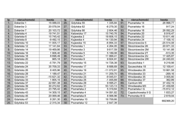 lp. 1. 2. 3. 4. 5. 6. 7. 8. 9. 10. 11. 12. 13. 14. 15. 16. 17. 18. 19. 20. 21. 22. 23. 24. 25. nieruchomość Dokerów 1 Dokerów 3 Dokerów 7 Gdańska 4 Gdańska 6 Gdańska 8 Gdańska 10 Gdańska 12 Gdańska 14 Gdańska 16 Gdańska 18 Gdańska 20 Gdańska 22 Gdańska 24 Gdańska 26 Gdańska 28 Gdańska 31 Gdańska 33 Gdańska 37 Gdańska 39 Gdańska 41 Gdańska 43 Gdańska 45 Gdańska 47 Gdyńska 53 kwota 15 088,03 20 078,04 20 103,72 19 741,51 15 745,42 -9 492,15 11 005,17 17 141,64 19 469,86 1 906,40 8 698,49 965,18 -5 781,79 35 709,33 8 405,96 1 189,47 -15 621,32 1 805,15 22 691,38 30 272,62 23 795,42 14 309,15 20 069,46 8 261,30 -2 315,34 lp. 26. 27. 28. 29. 30. 31. 32. 33. 34. 35. 36. 37. 38. 39. 40. 41. 42. 43. 44. 45. 46. 47. 48. 49. 50 nieruchomość Gdyńska 55 Gdyńska 62 Gdyńska 66 Katowicka 17 Kujawska 2 Kujawska 4 Kujawska 15 Pomorska 1 Pomorska 3 Pomorska 5 Pomorska 7 Pomorska 9 Pomorska 15 Pomorska 17 Pomorska 19 Pomorska 21 Pomorska 23 Pomorska 25 Pomorska 29 Pomorska 31 Poznańska 2 Poznańska 4 Poznańska 8 Poznańska 10 Poznańska 12 kwota 1 335,84 -8 279,35 2 604,46 15 740,76 18 606,15 14 130,94 -6 894,33 4 264,05 9 617,59 5 189,08 11 999,41 9 824,91 14 726,38 8 688,69 -11 072,81 11 259,70 -9 045,51 -1 455,69 9 595,21 53 123,13 5 319,64 14 091,82 8 566,98 18 759,66 2 647,39 lp. 51. 52. 53. 54. 55. 56. 57. 58. 59. 60. 61. 62. 63. 64. 65. 66. 67. 68. 69. 70. 71. 72. 73. nieruchomość Poznańska 14 Poznańska 16 Poznańska 18 Poznańska 20 Poznańska 22 Poznańska 24 Stoczniowców 5 Stoczniowców 2K Stoczniowców 2M Stoczniowców 2T Stoczniowców 2U Stoczniowców 2W Szczecińska 1 Szczecińska 18 Wrocławska 28 Wrocławska 33 Wrocławska 35 Wrocławska 37 Centrum M2 Wrocławska M3 Poznańska I G Częstochowska II G Pomorska III G kwota 26 998,77 917,24 26 092,29 8 916,47 10 611,49 -7 108,10 -25 514,08 20 971,33 10 141,88 -513,35 17 425,87 24 240,83 9 218,98 12 109,41 10 661,58 -269,16 3 005,60 362,89 37 432,19 21 439,68 -15 812,12 1 833,27 2 619,04 682368,20