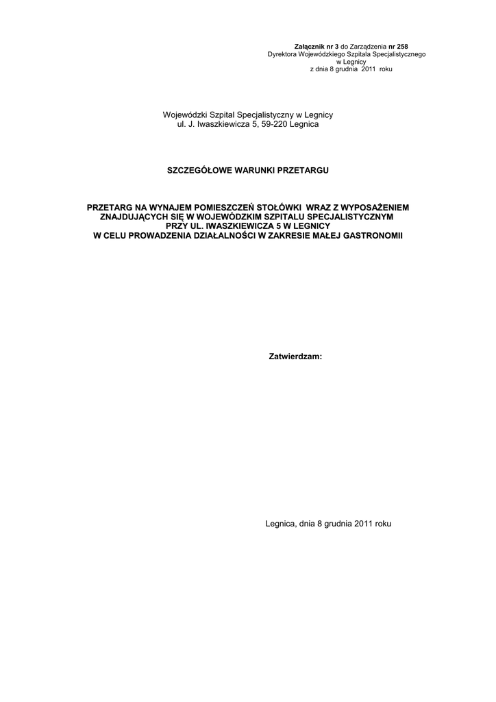 Załącznik nr 3 do Zarządzenia nr 258 Dyrektora Wojewódzkiego Szpitala Specjalistycznego w Legnicy z dnia 8 grudnia 2011 roku Wojewódzki Szpital Specjalistyczny w Legnicy ul. J. Iwaszkiewicza 5, 59-220 Legnica SZCZEGÓŁOWE WARUNKI PRZETARGU PRZETARG NA WYNAJEM POMIESZCZEŃ STOŁÓWKI WRAZ Z WYPOSAŻENIEM ZNAJDUJĄCYCH SIĘ W WOJEWÓDZKIM SZPITALU SPECJALISTYCZNYM PRZY UL. IWASZKIEWICZA 5 W LEGNICY W CELU PROWADZENIA DZIAŁALNOŚCI W ZAKRESIE MAŁEJ GASTRONOMII Zatwierdzam: Legnica, dnia 8 grudnia 2011 roku Szczegółowe warunki przetargu zostały ustalone na podstawie Regulaminu przetargu na wynajem pomieszczeń o łącznej powierzchni 191, 86 m 2 Wojewódzkiego Szpitala Specjalistycznego w celu prowadzenia działalności w zakresie małej gastronomii zatwierdzonego Uchwałą nr 138/II/03 z dnia 26 marca 2003 roku, Zarządu Województwa Dolnośląskiego. W przetargu mogą brać udział osoby prawne, fizyczne oraz jednostki organizacyjne nie posiadające osobowości prawnej uprawnione do prowadzenia działalności gospodarczej, które złożą ofertę spełniającą warunki zawarte w szczegółowych warunkach przetargu oraz wpłacą organizatorowi przetargu wadium w terminie i miejscu wyznaczonym w niniejszych szczegółowych warunkach przetargu oraz ogłoszeniu o przetargu. I. PRZEDMIOT PRZETARGU 1. Przedmiotem przetargu jest wynajem pomieszczeń stołówki o łącznej powierzchni 141,26 m2 wraz z mieniem ruchomym w celu prowadzenia działalności w zakresie małej gastronomii. 2. Pomieszczenie przeznaczone pod wynajem znajduje się w budynku 1A /poziom -1/ Wojewódzkiego Szpitala Specjalistycznego w Legnicy przy ul. Iwaszkiewicza 5 w Legnicy – plan sytuacyjny pomieszczeń oraz wykaz pomieszczeń stanowi załącznik nr 1 do SWP. 3. Organizator przetargu ustala cenę wywoławczą minimalną – 25,00 zł netto za 1 m2 wynajmowanej powierzchni, 4. Wykaz mienia ruchomego stanowi załącznik nr 2 do SWP. Za wynajem wyposażenia ustala się kwotę w wysokości 721,82 zł netto miesięcznie i nie podlega ona ocenie oferty. Istnieje możliwość rezygnacji z wynajmowanego sprzętu w trakcie trwania umowy. W przypadku rezygnacji z najmu mienia przed podpisaniem umowy, Najemca obowiązany jest poinformować Organizatora przetargu w złożonej ofercie podając jednocześnie wykaz swojego sprzętu. 5. Sprzęt użytkowany w wynajętym pomieszczeniu nie może zakłócać pracy urządzeń oraz sprzętu zainstalowanego w Szpitalu. 6. Wynajmujący nie dopuszcza składania ofert częściowych. II. PRZYGOTOWANIE OFERTY Oferent ma prawo złożyć tylko jedną ofertę. Ofertę należy sporządzić w języku polskim zgodnie ze szczegółowymi warunkami przetargu, w formie maszynopisu lub druku i uzupełnić wymaganymi załącznikami. Oferta musi być podpisana przy imiennych pieczątkach osób upoważnionych do reprezentowania oferenta wymienionych w rejestrze handlowym lub innym odpowiednim dokumencie, upoważniającym do reprezentowania. Kompletna oferta, łącznie z załącznikami, powinna mieć ponumerowane i parafowane strony. Wszystkie strony oferty muszą być spięte /zszyte/ we właściwej kolejności w sposób zapobiegający dekompletacji oferty. Wszelkie poprawki lub zmiany w tekście muszą być parafowane i datowane własnoręcznie przez osobę podpisującą ofertę. Oferty należy składać w nieprzejrzystych, zamkniętych kopertach lub opakowaniach. Koperta powinna być opatrzona napisem: WOJEWÓDZKI SZPITAL SPECJALISTYCZNY W LEGNICY PRZETARG NA WYNAJEM POMIESZCZENIA STOŁÓWKI W ZAKRESIE MAŁEJ GASTRONOMII - NIE OTWIERAĆ PRZED DNIEM 19 GRUDNIA 2011 ROKU Oferenci ponoszą wszelkie koszty związane z przygotowaniem i złożeniem oferty. III. DOKUMENTY WYMAGANE OD OFERENTÓW: Oferta powinna zawierać: 1) proponowaną stawkę czynszu 1m2 powierzchni. 2) dane dotyczące rodzaju prowadzonej działalności ( m.in. opis prowadzonej działalności, doświadczenie w prowadzeniu działalności, zakres usług, ilość personelu, godziny w jakich będzie prowadzona działalność dodatkowo opis sposobu modernizacji lub zmianę wystroju pomieszczeń.) 3) aktualny odpis z właściwego rejestru lub zaświadczenie o wpisie do ewidencji działalności gospodarczej, wystawiony nie później niż 3 m-ce, przed terminem składania ofert. 4) oświadczenie oferenta lub zaświadczenie z właściwego organu podatkowego potwierdzającego, że nie zalega z opłacaniem podatków, lub że uzyskał zgodę na zwolnienie, odroczenie lub rozłożenie na raty zaległych płatności, 5) oświadczenie oferenta lub zaświadczenie z właściwego oddziału Zakładu Ubezpieczeń Społecznych potwierdzającego, że nie zalega z opłacaniem składek na ubezpieczenie społeczne, lub że uzyskał zgodę na zwolnienie, odroczenie lub rozłożenie na raty zaległych płatności, 6) oświadczenie oferenta, iż nie był skazany prawomocnym wyrokiem za popełnione przestępstwo przeciwko mieniu, obrotowi gospodarczemu, papierom wartościowym lub karno- skarbowe lub wyciąg z Krajowego Rejestru Karnego oraz oświadczenie, iż nie toczy się wobec niego postępowanie o w/w przestępstwa, 7) planowany zakres plac modernizacyjnych 8) wypełniony i podpisany formularz ofertowy, 9) kopię dowodu wniesienia wadium. Uwagi 1. Dokumenty, o których mowa w pkt. 3,4,5,6,9 mogą być przedstawione w formie oryginałów albo kserokopii poświadczonej za zgodność z oryginałem przez oferenta. 2. Aktualność zaświadczeń wymienionych w pkt. 3,4,5 może wynosić maksymalnie 3 miesiące, natomiast w pkt. 6 może wynosić maksymalnie 6 miesięcy 3. Oferty odrzucone, także w części niejawnej przetargu, nie będą rozpatrywane. IV. KRYTERIA OCENY Przy ocenie oferty pod uwagę brane będą następujące kryteria (waga poszczególnych kryteriów) • proponowana miesięczna stawka czynszu netto za 1 m2 pow. - 60 % • zakres świadczonych usług - 30 % • wkład własny oferenta - 10% Ad.1 Cena oferty zostanie obliczona w następujący sposób: st