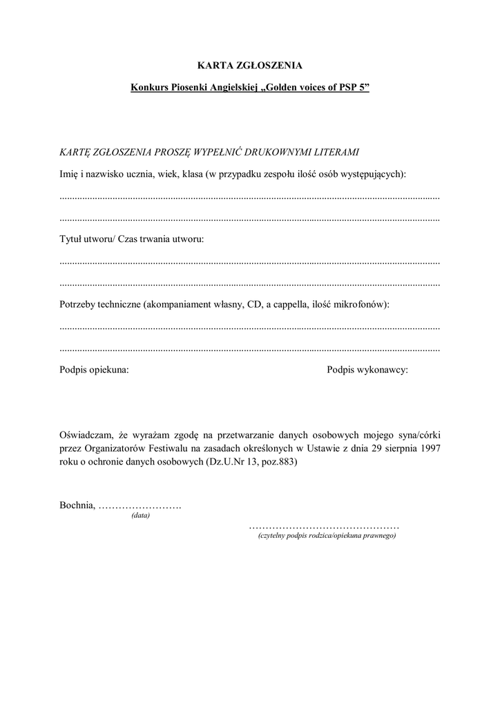 KARTA ZGŁOSZENIA Konkurs Piosenki Angielskiej „Golden voices of PSP 5” KARTĘ ZGŁOSZENIA PROSZĘ WYPEŁNIĆ DRUKOWNYMI LITERAMI Imię i nazwisko ucznia, wiek, klasa (w przypadku zespołu ilość osób występujących): ....................................................................................................................................................... ....................................................................................................................................................... Tytuł utworu/ Czas trwania utworu: ....................................................................................................................................................... ....................................................................................................................................................... Potrzeby techniczne (akompaniament własny, CD, a cappella, ilość mikrofonów): ....................................................................................................................................................... ....................................................................................................................................................... Podpis opiekuna: Podpis wykonawcy: Oświadczam, że wyrażam zgodę na przetwarzanie danych osobowych mojego syna/córki przez Organizatorów Festiwalu na zasadach określonych w Ustawie z dnia 29 sierpnia 1997 roku o ochronie danych osobowych (Dz.U.Nr 13, poz.883) Bochnia, ……………………. (data) ……………………………………… (czytelny podpis rodzica/opiekuna prawnego)