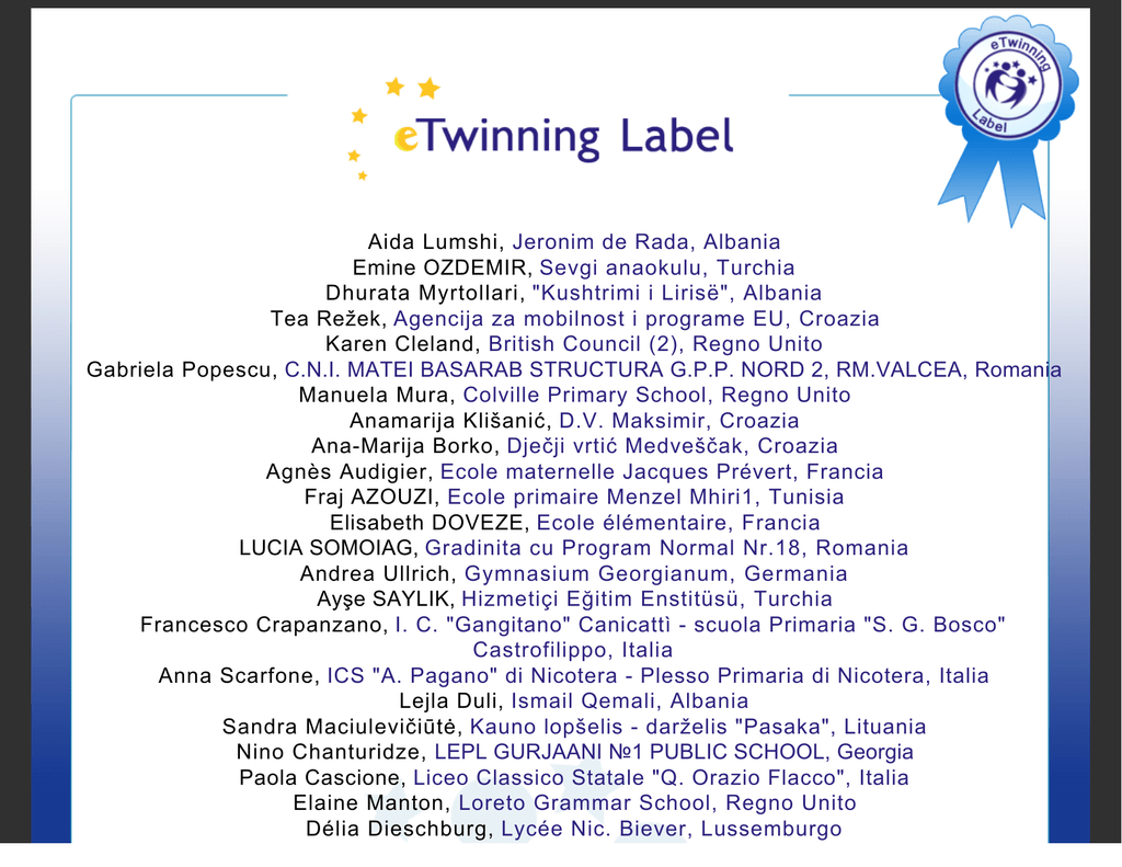 Aida Lumshi, Jeronim de Rada, Albania Emine OZDEMIR, Sevgi anaokulu, Turchia Dhurata Myrtollari, "Kushtrimi i Lirisë", Albania Tea Režek, Agencija za mobilnost i programe EU, Croazia Karen Cleland, British Council (2), Regno Unito Gabriela Popescu, C.N.I. MATEI BASARAB STRUCTURA G.P.P. NORD 2, RM.VALCEA, Romania Manuela Mura, Colville Primary School, Regno Unito Anamarija Klišanić, D.V. Maksimir, Croazia Ana-Marija Borko, Dječji vrtić Medveščak, Croazia Agnès Audigier, Ecole maternelle Jacques Prévert, Francia Fraj AZOUZI, Ecole primaire Menzel Mhiri1, Tunisia Elisabeth DOVEZE, Ecole élémentaire, Francia LUCIA SOMOIAG, Gradinita cu Program Normal Nr.18, Romania Andrea Ullrich, Gymnasium Georgianum, Germania Ayşe SAYLIK, Hizmetiçi Eğitim Enstitüsü, Turchia Francesco Crapanzano, I. C. "Gangitano" Canicattì - scuola Primaria "S. G. Bosco" Castrofilippo, Italia Anna Scarfone, ICS "A. Pagano" di Nicotera - Plesso Primaria di Nicotera, Italia Lejla Duli, Ismail Qemali, Albania Sandra Maciulevičiūtė, Kauno lopšelis - darželis "Pasaka", Lituania Nino Chanturidze, LEPL GURJAANI №1 PUBLIC SCHOOL, Georgia Paola Cascione, Liceo Classico Statale "Q. Orazio Flacco", Italia Elaine Manton, Loreto Grammar School, Regno Unito Délia Dieschburg, Lycée Nic. Biever, Lussemburgo Caroline Bonhomme, Léon Blum, Francia Caroline Bonhomme, Léon Blum, Francia Marcela Očkajáková, Materská škola Hruštín, Slovacchia Darya Arcimyeyeva, Novopilskyy Educational Complex (school of I-III level, preschool), Ucraina Adela Dobrić, Obdanište Travnik, Bosnia-Erzegovina ANA Pejkovic, Osnovna škola Antuna Kanižlića, Požega, Croazia Dejan Kramžar, Osnovna šola Toneta Okrogarja, Slovenia lindita lohja, Pashko Vasa , Albania Agnieszka Lasota, Przedszkole 392 Wróbelka Elemelka (Kindergarten No 392 in Warsaw), Polonia Alina Wujcik, Przedszkole Miejskie nr 97 w Łodzi, Polonia Claudia Chovgrani, Przedszkole nr 11, Polonia Adriana-Cristina Radoi , Scoala Gimnaziala Gheorghe Tatarascu, Tirgu-Jiu, Romania Marzia Cosentino, Scuola dell'Infanzia Paritaria "Veratti", Italia EMEL GENLI, Sevgi anaokulu, Turchia Danuta Bartkowiak-Siekańska, Szkoła Podstawowa nr 84 im. Tadeusza Kościuszki, Polonia Dorota Zając, Zespół Szkolno-Przedszkolny nr 2, Polonia Magdalena Goc, Zespół Szkół Szkoła Podstawowa im. K. Odnowiciela i Gimnazjum w Pobiedziskach, Polonia Erviola Konomi, Zhani Ciko, Albania Stoyanka Mincheva, ОДЗ " Валентина Терешкова", Bulgaria hanno ricevuto il Certificato per il loro progetto: E-twinning 11th Anniversary 25.04.2016 Mehmet Fatih DÖĞER Unità Nazionale eTwinning Turchia Marc Durando Unità eTwinning Europea Orn e la K o le k a Unità Nazionale eTwinning Albania