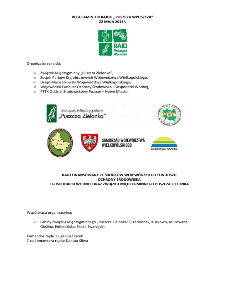 REGULAMIN XIII RAJDU ,,PUSZCZA WPUSZCZA” 22 MAJA 2016r. Organizatorzy rajdu: • • • • • Związek Międzygminny „Puszcza Zielonka”, Zespół Parków Krajobrazowych Województwa Wielkopolskiego, Urząd Marszałkowski Województwa Wielkopolskiego, Wojewódzki Fundusz Ochrony Środowiska i Gospodarki Wodnej, PTTK Oddział Środowiskowy Poznań – Nowe Miasto, RAJD FINANSOWANY ZE ŚRODKÓW WOJEWÓDZKIEGO FUNDUSZU OCHRONY ŚRODOWISKA I GOSPODARKI WODNEJ ORAZ ZWIĄZKU MIĘDZYGMINNEGO PUSZCZA ZIELONKA. Współpraca organizacyjna: • Gminy Związku Międzygminnego „Puszcza Zielonka” (Czerwonak, Kiszkowo, Murowana Goślina, Pobiedziska, Skoki, Swarzędz) Komandor rajdu: Eugeniusz Jacek Z-ca komandora rajdu: Danuta Śliwa 1. Trasa piesza – nordic walking- DLA KAŻDEGO: (pętla) ok. 11km Start: 10:00 Wioska Indiańska Łopuchówko Start i meta w Wiosce Indiańskiej Łopuchówko. Trasa wiedzie wyznakowanymi szlakami pieszymi oraz drogami leśnymi (w większości gruntowymi). Kierownicy trasy: Izabela Paprzycka, Artur Krysztofiak 2. Trasa biegowa: (pętla) ok. 8km Start: 11:00 Wioska Indiańska Łopuchówko Start i meta w Wiosce Indiańskiej Łopuchówko. Trasa wiedzie wyznakowanymi szlakami pieszymi oraz drogami leśnymi (w większości gruntowymi). Kierownik trasy: Kamil Grzebyta Trasy rowerowe rajdu: 3. ROWEROWA FAMILIJNA- ok. 9km Start: 11:00 Stacja PKP w Murowanej Goślinie Z Murowanej Gośliny – Boduszewo – Łopuchówko Kierownicy trasy: Piotr Wojciechowski, Paweł Staszak (PTTK Poznań-Nowe Miasto) 4. ROWEROWA REKREACYJNA- ok. 15km Start: 10:30 Rynek w Kiszkowie; Z Kiszkowa przez Turostowo, Dąbrówkę Kościelną, Głęboczek do Łopuchówka. Kierownicy trasy: Rafał Zawadka; Jacek Majchrzak (PTTK Poznań-Nowe Miasto) 5. ROWEROWA CYSTERSKA- ok. 36km Start: 08:30 Poznań, Malta (przy Źródełku) Z Poznania Cysterskim Szlakiem Rowerowym przez Gruszczyn (godz. 9.30 przy boisku sportowym LZS „Piast”), Wierzonkę, Mielno, Owińska (godz. 10.15 przy stacji PKP), Potasze, Kamińsko, Okoniec, dalej zielonym szlakiem pieszym do Głęboczka, skąd Małym Pierścieniem Rowerowym docieramy do Łopuchówka. Kierownik trasy: Katarzyna Wieczorek; Piotr Przybylski; Zdzisław Zawal (PTTK Poznań-Nowe Miasto) 6. ROWEROWA SPORTOWA/MTB- ok. 30 km Start: 10:00 Targowisko w Skokach; Trasa wiedzie przez atrakcyjne dla kolarstwa górskiego w większości leśne tereny o zróżnicowanej nawierzchni. Kierownik trasy: Maciej Tadeusz 7. ROWEROWA TURYSTYCZNA- ok. 35km Start: 09:00 Rynek w Pobiedziskach; Z Pobiedzisk Poznańskim Traktem Rowerowym przez Park Krajobrazowy Promno do Biskupic, dalej szlakiem R-2 przez Jerzykowo, Kowalskie, Tuczno do Pławna, skąd Małym Pierścieniem Rowerowym do Łopuchówka. Kierownicy trasy: Jan Czekalski; Tadeusz Kabaciński (PTTK Poznań-Nowe Miasto) 8. ROWEROWA TAJEMNICZA – Dotarcie na metę własnym szlakiem… dowolna z dojazdem na metę do godz. 13:00, * dystans tras rowerowych liczony jest w jedną stronę! Meta rajdu: Łopuchówko – Wioska Indiańska; meta czynna w godz. 12:00–14:00. Przewodnictwo: grupy na wszystkich trasach głównych i łącznikowych będą prowadzone przez przewodników. Przewodnicy sprawują opiekę organizacyjną nad grupą aż do momentu powrotu do punktu startowego. Zgłoszenia udziału: - Zgłoszenia udziału będą przyjmowane są wyłącznie elektronicznie, poprzez stronę www.turystyka.puszcza-zielonka.pl - Organizatorzy ustalają limit zgłoszeń: 400 osób Udział w rajdzie jest bezpłatny, jednakże świadczenia otrzymują tylko osoby zgłoszone w terminie. Uwaga: Każdy zgłoszony do 19 maja uczestnik rajdu otrzymuje: • • • znaczek rajdowy, ciepły posiłek na mecie, możliwość uczestniczenia w konkursach z nagrodami. W przypadku zgłoszeń po terminie organizatorzy nie gwarantują pełnych świadczeń! Ubezpieczenie: we własnym zakresie; uczestnicy ponoszą pełną odpowiedzialność za ew. szkody wyrządzone na trasie i mecie. Uwagi końcowe: • • • • • • • • • • • Rajd odbędzie się bez względu na warunki atmosferyczne. Organizatorzy zastrzegają sobie prawo do zmiany przebiegu poszczególnych tras. Osoby niepełnoletnie biorą udział w Rajdzie wyłącznie pod opieką osoby dorosłej! Biorąc udział w rajdzie i dokonując zapisu każdy uczestnik akceptuje regulamin rajdu i wyraża zgodę na wykorzystanie wizerunku (fotorelacje, nagrania TV, relacje z imprezy) przez media i organizatorów: na stronach www, portalach społecznościowych organizatorów, w prasie lokalnej, a także publikację danych osobowych- imienia i nazwiska na liście rajdowej, dostępnej publicznie, do celów związanych z organizacją rajdu. Rajd odbywa się wyłącznie po wyznaczonych w terenie szlakach turystycznych. Organizatorzy nie odpowiadają za niesprawny sprzęt rowerowy i nie zapewniają serwisu rowerowego na trasach rajdu. Dbaj o środowisko przyrodnicze, w którym przebywasz! Zachowaj ostrożność na trasie: twoja lekkomyślność zagraża tobie i innym, nie bądź obojętny wobec niewłaściwego zachowania! Promuj ostrożną jazdę – załóż kask ochronny! Alkohol wrogiem turystów, unikaj go podczas wędrówki! Ostateczna interpretacja regulaminu należy do organizatorów rajdu.