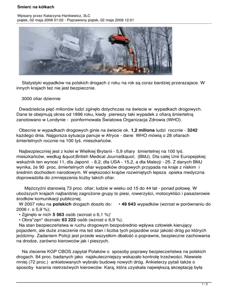 Śmierć na kółkach Wpisany przez Katarzyna Hankiewicz, 3LC piątek, 02 maja 2008 01:02 - Poprawiony piątek, 02 maja 2008 12:01 Statystyki wypadków na polskich drogach z roku na rok są coraz bardziej przerazajace. W innych krajach też nie jest bezpiecznie. 3000 ofiar dziennie Dwadzieścia pięć milionów ludzi zginęło dotychczas na świecie w wypadkach drogowych. Dane te obejmują okres od 1896 roku, kiedy pierwszy taki wypadek z ofiarą śmiertelną zanotowano w Londynie - poinformowała Światowa Organizacja Zdrowia (WHO). Obecnie w wypadkach drogowych ginie na świecie ok. 1,2 miliona ludzi rocznie - 3242 każdego dnia. Najgorsza sytuacja panuje w Afryce - dane WHO mówią o 28 ofiarach śmiertelnych rocznie na 100 tyś. mieszkańców. Najbezpieczniej jest z kolei w Wielkiej Brytanii - 5,9 ofiary śmiertelnej na 100 tyś. mieszkańców, według "British Medical Journal" (BMJ). Dla całej Unii Europejskiej wskaźnik ten wynosi 11, dla Japonii - 8,2, dla USA - 15,2, a dla Malezji - 25. Z danych BMJ wynika, że 90 proc. śmiertelnych ofiar wypadków drogowych przypada na kraje z niskim i średnim dochodem narodowym. W większości krajów rozwiniętych lepsza opieka medyczna doprowadziła do zmniejszenia liczby takich ofiar. Mężczyźni stanowią 73 proc. ofiar; ludzie w wieku od 15 do 44 lat - ponad połowę. W uboższych krajach najbardziej zagrożone grupy to piesi, rowerzyści, motocykliści i pasażerowie środków komunikacji publicznej. W 2007 roku na polskich drogach doszło do: • 49 643 wypadków (wzrost w porównaniu do 2006 r. o 5,9 %); • Zginęło w nich 5 563 osób (wzrost o 6,1 %)' • Obra*zęn* doznało 63 222 osób (wzrost o 6,9 %). Na stan bezpieczeństwa w ruchu drogowym bezpośrednio wpływa człowiek kierujący pojazdem, ale duże znaczenie ma też stan i liczba tych pojazdów oraz jakość dróg po których jeździmy. Zadaniem Policji jest przede wszystkim dbałość o poprawne, bezpieczne zachowania na drodze, zarówno kierowców jak i pieszych. Na zlecenie KGP CBOS zapytał Polaków o sposoby poprawy bezpieczeństwa na polskich drogach. 84 proc. badanych jako najskuteczniejszy wskazało kontrolę trzeźwości. Niewiele mniej (72 proc.) ankietowanych wybrało budowę nowych dróg. Ankieterzy pytali także o sposoby karania nietrzeźwych kierowców. Karą, która uzyskała największą akceptację była 1/2 Śmierć na kółkach Wpisany przez Katarzyna Hankiewicz, 3LC piątek, 02 maja 2008 01:02 - Poprawiony piątek, 02 maja 2008 12:01 kara finansowa. CBOS w dniach 3 - 8 sierpnia 2006 roku, przeprowadził na ogólnopolskiej losowej reprezentatywnej próbie 1010 mieszkańców Polski w wieku 15 lat i więcej, badanie omnibusowe, w którym - na zlecenie Komendy Głównej Policji - zostały zamieszczone pytania na temat bezpieczeństwa na polskich drogach. Aby uzyskać opinie Polaków o tym, co może mieć największy wpływ na wzrost poziomu bezpieczeństwa na drogach, badanym zadano pytanie, w którym mogli wskazać na maksymalnie pięć spośród dwunastu zaproponowanych dzia*ląn*. Aż 84% badanych wskazało kontrolę trzeźwości, jako działanie, które może mieć największy wpływ na wzrost poziomu bezpieczeństwa na drogach. Wśród innych dzia*ląn*, kolejno: 72% respondentów wskazało na budowę nowych dróg i dbałość o infrastrukturę drogową, 54% fotoradary, 51% - wysokie kary pieniężne za wykroczenia, 43% - monitoring ulic za pomocą kamer, a 40%- zwiększenie liczby policjantów kontrolujących ruch drogowy. 2/2