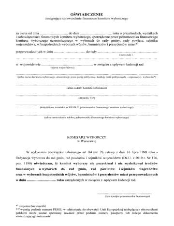 OŚWIADCZENIE zastępujące sprawozdanie finansowe komitetu wyborczego za okres od dnia ................................ do dnia .................................... roku o przychodach, wydatkach i zobowiązaniach finansowych komitetu wyborczego, sporządzone przez pełnomocnika finansowego komitetu wyborczego uczestniczącego w wyborach do rady gminy, rady powiatu, sejmiku województwa, w bezpośrednich wyborach wójtów, burmistrzów i prezydentów miast*) przeprowadzonych w dniu ……………………… do rady …………………………………………… ( nazwa rady ) …………………………………………………………………………………………………………. w województwie ........................................................... w związku z upływem kadencji rad (nazwa województwa) .................................................................................................................................................................. (pełna nazwa komitetu wyborczego, utworzonego przez partię polityczną - koalicję partii politycznych, - organizację - wyborców*) ................................................................................................................................................................. (adres siedziby komitetu wyborczego) .................................................................................................................................................................. (REGON, NIP) .................................................................................................................................................................. (imię-imiona, nazwisko, nr PESEL** pełnomocnika finansowego komitetu wyborczego) .................................................................................................................................................................. (adres zamieszkania, telefon, pełnomocnika finansowego komitetu wyborczego) KOMISARZ WYBORCZY w Warszawie W wykonaniu obowiązku nałożonego art. 84 ust. 2b ustawy z dnia 16 lipca 1998 roku Ordynacja wyborcza do rad gmin, rad powiatów i sejmików województw (Dz.U. z 2010 r. Nr 176, poz. 1190) oświadczam, iż komitet wyborczy nie pozyskiwał i nie wydatkował środków finansowych w wyborach do rad gmin, rad powiatów i sejmików województw oraz w wyborach bezpośrednich wójtów, burmistrzów i prezydentów miast przeprowadzonych w dniu ................................. roku zarządzonych w związku z upływem kadencji rad. .............................................................. (data i podpis pełnomocnika finansowego) *) niepotrzebne skreślić **) wymóg podania numeru PESEL w odniesieniu do obywateli Unii Europejskiej niebędących obywatelami polskimi może zostać spełniony również przez podania numeru paszportu lub innego dokumentu stwierdzającego tożsamość.