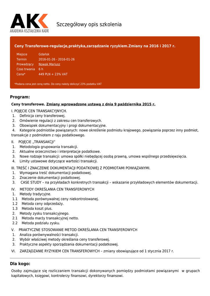 Szczegółowy opis szkolenia Ceny Transferowe-regulacje,praktyka,zarządzanie ryzykiem.Zmiany na 2016 i 2017 r. Miejsce Gdańsk Termin 2016-01-26 - 2016-01-26 Prowadzący Nowak Mariusz Czas trwania 6h Cena* 449 PLN + 23% VAT *Podana cena jest ceną netto. Do ceny należy doliczyć 23% podatku VAT Program: Ceny transferowe. Zmiany wprowadzone ustawą z dnia 9 października 2015 r. I. POJĘCIE CEN TRANSAKCYJNYCH. 1. Definicja ceny transferowej. 2. Omówienie regulacji z zakresu cen transferowych. 3. Obowiązek dokumentacyjny i progi dokumentacyjne. 4. Kategorie podmiotów powiązanych: nowe określenie podmiotu krajowego, powiązania poprzez inny podmiot, transakcje z podmiotem z raju podatkowego. II. POJĘCIE „TRANSAKCJI” 1. Metodologia grupowania transakcji. 2. Aktualne orzecznictwo i interpretacje podatkowe. 3. Nowe rodzaje transakcji: umowa spółki niebędącej osobą prawną, umowa wspólnego przedsięwzięcia. 4. Limity ustawowe dotyczące wartości transakcji. III. TREŚĆ I ZNACZENIE DOKUMENTACJI PODATKOWEJ Z PODMIOTAMI POWIĄZANYMI. 1. Wymagana treść dokumentacji podatkowej. 2. Znaczenie dokumentacji podatkowej. 3. CASE STUDY – na przykładach konkretnych transakcji – wskazanie przykładowych elementów dokumentacji. IV. METODY OKREŚLANIA CEN TRANSFEROWYCH 1. Metody tradycyjne. 1.1 Metoda porównywalnej ceny niekontrolowanej. 1.2 Metoda ceny odprzedaży. 1.3 Metoda koszt plus. 2. Metody zysku transakcyjnego. 2.1 Metoda marży transakcyjnej netto. 2.2 Metoda podziału zysku. V. PRAKTYCZNE STOSOWANIE METOD OKREŚLANIA CEN TRANSFEROWYCH 1. Analiza porównywalności transakcji. 2. Wybór właściwej metody określania ceny transferowej. 3. Praktyczne aspekty sporządzania dokumentacji podatkowej. VI. ZARZĄDZANIE RYZYKIEM CEN TRANSFEROWYCH – zmiany obowiązujące od 1 stycznia 2017 r. Dla kogo: Osoby zajmujące się rozliczaniem transakcji dokonywanych pomiędzy podmiotami powiązanymi w grupach kapitałowych, księgowi, kontrolerzy finansowi, dyrektorzy finansowi. Cel: Celem szkolenia jest omówienie obowiązków podatników w zakresie dokumentowania transakcji z podmiotami powiązanymi, a także zmian wprowadzonych ustawą z dnia 9 października 2015 r. o zmianie ustawy o podatku dochodowym od osób fizycznych, ustawy o podatku dochodowym od osób prawnych oraz niektórych innych ustaw (Dz. U. z 2015 r. Nr 3697). Korzyści: Uczestnicy poprzez udział w szkoleniu ze specjalistą z doświadczeniem miedzynarodowym w dziedzinie cen transferowych mają okazje do pozyskania wiedzy, usystematyzowania wiedzy a także poprzez pracę na rzczywistych przykładach praktycznych zweryfikowania posiadanych umiejętnosci. Wykładowca: Nowak Mariusz Doradca podatkowy, Doktorant Uniwersytetu Ekonomicznego w Poznaniu. Pięcioletnie doświadczenie zawodowe na stanowiskach kierowniczych w urzędzie skarbowym, gdzie specjalizował się w kontrolach podatkowych, postępowaniach podatkowych oraz postępowaniach egzekucyjnych w administracji. Dwuletnie doświadczenie zawodowe w jednej z największych firm produkcyjnych świata, w której zajmował się doradztwem podatkowym. Obecnie prezes zarządu w międzynarodowej spółce doradztwa podatkowego Goldenstein. Zajmuje się obsługą prawno-podatkową polskich oraz międzynarodowych firm. Posiada szerokie doświadczenie w prowadzeniu szkoleń dla urzędów skarbowych, biur rachunkowych, księgowych oraz dla przedsiębiorców. W szkoleniach koncentruje się na poszukiwaniu sposobów optymalizacji opodatkowania. Przedstawia sposób działania. Szkolenia są prowadzone w sposób dynamiczny i ciekawy. Szkolenia oparte są na przykładach praktycznych czerpanych z doświadczenia prelegenta. Jego szkolenia cieszą się dużym uznaniem wśród słuchaczy.Jest autorem publikacji w biuletynie finansowym i w gazecie prawnej. Od 2013 roku posiada uprawnienia niemieckiego doradcy podatkowego. Opinie: Mocno pomocne szkolenie,informacje świeże i gorące. Sposób prezentacji bardzo aktywizujący grupę,dziękujemy. Barbara Wenta Morska Służba Poszukiwania i Ratownictwa Szkolenie prowadzone w sposób angażujący uczestników,barwnie i komunikatywnie. Małgorzata Szymańska Jodko-Schiewe Szkolenie atrakcyjne ze wzgledu na tematy,które były na nim podjęte i omawiane. Wiedza wykładowcy przekazana w sposób bardzo przystępny i atrakcyjny. Anna Nalewka Hako Technology Przede wszystkim wybierając szkolenie, kierowałam się tematem szkolenia, jednak na uwagę zasługuje osoba prowadząca szkolenie,bardzo łatwy sposób przekazywania informacji podatkowych,szkolenie dynamiczne,ciekawe,przy którym trudna tematyka szkoleń stała się łatwym tematem. Magdalena Petruk "Arbud" Szkolenie zostało przeprowadzone wyczerpująco,dokładnie zostały wyjaśnione kwestie dotyczące zmian w podatku VAT,miła atmosfera.Sposób przeprowadzenia szkolenia w pełni dla mnie zrozumiały i czytelny. Barbara Kopeć Komunikacja Miejska Szczecinek Szkolenie bardzo treściwe i n atemat.Możliwość omówienia problemó występujących na co dzień w firmie. I.Atamańczuk Ferrosan Medical Devices Szkolenie profesjonalne, praktyczne przykłady. G. Rogowska Abena Polska Przystępnie, kompleksowo, konkretnie i sympatycznie. A. Brożek Limito SA Szkolenie prowadzone bardzo rzetelnie. Duża ilość materiałów. Tematy omówione bardzo dokładnie. B.Adamczyk ZWiK Szkolenie prowadzone w atrakcyjny sposób, możliwość zadawania pytań na temat własnych problemów praktycznych E.Paszkowska Konecranes Szczegóły organizacyjne: Koszt uczestnictwa: • -jednej osoby 449 plus 23% VAT, razem 552.27 • -kolejnych osób - prosimy o kontakt Uwaga: Promocje i rabaty nie łączą się. Uwaga: Możecie Państwo zwracać się z wnioskiem o dofinansowanie szkolenia z Krajowego Funduszu Szkoleniowego, Cena obejmuje: • -uczestnictwo w szkoleniu • -serwis kawowy • -obiad • -materiały szkoleniowe • -certyfikat ukończenia Płatności: • Prosimy realizować na konto 40 1320 1537 1869 78