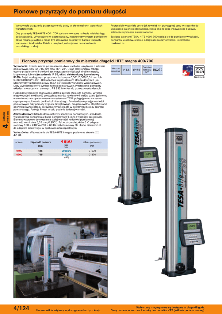 Pionowe przyrządy do pomiaru długości Wytrzymałe urządzenie przeznaczone do pracy w ekstremalnych warunkach warsztatowych. Oba przyrządy TESA/HITE 400 i 700 zostały stworzone na bazie wieloletniego doświadczenia. Wyposażone w opatentowany, magnetyczny system pomiarowy TESA magna µ system i mogą być stosowane do pracy w bardzo trudnych warunkach środowiska. Każde z urządzeń jest odporne na zabrudzenia wszelakiego rodzaju. Poprzez ich wspaniałe cechy jak również ich przystępnej ceny w stosunku do wydajności są one niezastąpione. Niosą one ze sobą innowacyjną budowę, solidność wykonania i niezawodność. Zasilane bateriami TESA-HITE 400 i 700 nadają się do pomiarów wysokości, pomiarów uskoków, średnic, odległości między otworami i szerokości rowków i in. Pionowy przyrząd pomiarowy do mierzenia długości HITE magna 400/700 4 Technika pomiarowa Wykonanie: Szeroki zakres przeznaczenia, dwie wielkości urządzenia o zakresie pomiarowym 415 lub 715 mm albo 16“ i 28“. Układ elektroniczny zabezpieczony przed stałymi i ciekłymi zanieczyszczeniami jak pył, drobiny metalu, krople wody lub olej (urządzenie IP 55, układ elektroniczny i pomiarowy IP 65). Pulpit obsługowy z przyrostem liczbowym 0,001/0,005/0,01 mm lub 0,0001/0,0002/0,001. Dokładność z wyposażeniem standardowym 8 µm. Magnetyczny układ pomiarowy TESA do trudnych warunków warsztatowych. Duży wyświetlacz cyfr i symboli funkcji pomiarowych. Przełączanie pomiędzy układem metrycznym i calowym. RS 232 interfejs do przekazywania danych. Norma zakładowa IP 55 IP 65 Certyfikat kalibracji SCS RS232 Funkcje: Dynamiczne skanowanie detali z zawsze stałą siłą pomiaru. Wysoka niezawodność, możliwość prostych pomiarów nawiertów i wałów dzięki jedynemu w swoim rodzaju opatentowanemu systemowi TESA polegającemu na samoczynnym wyszukiwaniu punktu kulminacyjnego. Potwierdzenie przejęć wartości pomiarowych przy pomocy sygnału dźwiękowego, programowalne. Rejestrowanie odchyłek równoległości. Zerowanie wyświetlacza w dowolnym miejscu zakresu pomiarowego. Funkcja Preset w celu podania żądanej wartości. Zakres dostawy: Standardowe uchwyty końcówek pomiarowych, standardowa końcówka pomiarowa z kulką pomiarową ∅ 5 mm z węglików spiekanych. Element wzorcowy do określenia stałej wartości końcówki pomiarowej (wartość nominalna 6,35 mm/0.250“). Pakiet akumulatorków 6 V, adapter sieciowy 100 ÷ 240 Vac/50 ÷ 60 Hz, kabel sieciowy EU i kabel sieciowy US do adaptera sieciowego, w opakowaniu transportowym. Wskazówka: Wyposażenie do TESA-HITE i magna podano na stronie Ç 4/128. nr zam. rozpiętość pomiaru mm 0400 0700 415 715 4850 zakres pomiarowy mm 2930,00 3443,00 0–570 0–870 (495) 4/124 Nie wszystkie artykuły są dostępne w każdym kraju. Stałe stany magazynowe są dostępne w ciągu 48 godz. Ceny podane w euro za 1 sztukę bez podatku VAT (jeśli nie podano inaczej). Pionowe przyrządy do pomiaru długości Wyposażone w opatentowany, optyczno-elektroniczny układ pomiarowy, bazujące na przyrostowo podzielonym przymiarze szklanym urządzenia TESAHITE 400 i 700 charakteryzują się dokładnością pomiaru, niezawodnoscią i wytrzymałością. Idealna pomoc do pomiarów warsztatowych. Zasilane bateriami TESA-HITE 400 i 700 nadają się do pomiaru wymiarów wysokościowych i stopniowanych, średnic, odległości pomiędzy otworami i szerokości rowków. Pionowy przyrząd do pomiaru długości HITE 400/700 Wykonanie: Szeroki zakres stosowania, dwie wielkości urządzenia z zakresem pomiarowym 415 mm i 715 mm lub 16 cali i 28 cali. Układ elektroniczny całkowicie zabezpieczony przed stałymi i ciekłymi zanieczyszczeniami jak pył, drobiny metalu, krople wody lub olej (urządzenie IP 40, układ elektroniczny IP 65). Pulpit obsługowy z przyrostem liczbowym 0,0001/0,001/0,01 mm lub 0,00001/0,0001/0,001 cala. Dokładność z wyposażeniem standardowym (2,5 + 4*L) µm (L w m). Wyposażone w opatentowany, optyczno-elektroniczny układ pomiarowy TESA. Zapewnienie dużej dokładności dzięki długotrwale stabilnej podziałce. Duży wyświetlacz cyfr i symboli funkcji pomiarowych. Przełączanie pomiędzy układem metrycznym i calowym. RS 232 interfejs. Norma zakładowa IP 40 IP 65 Certyfikat kalibracji SCS RS232 Technika pomiarowa Funkcje: Łatwe przesuwanie przyrządu pomiarowego na płycie kontrolnej dzięki zintegrowanemu łożysku powietrznemu. Dynamiczne dotykanie przedmiotu z tą samą siłą. Wysoka niezawodność, możliwość prostych pomiarów nawiertów i wałów dzięki jedynemu w swoim rodzaju opatentowanemu systemowi TESA polegającemu na samoczynnym wyszukiwaniu punktu kulminacyjnego. Potwierdzenie przejęć wartości pomiarowych przy pomocy sygnału dźwiękowego, programowalne. Rejestrowanie odchyłek równoległości. Pomiary odchyleń prostopadłości za pomocą cyfrowego czujnika zegarowego z podaniem kąta prostych wyrównawczych. Możliwość wyzerowania w każdej pozycji zakresu pomiarowego. Funkcja Preset w celu podania żądanej wartości. 4 Zakres dostawy: Standardowe uchwyty końcówek pomiarowych, standardowe końcówki pomiarowe z trzpieniem dotykowym i kulką pomiarową ∅ 5 mm z węglików spiekanych. Element wzorcowy do określenia stałej wartości końcówki pomiarowej (wartość nominalna 6,35 mm/0.250 cala). Elektryczna pompa do powietrznego łożyskowania stopy urządzenia na płycie kontrolnej, zamontowana, pakiet akumulatorków 6 V, adapter sieciowy 100 ÷ 240 Vac/50 ÷ 60 Hz, kabel sieciowy EU i kabel sieciowy US do adaptera sieciowego, w opakowaniu transportowym. Wskazówka: Wyposażenie do TESA-HITE i magna podano na stronie Ç 4/128. nr zam. rozpiętość pomiaru mm 0400 0700 415 715 4852 zakres pomiarowy mm 4172,00 4828,00 0–570 0–870 (495) Artykuły oznaczone znakiem ◊ nie są w magazynie. Zakup tych artykułów realizowany jest w krótkim terminie. Nie wszystkie artykuły są dostępne w każdym kraju