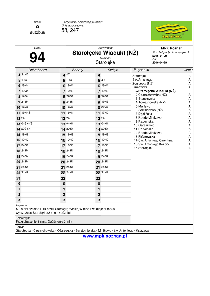 strefa: A autobus Z przystanku odjeżdżają również: Linie autobusowe: 58, 247 Linia: przystanek: 94 Dni robocze 4 24 47 5 19 49 6 19 44 7 10 34 8 19 54 9 24 54 10 19 49 11 19 44S 12 24 13 04S 44S 14 29S 54 15 19 49 16 19 49 17 34 59 18 24 54 19 24 54 20 24 54 21 24 54 22 24 49 23 0 1 2 3 Starołęcka Wiadukt (NŻ) kierunek: Starołęka 4 5 6 7 8 9 10 11 12 13 14 15 16 17 18 19 20 21 22 23 0 1 2 3 47 Soboty 19 49 19 44 10 49 29 54 24 54 19 49 19 44 24 04 44 29 54 19 49 19 49 19 56 24 54 24 54 24 54 24 54 24 49 4 5 6 7 8 9 10 11 12 13 14 15 16 17 18 19 20 21 22 23 0 1 2 3 Święta 49 19 44 10 49 29 54 19 42 07 49 17 40 24 04 44 29 54 19 49 19 49 19 56 24 54 Przystanki Starołęka Św. Antoniego Żeglarska (NŻ) Dziedzicka →Starołęcka Wiadukt (NŻ) 2-Czernichowska (NŻ) 3-Staszowska 4-Tomaszowska (NŻ) 5-Marlewo 6-Zaklikowska (NŻ) 7-Dęblińska 8-Rondo Minikowo 9-Radomska 10-Garaszewo 11-Radomska 12-Rondo Minikowo 13-Pińczowska 14-Św. Antoniego Cmentarz 15-Św. Antoniego Kościół 15-Starołęka 24 54 24 54 24 54 24 49 Legenda: S - w dni szkolne kurs przez Starołękę Wielką.W ferie i wakacje autobus wyjeżdżaze Starołęki o 3 minuty później Tolerancja: Przyspieszenie 1 min., Opóźnienie 3 min. Trasa: Starołęcka - Czernichowska - Ożarowska - Sandomierska - Minikowo - św. Antoniego - Książęca www.mpk.poznan.pl MPK Poznań Rozkład jazdy obowiązuje od: 2016-04-29 do: 2016-04-29 strefa A A A A A A A A A A A A A A A A A A A