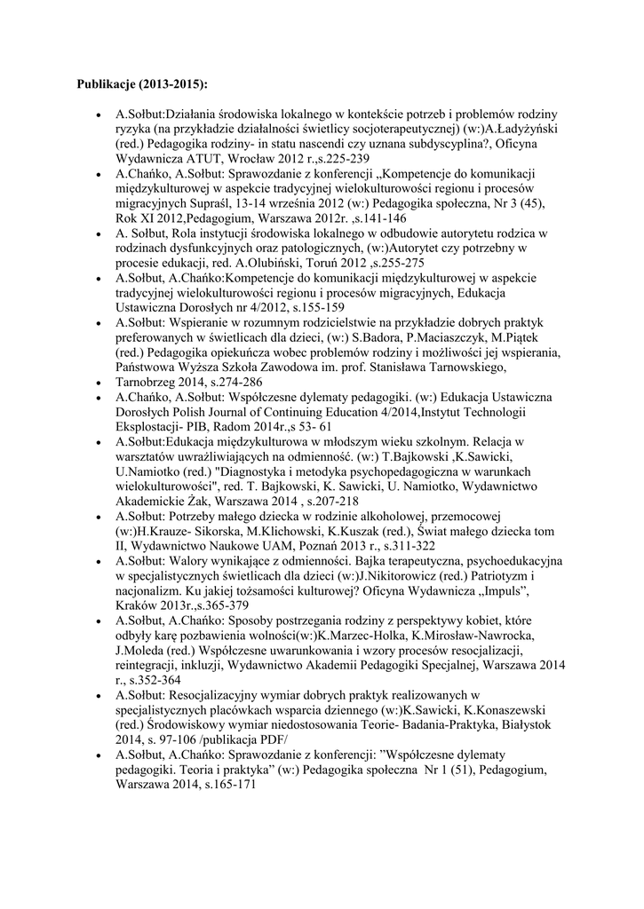 Publikacje (2013-2015): A.Sołbut:Działania środowiska lokalnego w kontekście potrzeb i problemów rodziny ryzyka (na przykładzie działalności świetlicy socjoterapeutycznej) (w:)A.Ładyżyński (red.) Pedagogika rodziny- in statu nascendi czy uznana subdyscyplina?, Oficyna Wydawnicza ATUT, Wrocław 2012 r.,s.225-239 A.Chańko, A.Sołbut: Sprawozdanie z konferencji „Kompetencje do komunikacji międzykulturowej w aspekcie tradycyjnej wielokulturowości regionu i procesów migracyjnych Supraśl, 13-14 września 2012 (w:) Pedagogika społeczna, Nr 3 (45), Rok XI 2012,Pedagogium, Warszawa 2012r. ,s.141-146 A. Sołbut, Rola instytucji środowiska lokalnego w odbudowie autorytetu rodzica w rodzinach dysfunkcyjnych oraz patologicznych, (w:)Autorytet czy potrzebny w procesie edukacji, red. A.Olubiński, Toruń 2012 ,s.255-275 A.Sołbut, A.Chańko:Kompetencje do komunikacji międzykulturowej w aspekcie tradycyjnej wielokulturowości regionu i procesów migracyjnych, Edukacja Ustawiczna Dorosłych nr 4/2012, s.155-159 A.Sołbut: Wspieranie w rozumnym rodzicielstwie na przykładzie dobrych praktyk preferowanych w świetlicach dla dzieci, (w:) S.Badora, P.Maciaszczyk, M.Piątek (red.) Pedagogika opiekuńcza wobec problemów rodziny i możliwości jej wspierania, Państwowa Wyższa Szkoła Zawodowa im. prof. Stanisława Tarnowskiego, Tarnobrzeg 2014, s.274-286 A.Chańko, A.Sołbut: Współczesne dylematy pedagogiki. (w:) Edukacja Ustawiczna Dorosłych Polish Journal of Continuing Education 4/2014,Instytut Technologii Eksplostacji- PIB, Radom 2014r.,s 53- 61 A.Sołbut:Edukacja międzykulturowa w młodszym wieku szkolnym. Relacja w warsztatów uwrażliwiających na odmienność. (w:) T.Bajkowski ,K.Sawicki, U.Namiotko (red.) "Diagnostyka i metodyka psychopedagogiczna w warunkach wielokulturowości", red. T. Bajkowski, K. Sawicki, U. Namiotko, Wydawnictwo Akademickie Żak, Warszawa 2014 , s.207-218 A.Sołbut: Potrzeby małego dziecka w rodzinie alkoholowej, przemocowej (w:)H.Krauze- Sikorska, M.Klichowski, K.Kuszak (red.), Świat małego dziecka tom II, Wydawnictwo Naukowe UAM, Poznań 2013 r., s.311-322 A.Sołbut: Walory wynikające z odmienności. Bajka terapeutyczna, psychoedukacyjna w specjalistycznych świetlicach dla dzieci (w:)J.Nikitorowicz (red.) Patriotyzm i nacjonalizm. Ku jakiej tożsamości kulturowej? Oficyna Wydawnicza „Impuls”, Kraków 2013r.,s.365-379 A.Sołbut, A.Chańko: Sposoby postrzegania rodziny z perspektywy kobiet, które odbyły karę pozbawienia wolności(w:)K.Marzec-Holka, K.Mirosław-Nawrocka, J.Moleda (red.) Współczesne uwarunkowania i wzory procesów resocjalizacji, reintegracji, inkluzji, Wydawnictwo Akademii Pedagogiki Specjalnej, Warszawa 2014 r., s.352-364 A.Sołbut: Resocjalizacyjny wymiar dobrych praktyk realizowanych w specjalistycznych placówkach wsparcia dziennego (w:)K.Sawicki, K.Konaszewski (red.) Środowiskowy wymiar niedostosowania Teorie- Badania-Praktyka, Białystok 2014, s. 97-106 /publikacja PDF/ A.Sołbut, A.Chańko: Sprawozdanie z konferencji: ”Współczesne dylematy pedagogiki. Teoria i praktyka” (w:) Pedagogika społeczna Nr 1 (51), Pedagogium, Warszawa 2014, s.165-171