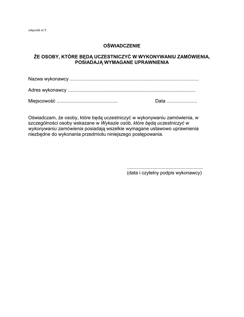 załącznik nr 9 OŚWIADCZENIE ŻE OSOBY, KTÓRE BĘDĄ UCZESTNICZYĆ W WYKONYWANIU ZAMÓWIENIA, POSIADAJĄ WYMAGANE UPRAWNIENIA Nazwa wykonawcy ................................................................................................. Adres wykonawcy ................................................................................................ Miejscowość .............................................. Data ....................... Oświadczam, że osoby, które będą uczestniczyć w wykonywaniu zamówienia, w szczególności osoby wskazane w Wykazie osób, które będą uczestniczyć w wykonywaniu zamówienia posiadają wszelkie wymagane ustawowo uprawnienia niezbędne do wykonania przedmiotu niniejszego postępowania. ......................................................... (data i czytelny podpis wykonawcy)