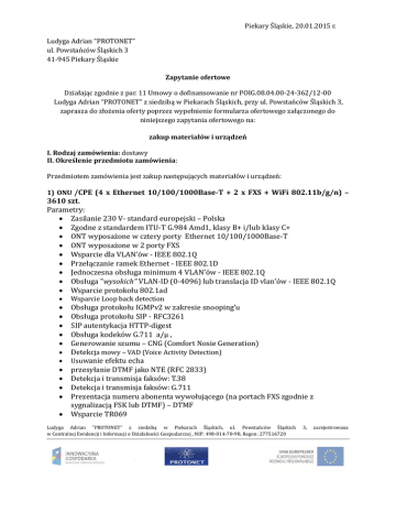 Piekary Śląskie, 20.01.2015 r. Ludyga Adrian ”PROTONET” ul. Powstańców Śląskich 3 41-945 Piekary Śląskie Zapytanie ofertowe Działając zgodnie z par. 11 Umowy o dofinansowanie nr POIG.08.04.00-24-362/12-00 Ludyga Adrian ”PROTONET” z siedzibą w Piekarach Śląskich, przy ul. Powstańców Śląskich 3, zaprasza do złożenia oferty poprzez wypełnienie formularza ofertowego załączonego do niniejszego zapytania ofertowego na: zakup materiałów i urządzeń I. Rodzaj zamówienia: dostawy II. Określenie przedmiotu zamówienia: Przedmiotem zamówienia jest zakup następujących materiałów i urządzeń: 1) ONU /CPE (4 x Ethernet 10/100/1000Base-T + 2 x FXS + WiFi 802.11b/g/n) – 3610 szt. Parametry: Zasilanie 230 V- standard europejski – Polska Zgodne z standardem ITU-T G.984 Amd1, klasy B+ i/lub klasy C+ ONT wyposażone w cztery porty Ethernet 10/100/1000Base-T ONT wyposażone w 2 porty FXS Wsparcie dla VLAN'ów - IEEE 802.1Q Przełączanie ramek Ethernet - IEEE 802.1D Jednoczesna obsługa minimum 4 VLAN'ów - IEEE 802.1Q Obsługa "wysokich" VLAN-ID (0-4096) lub translacja ID vlan'ów - IEEE 802.1Q Wsparcie protokołu 802.1ad Wsparcie Loop back detection Obsługa protokołu IGMPv2 w zakresie snooping’u Obsługa protokołu SIP - RFC3261 SIP autentykacja HTTP-digest Obsługa kodeków G.711 a/μ , Generowanie szumu – CNG (Comfort Nosie Generation) Detekcja mowy – VAD (Voice Activity Detection) Usuwanie efektu echa przesyłanie DTMF jako NTE (RFC 2833) Detekcja i transmisja faksów: T.38 Detekcja i transmisja faksów: G.711 Prezentacja numeru abonenta wywołującego (na portach FXS zgodnie z sygnalizacją FSK lub DTMF) – DTMF Wsparcie TR069 Ludyga Adrian ”PROTONET” z siedzibą w Piekarach Śląskich, ul. Powstańców Śląskich w Centralnej Ewidencji i Informacji o Działalności Gospodarczej , NIP: 498-014-70-90, Regon: 277516720 3, zarejestrowana QoS – znakowanie pakietów DSCP/COS Obsługa Dial-plan Hot-line 3-way calling Autoprovisioning VOIP Możliwość ustawienia usług na oddzielnych VLANach przypisanych do oddzielnych portów fizycznych urządzenia W okresie 24-miesięcznej gwarancji zleceniodawca będzie realizował wsparcie techniczne które będzie obejmować pomoc telefoniczną w zakresie korzystania z urządzeń i oprogramowania obejmującą identyfikację problemów ze sprzętem i / lub oprogramowaniem w godzinach 8-16 w dni robocze od poniedziałku do piątku oraz 24-godzinne wsparcie serwisowe z usunięciem awarii w czasie 12 godzin od zgłoszenia. 2) Przełącznica kliencka światłowodowa – 3485 szt. 3) Uchwyt na kabel 12 J – 2000 szt. 4) Szafa Rack 42 U 21– 5 szt. - przeznaczona do tworzenia sieci informatycznych i teleinformatycznych w centrach bazodanowych i serwerowniach. Szafa powinna być bezpiecznym i pewnym miejscem dla zabudowy szeroko rozumianego sprzętu sieciowego o szerokości 21’’ i rozstawie 42U. 5) Mufa światłowodowa z wyposażeniem – 500 szt. - mufa typu box wyposażona w 17 portów wlotu/wylotu, stosowana do ochrony splotów kabli światłowodu i aplikacji rozgałęziających przeznaczona do instalacji napowietrznych jak i doziemnych. Materiał Polycarbonate (PC) tworzący obudowę powinien być wykonany: z wysokiej jakości tworzywa odpornego na promieniowanie UV, niską (-40°C) i wysoką (+60°C) temperaturę, oraz substancje chemiczne Wszystkie metalowe elementy mufy powinny być wykonane z materiałów odpornych na korozję. Wyposażenie: zintegrowana tacka światłowodowa 24J zintegrowane wsporniki na adaptery światłowodowe taśma uszczelniającą tuby ochronne do dystrybucji włókien plastikowe opaski zaciskowe jednokrotnego użycia (trytytki) klucz śruby akcesoria uszczelniające 6) Splitter PLC SC/APC, SM 0,9 mm 1x8 - 870 szt. Ludyga Adrian ”PROTONET” z siedzibą w Piekarach Śląskich, ul. Powstańców Śląskich w Centralnej Ewidencji i Informacji o Działalności Gospodarczej , NIP: 498-014-70-90, Regon: 277516720 3, zarejestrowana 7) Patchord SC/APC – SC/APC, SM, SIMPLEX, 1M– 600 szt. 8) Pigtail SC/APC– 680 szt. 9) Zasilacz bezprzerwowy UPS 3kVA, tru on-line z montażem– 5 szt. 10) Kabel światłowodowy 1 J (kliencki) – 365 km Kabel światłowodowy przeznaczony do instalacji napowietrznych na przęsłach 80-100 m oraz w kanalizacji teletechnicznej pierwotnej i wtórnej metodami pnematycznymi (wdmuchiwanie) i mechanicznymi (zaciąganie). Konstrukcja kabla powinna zapewnić bardzo dobrą osłonę włókien i dodatkowo umożliwić łatwe prowadzenie i mocowanie kabla. Parametry: zewnętrzno-wewnętrzny, okrągły, samonośny, przeznaczony do zastosowania w systemach FTTx, wzmocniony włóknami aramidowymi, lekka konstrukcja o małej średnicy 3mm, duża giętkość i odporność na przeciąganie, płaszcz PU, powłoka odporna na UV, całkowicie dielektryczny siła ciągnięcia 500 N, zakres temperatur -20 - +60 ̊C. 11) Uchwyt na kabel 1J – 15000 szt. III. Czy dopuszcza się złożenie oferty częściowej: nie. IV. Czy dopuszcza się złożenie oferty wariantowej: nie. V. Czy przewiduje się udzielenie zamówień uzupełniających: nie. VI. Czas trwania lub termin wykonania zamówienia: Zakończenie: 31.05.2015 r. VII. Termin składania ofert: 27.01.2015 r. VIII. Kryteria oceny ofert: 100% cena IX. Informacje administracyjne: a) Termin związania ofertą: okres w dniach: 30 (od ostatecznego terminu składania ofert). b) Informacje dodatkowe, w tym dotyczące finansowania projektu/programu ze środków Unii Europejskiej: Udział środków UE w finansowaniu zamówienia: 60% X. Załącznik – Formularz ofertowy Uwaga: formularz ofertowy można złożyć osobiście w siedzibie Zamawiającego lub przesłać za pomocą poczty na adres: Ludyga Adrian ”PROTONET” ul. Powstańców Śląskich 3, 41-945 Piekary Śląskie Ludyga Adrian ”PROTONET” z siedzibą w Piekarach Śląskich, ul. Powstańców Śląskich w Centralnej Ewidencji i Informacji o Działalności Gospodarczej , NIP: 