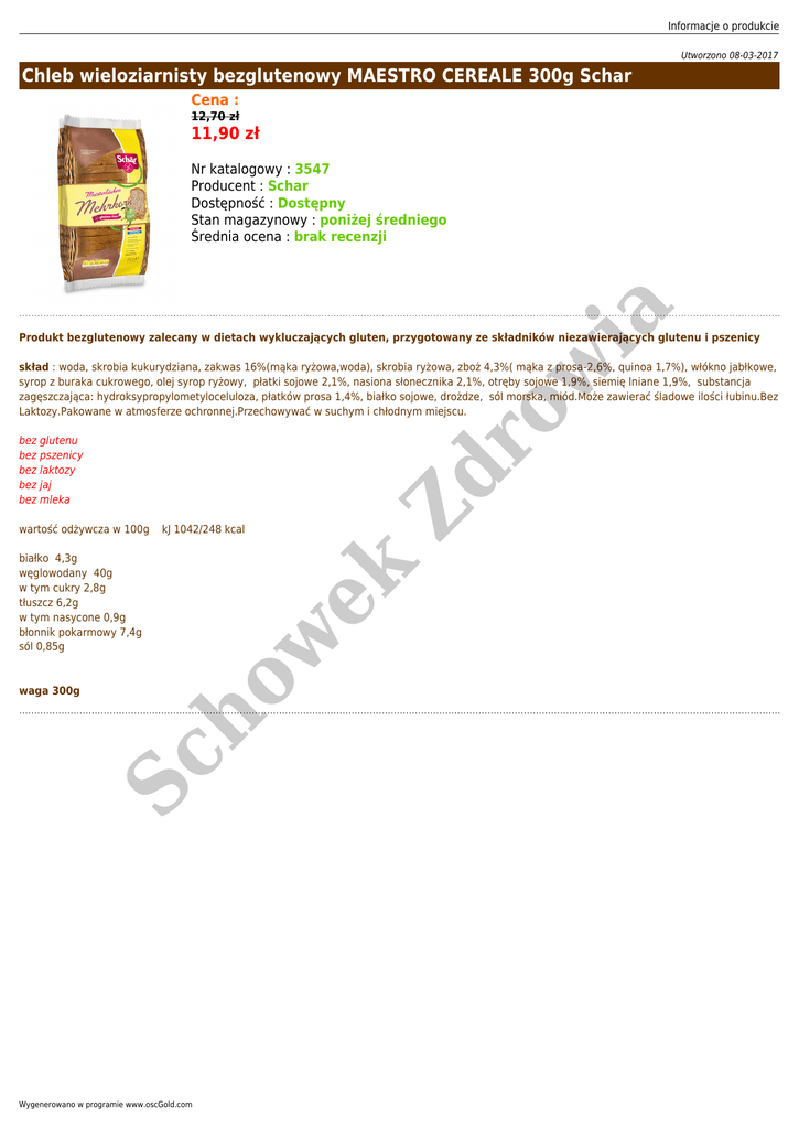 Informacje o produkcie Utworzono 08-03-2017 Chleb wieloziarnisty bezglutenowy MAESTRO CEREALE 300g Schar Cena : 12,70 zł 11,90 zł ia Nr katalogowy : 3547 Producent : Schar Dostępność : Dostępny Stan magazynowy : poniżej średniego Średnia ocena : brak recenzji Produkt bezglutenowy zalecany w dietach wykluczających gluten, przygotowany ze składników niezawierających glutenu i pszenicy Zd ro w skład : woda, skrobia kukurydziana, zakwas 16%(mąka ryżowa,woda), skrobia ryżowa, zboż 4,3%( mąka z prosa-2,6%, quinoa 1,7%), włókno jabłkowe, syrop z buraka cukrowego, olej syrop ryżowy, płatki sojowe 2,1%, nasiona słonecznika 2,1%, otręby sojowe 1,9%, siemię lniane 1,9%, substancja zagęszczająca: hydroksypropylometyloceluloza, płatków prosa 1,4%, białko sojowe, drożdze, sól morska, miód.Może zawierać śladowe ilości łubinu.Bez Laktozy.Pakowane w atmosferze ochronnej.Przechowywać w suchym i chłodnym miejscu. bez glutenu bez pszenicy bez laktozy bez jaj bez mleka waga 300g Sc ho białko 4,3g węglowodany 40g w tym cukry 2,8g tłuszcz 6,2g w tym nasycone 0,9g błonnik pokarmowy 7,4g sól 0,85g ek kJ 1042/248 kcal w wartość odżywcza w 100g Wygenerowano w programie www.oscGold.com