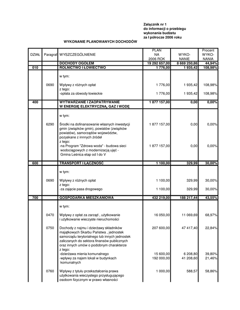 WYKONANIE PLANOWANYCH DOCHODÓW DZIAŁ Paragraf WYSZCZEGÓLNIENIE DOCHODY OGÓŁEM ROLNICTWO I ŁOWIECTWO 010 Zał cznik nr 1 do informacji o przebiegu wykonania bud etu za I półrocze 2006 roku PLAN NA 2006 ROK 19 292 657,00 1 776,00 WYKONANIE 8 669 250,86 1 935,42 Procent WYKONANIA 44,94% 108,98% 1 776,00 1 935,42 108,98% 1 776,00 1 935,42 108,98% 1 877 157,00 0,00 0,00% 1 877 157,00 0,00 0,00% 1 877 157,00 0,00 0,00% 1 100,00 329,99 30,00% 1 100,00 329,99 30,00% 1 100,00 329,99 30,00% 432 219,00 188 217,44 43,55% 16 050,00 11 069,69 68,97% 207 600,00 47 417,40 22,84% 15 600,00 192 000,00 6 208,80 41 208,60 39,80% 21,46% 1 000,00 588,57 58,86% w tym: 0690 400 Wpływy z ró nych opłat z tego: -opłata za obwody łowieckie WYTWARZANIE I ZAOPATRYWANIE W ENERGI ELEKTRYCZN , GAZ I WOD w tym: 6290 600 rodki na dofinansowanie własnych inwestycji gmin (zwi zków gmin), powiatów (zwi zków powiatów), samorz dów województw, pozyskane z innnych ródeł z tego: -na Program "Zdrowa woda" - budowa sieci wodoci gowych z modernizacj uj Gmina Le nica etap od I do V TRANSPORT I Ł CZNO w tym: 0690 700 Wpływy z ró nych opłat z tego: -za zaj cie pasa drogowego GOSPODARKA MIESZKANIOWA w tym: 0470 Wpływy z opłat za zarz d , u ytkowanie i u ytkowanie wieczyste nieruchomo ci 0750 Dochody z najmu i dzier awy składników maj tkowych Skarbu Pa stwa , jednostek samorz du terytorialnego lub innych jednostek zaliczanych do sektora finansów publicznych oraz innych umów o podobnym charakterze z tego: -dzier awa mienia komunalnego -wpływy za najem lokali w budynkach komunalnych 0760 Wpływy z tytułu przekształcenia prawa u ytkowania wieczystego przysługuj cego osobom fizycznym w prawo własno ci 0830 6 569,00 2 665,67 40,58% 670,00 5 899,00 159,39 2 506,28 23,79% 42,49% 200 000,00 124 964,20 62,48% 200 000,00 124 964,20 62,48% 1 000,00 480,17 48,02% 0,00 1 031,74 0,00% 103 553,00 56 994,01 55,04% 0,00 40,00 0,00% 0,00 40,00 0,00% 1 500,00 475,38 31,69% 1 500,00 475,38 31,69% 10 000,00 4 915,74 49,16% 10 000,00 0,00 4 495,46 420,28 44,95% 0,00% Wpływy ze sprzeda y wyrobów z tego: -za sprzeda ksi ek - "Wokół Góry w. Anny" i "Gmina Le nica na starej fotografii" 0,00 6 325,00 0,00% 0,00 6 325,00 0,00% 0910 Odsetki od nieterminowych wpłat z tytułu podatków i opłat 0,00 2,12 0,00% 0970 Wpływy z ró nych dochodów z tego: -wpływy z tytułu prowizji ZUS 0,00 11,21 0,00% 0,00 11,21 0,00% 86 512,00 42 292,00 48,89% 86 512,00 42 292,00 48,89% 4 535,00 2 268,00 50,01% 4 535,00 2 268,00 50,01% 0870 Wpływy z usług z tego: -opłata za energi elektryczn -najem pomieszcze Wpływy ze sprzeda y składników maj tkowych z tego: -wpływy ze sprzeda y mienia komunalnego 0910 Odsetki od nieterminowych wpłat z tytułu podatków i opłat 0920 Pozostałe odsetki 750 ADMINISTRACJA PUBLICZNA w tym: 0570 0690 0830 0840 2010 2020 Grzywny,mandaty i inne kary pieni ne od ludno ci z tego: -mandaty karne Wpływy z ró nych opłat z tego: -opłaty za druki , specyfikacje do przetargów Wpływy z usług z tego: -najem lokali (budynek administracji UM) -wpłaty za rozmowy telefoniczne Dotacje celowe otrzymane z bud etu pa stwa na realizacj zada bie cych z zakresu administracji rz dowej oraz innych zada zleconych gminie ( zwi zkom gmin ) ustawami z tego: -urz dy wojewódzkie Dotacje celowe otrzymane z bud etu pa stwa na zadania bie ce realizowane przez gmin na podstawie porozumie z organami administracji rz dowej z tego: -urz dy wojewódzkie 2360 751 Dochody jednostek samorz du terytorialnego zwi zane z realizacj zada z zakresu administracji rz dowej oraz innych zada zleconych ustawami 1 006,00 664,56 66,06% URZ DY NACZELNYCH ORGANÓW WŁADZY PA STWOWEJ , KONTROLI I OCHRONY PRAWA ORAZ S DOWNICTWA 1 386,00 690,00 49,78% Dotacje celowe otrzymane z bud etu pa stwa na realizacj zada bie cych z zakresu administracji rz dowej oraz innych zada zleconych gminie ( zwi zkom gmin ) ustawami z tego: -prowadzenie i aktualizacja rejestru wyborców 1 386,00 690,00 49,78% 1 386,00 690,00 49,78% BEZPIECZE STWO PUBLICZNE I OCHRONA PRZECIWPO AROWA 4 200,00 1 348,19 32,10% Wpływy z usług z tego: -najem lokali-OSP -wpłaty za rozmowy telefoniczne 3 200,00 1 348,19 42,13% 3 000,00 200,00 1 332,03 16,16 44,40% 8,08% Dotacje celowe otrzymane z bud etu pa stwa na realizacj zada bie cych z zakresu administracji rz dowej oraz innych zada zleconych gminie ( zwi zkom gmin ) ustawami z tego: -obrona cywilna 1 000,00 0,00 0,00% 1 000,00 0,00 0,00% 4 790 388,00 2 278 071,36 47,56% w tym: 2010 754 w tym: 0830 2010 DOCHODY OD OSÓB PRAWNYCH, OD OSÓB FIZYCZNYCH I OD INNYCH JEDNOSTEK NIEPOSIADAJ CYCH OSOBOWO CI PRAWNEJ ORAZ WYDATKI ZWI ZANE Z ICH POBOREM 756 w tym: 0010 Podatek dochodowy od osób fizycznych 2 207 888,00 934 097,00 42,31% 0020 Podatek dochodowy od osób prawnych 10 000,00 3 131,49 31,31% 0310 Podatek od nieruchomo ci z tego: -od osób prawnych -od osób fizycznych 1 790 000,00 902 903,50 50,44% 1 230 000,00 560 000,00 593 229,76 309 673,74 48,23% 55,30% 449 600,00 241 950,35 53,81% 97 600,00 352 000,00 47 083,00 194 867,35 48,24% 55,36% 0320 Podatek rolny z tego: -od osób prawnych -od osób fizycznych 0330 20 900,00 11 731,30 56,13% 18 000,00 2 900,00 10 061,00 1 670,30 55,89% 57,60% Podatek od rodków transportowych z tego: -od osób prawnych -od osób fizycznych 168 000,00 88 521,80 52,69% 35 000,00 133 000,00 13 404,00 75 117,80 38,30% 56,48% 0350 Podatek od działalno ci gospodarczej osób fizycznych , opłacany w formie karty podatkowej 10 000,00 5 399,40 53,99% 0360 Podatek od spadków i darowizn 25 000,00 18 921,40 75,69% 0370 Podatek od posiadania psów 4 000,00 2 926,00 73,15% 0410 Wpływy z opłaty skarbowej 35 000,00 16 328,00 46,65% 0430 Wpływy z opłaty targowej 3 000,00 1 452,50 48,42% 0450 Wpływy z opłaty administracyjnej za czynno ci urz dowe 11 000,00 7 749,00 70,45% 0500 Podatek od czynno ci cywilnoprawnych z tego: -od osób prawnych -od osób fizycznych 50 000,00 34 508,20 69,02% 15 000,00 35 000,00 10 956,30 23 551,