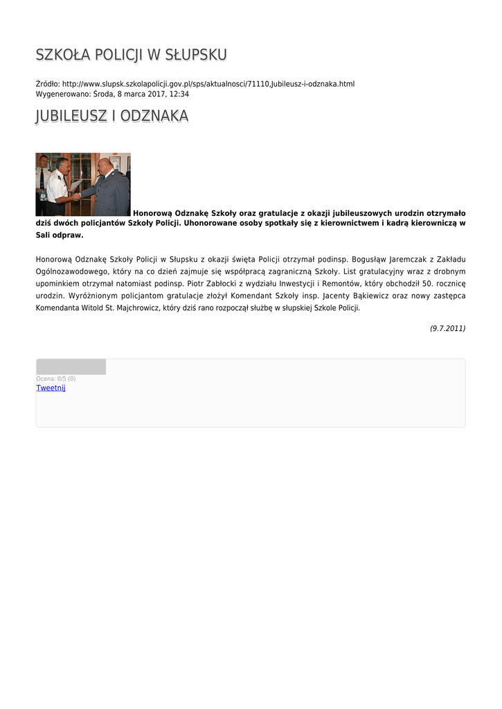 SZKOŁA POLICJI W SŁUPSKU Źródło: http://www.slupsk.szkolapolicji.gov.pl/sps/aktualnosci/71110,Jubileusz-i-odznaka.html Wygenerowano: Środa, 8 marca 2017, 12:34 JUBILEUSZ I ODZNAKA Honorową Odznakę Szkoły oraz gratulacje z okazji jubileuszowych urodzin otzrymało dziś dwóch policjantów Szkoły Policji. Uhonorowane osoby spotkały się z kierownictwem i kadrą kierowniczą w Sali odpraw. Honorową Odznakę Szkoły Policji w Słupsku z okazji święta Policji otrzymał podinsp. Bogusłąw Jaremczak z Zakładu Ogólnozawodowego, który na co dzień zajmuje się współpracą zagraniczną Szkoły. List gratulacyjny wraz z drobnym upominkiem otrzymał natomiast podinsp. Piotr Zabłocki z wydziału Inwestycji i Remontów, który obchodził 50. rocznicę urodzin. Wyróżnionym policjantom gratulacje złożył Komendant Szkoły insp. Jacenty Bąkiewicz oraz nowy zastępca Komendanta Witold St. Majchrowicz, który dziś rano rozpoczął służbę w słupskiej Szkole Policji. (9.7.2011) Ocena: 0/5 (0) Tweetnij
