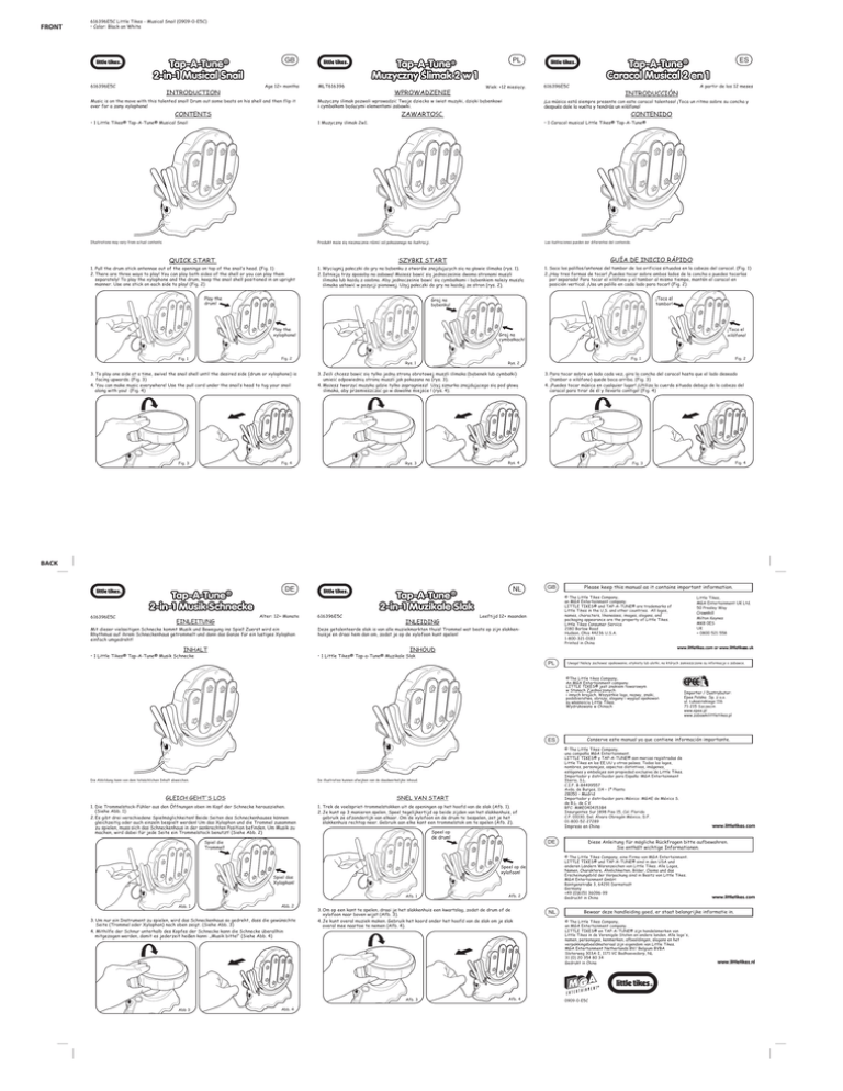 FRONT 616396E5C Little Tikes - Musical Snail (0909-0-E5C) • Color: Black on White Tap-A-Tune® 2-in-1 Musical Snail 616396E5C GB Age 12+ months INTRODUCTION Music is on the move with this talented snail! Drum out some beats on his shell and then flip it over for a zany xylophone! PL Tap-A-Tune ® Muzyczny Ślimak 2 w 1 MLT616396 Wiek: +12 miesięcy. WPROWADZENIE Muzyczny ślimak pozwoli wprowadzić Twoje dziecko w świat muzyki, dzięki bębenkowi i cymbałkom będącymi elementami zabawki. CONTENTS 616396E5C A partir de los 12 meses INTRODUCCIÓN ¡La música está siempre presente con este caracol talentoso! ¡Toca un ritmo sobre su concha y después dale la vuelta y tendrás un xilófono! ZAWARTOŚĆ CONTENIDO • 1 Little Tikes® Tap-A-Tune® Musical Snail 1 Muzyczny ślimak 2w1. • 1 Caracol musical Little Tikes® Tap-A-Tune® Illustrations may vary from actual contents. Produkt może się nieznacznie różnić od pokazanego na ilustracji. Las ilustraciones pueden ser diferentes del contenido. GUÍA DE INICIO RÁPIDO SZYBKI START QUICK START 1. Pull the drum stick antennae out of the openings on top of the snail’s head. (Fig. 1) 2. There are three ways to play! You can play both sides of the shell or you can play them separately! To play the xylophone and the drum, keep the snail shell positioned in an upright manner. Use one stick on each side to play! (Fig. 2) 1. Wyciągnij pałeczki do gry na bębenku z otworów znajdujących się na głowie ślimaka (rys. 1). 2. Istnieją trzy sposoby na zabawę! Możesz bawić się jednocześnie dwoma stronami muszli ślimaka lub każdą z osobna. Aby jednocześnie bawić się cymbałkami i bębenkiem należy muszlę ślimaka ustawić w pozycji pionowej. Użyj pałeczki do gry na każdej ze stron (rys. 2). Play the drum! 1. Saca los palillos/antenas del tambor de los orificios situados en la cabeza del caracol. (Fig. 1) 2. ¡Hay tres formas de tocar! ¡Puedes tocar sobre ambos lados de la concha o puedes tocarlas por separado! Para tocar el xilófono y el tambor al mismo tiempo, mantén el caracol en posición vertical. ¡Usa un palillo en cada lado para tocar! (Fig. 2) ¡Toca el tambor! Graj na bębenku! Play the xylophone! 3. To play one side at a time, swivel the snail shell until the desired side (drum or xylophone) is facing upwards. (Fig. 3) 4. You can make music everywhere! Use the pull cord under the snail’s head to tug your snail along with you! (Fig. 4) Rys. 1 Fig. 1 Rys. 2 3. Jeśli chcesz bawić się tylko jedną stroną obrotowej muszli ślimaka (bębenek lub cymbałki) umieść odpowiednią stronę muszli jak pokazano na (rys. 3). 4. Możesz tworzyć muzykę gdzie tylko zapragniesz! Użyj sznurka znajdującego się pod głową ślimaka, aby przemieszczać go w dowolne miejsce ! (rys. 4). Fig. 4 Fig. 3 ¡Toca el xilófono! Graj na cymbałkach! Fig. 2 Fig. 1 ES Tap-A-Tune ® Caracol Musical 2 en 1 3. Para tocar sobre un lado cada vez, gira la concha del caracol hasta que el lado deseado (tambor o xilófono) quede boca arriba. (Fig. 3) 4. ¡Puedes tocar música en cualquier lugar! ¡Utiliza la cuerda situada debajo de la cabeza del caracol para tirar de él y llevarlo contigo! (Fig. 4) Rys. 4 Rys. 3 Fig. 2 Fig. 4 Fig. 3 BACK Tap-A-Tune 2-in-1 Musik Schnecke ® 616396E5C EINLEITUNG DE Alter: 12+ Monate Mit dieser vielseitigen Schnecke kommt Musik und Bewegung ins Spiel! Zuerst wird ein Rhythmus auf ihrem Schneckenhaus getrommelt und dann das Ganze für ein lustiges Xylophon einfach umgedreht! INHALT NL Tap-A-Tune 2-in-1 Muzikale Slak ® 616396E5C INLEIDING GB © The Little Tikes Company, an MGA Entertainment company. LITTLE TIKES® and TAP-A-TUNE® are trademarks of Little Tikes in the U.S. and other countries. All logos, names, characters, likenesses, images, slogans, and packaging appearance are the property of Little Tikes. Little Tikes Consumer Service 2180 Barlow Road Hudson, Ohio 44236 U.S.A. 1-800-321-0183 Printed in China Leeftijd 12+ maanden Deze getalenteerde slak is van alle muziekmarkten thuis! Trommel wat beats op zijn slakkenhuisje en draai hem dan om, zodat je op de xylofoon kunt spelen! INHOUD • 1 Little Tikes® Tap-A-Tune® Musik Schnecke • 1 Little Tikes® Tap-a-Tune® Muzikale Slak Please keep this manual as it contains important information. PL Little Tikes, MGA Entertainment UK Ltd. 50 Presley Way Crownhill Milton Keynes MK8 0ES UK + 0800 521 558 www.littletikes.com or www.littletikes .co.uk Uwaga! Należy zachować opakowanie, etykiety lub ulotki, na których zamieszczone są informacje o zabawce. ©The Little tikes Company, An MGA Entertainment company. LITTLE TIKES® jest znakiem towarowym w Stanach Zjednoczonych i innych krajach. Wszystkie logo, nazwy, znaki, podobieństwa, obrazy, slogany i wygląd opakowań są własnością Little Tikes. Wydrukowano w Chinach ES Die Abbildung kann von dem tatsächlichen Inhalt abweichen. SNEL VAN START 1. Die Trommelstock-Fühler aus den Öffnungen oben im Kopf der Schnecke herausziehen. (Siehe Abb. 1) 2. Es gibt drei verschiedene Spielmöglichkeiten! Beide Seiten des Schneckenhauses können gleichzeitig oder auch einzeln bespielt werden! Um das Xylophon und die Trommel zusammen zu spielen, muss sich das Schneckenhaus in der senkrechten Position befinden. Um Musik zu machen, wird dabei für jede Seite ein Trommelstock benutzt! (Siehe Abb. 2) 1. Trek de voelspriet-trommelstokken uit de openingen op het hoofd van de slak (Afb. 1). 2. Je kunt op 3 manieren spelen. Speel tegelijkertijd op beide zijden van het slakkenhuis, of gebruik ze afzonderlijk van elkaar. Om de xylofoon en de drum te bespelen, zet je het slakkenhuis rechtop neer. Gebruik aan elke kant een trommelstok om te spelen (Afb. 2). Speel op de drum! Spiel die Trommel! Afb. 1 Abb. 1 Abb. 2 3. Um nur ein Instrument zu spielen, wird das Schneckenhaus so gedreht, dass die gewünschte Seite (Trommel oder Xylophon) nach oben zeigt. (Siehe Abb. 3) 4. Mithilfe der Schnur unterhalb des Kopfes der Schnecke kann di