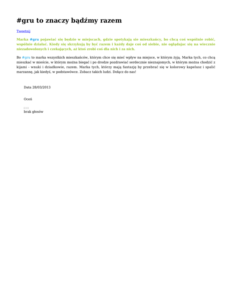 #gru to znaczy bądźmy razem Tweetnij Marka #gru pojawiać się będzie w miejscach, gdzie spotykają sie mieszkańcy, bo chcą coś wspólnie robić, wspólnie działać. Kiedy się skrzykują by być razem i każdy daje coś od siebie, nie oglądajac się na wiecznie niezadowolonych i czekających, aż ktoś zrobi coś dla nich i za nich. Bo #gru to marka wszystkich mieszkańców, którym chce się mieć wpływ na miejsce, w którym żyją. Marka tych, co chcą mieszkać w mieście, w którym można biegać i po drodze pozdrawiać serdecznie nieznajomych, w którym można chodzić z kijami - wnuki i dziadkowie, razem. Marka tych, którzy mają fantazję by przebrać się w kolorowy kapelusz i spalić marzannę, jak kiedyś, w podstawówce. Zobacz takich ludzi. Dołącz do nas! Data 28/03/2013 Oceń brak głosów