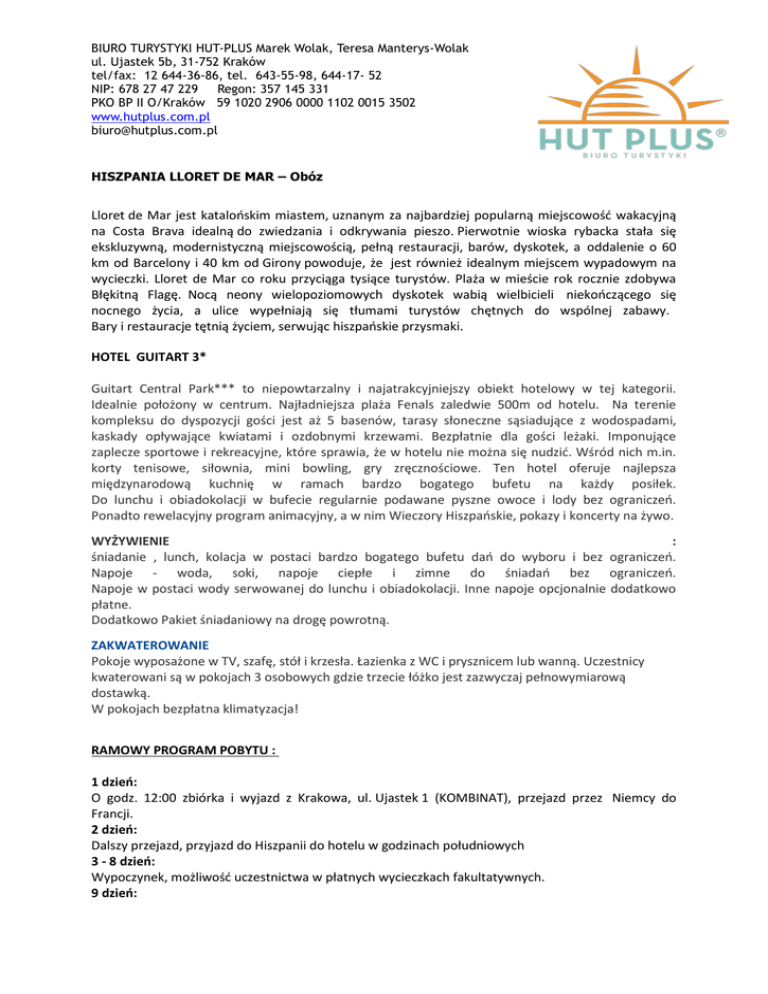 BIURO TURYSTYKI HUT-PLUS Marek Wolak, Teresa Manterys-Wolak ul. Ujastek 5b, 31-752 Kraków tel/fax: 12 644-36-86, tel. 643-55-98, 644-17- 52 NIP: 678 27 47 229 Regon: 357 145 331 PKO BP II O/Kraków 59 1020 2906 0000 1102 0015 3502 www.hutplus.com.pl [email protected] HISZPANIA LLORET DE MAR – Obóz Lloret de Mar jest katalońskim miastem, uznanym za najbardziej popularną miejscowość wakacyjną na Costa Brava idealną do zwiedzania i odkrywania pieszo. Pierwotnie wioska rybacka stała się ekskluzywną, modernistyczną miejscowością, pełną restauracji, barów, dyskotek, a oddalenie o 60 km od Barcelony i 40 km od Girony powoduje, że jest również idealnym miejscem wypadowym na wycieczki. Lloret de Mar co roku przyciąga tysiące turystów. Plaża w mieście rok rocznie zdobywa Błękitną Flagę. Nocą neony wielopoziomowych dyskotek wabią wielbicieli niekończącego się nocnego życia, a ulice wypełniają się tłumami turystów chętnych do wspólnej zabawy. Bary i restauracje tętnią życiem, serwując hiszpańskie przysmaki. HOTEL GUITART 3* Guitart Central Park*** to niepowtarzalny i najatrakcyjniejszy obiekt hotelowy w tej kategorii. Idealnie położony w centrum. Najładniejsza plaża Fenals zaledwie 500m od hotelu. Na terenie kompleksu do dyspozycji gości jest aż 5 basenów, tarasy słoneczne sąsiadujące z wodospadami, kaskady opływające kwiatami i ozdobnymi krzewami. Bezpłatnie dla gości leżaki. Imponujące zaplecze sportowe i rekreacyjne, które sprawia, że w hotelu nie można się nudzić. Wśród nich m.in. korty tenisowe, siłownia, mini bowling, gry zręcznościowe. Ten hotel oferuje najlepsza międzynarodową kuchnię w ramach bardzo bogatego bufetu na każdy posiłek. Do lunchu i obiadokolacji w bufecie regularnie podawane pyszne owoce i lody bez ograniczeń. Ponadto rewelacyjny program animacyjny, a w nim Wieczory Hiszpańskie, pokazy i koncerty na żywo. WYŻYWIENIE : śniadanie , lunch, kolacja w postaci bardzo bogatego bufetu dań do wyboru i bez ograniczeń. Napoje - woda, soki, napoje ciepłe i zimne do śniadań bez ograniczeń. Napoje w postaci wody serwowanej do lunchu i obiadokolacji. Inne napoje opcjonalnie dodatkowo płatne. Dodatkowo Pakiet śniadaniowy na drogę powrotną. ZAKWATEROWANIE Pokoje wyposażone w TV, szafę, stół i krzesła. Łazienka z WC i prysznicem lub wanną. Uczestnicy kwaterowani są w pokojach 3 osobowych gdzie trzecie łóżko jest zazwyczaj pełnowymiarową dostawką. W pokojach bezpłatna klimatyzacja! RAMOWY PROGRAM POBYTU : 1 dzień: O godz. 12:00 zbiórka i wyjazd z Krakowa, ul. Ujastek 1 (KOMBINAT), przejazd przez Niemcy do Francji. 2 dzień: Dalszy przejazd, przyjazd do Hiszpanii do hotelu w godzinach południowych 3 - 8 dzień: Wypoczynek, możliwość uczestnictwa w płatnych wycieczkach fakultatywnych. 9 dzień: BIURO TURYSTYKI HUT-PLUS Marek Wolak, Teresa Manterys-Wolak ul. Ujastek 5b, 31-752 Kraków tel/fax: 12 644-36-86, tel. 643-55-98, 644-17- 52 NIP: 678 27 47 229 Regon: 357 145 331 PKO BP II O/Kraków 59 1020 2906 0000 1102 0015 3502 www.hutplus.com.pl [email protected] Śniadanie, lunch, kolacja, wyjazd do kraju, przejazd przez Francję , Niemcy, 10 dzień: Przyjazd do Polski (do Krakowa) w godzinach wieczornych. CENA ZAWIERA: * 7 noclegów w pokojach z łazienkami i klimatyzacją w hotelu w Hiszpanii * wyżywienie 3 x dziennie bufet * transport komfortowym autokarem * opiekę pilota / rezydenta na miejscu * opiekę kadry , realizację programu, * ubezpieczenie KL + NNW + bagaż * podatek VAT CENA NIE ZAWIERA : * napojów innych niż woda do obiadów i kolacji w hotelu w Hiszpanii * taksa klimatyczna 0,50 e od osoby /dzień /dzieci do 16 lat nie płacą /. * ubezpieczenia od chorób przewlekłych * ubezpieczenia od kosztów rezygnacji z imprezy * dopłaty do połączeń antenowych TERMIN: Wyjazd Pobyt Powrót Cena 06.07.2017 7.07 - 14.07 15.07.2017 1.135 zł + 231 EUR razem ok.2.192 zł il. dni 10 Cena imprezy jest równowartością kwoty podanej w EUR przeliczonej wg kursu sprzedaży pieniadza banku PKO BP obowiązującego w dniu dokonania ostatecznej zapłaty + kwota w zł. Wpłata w PLN lub w EUR. Cena „razem około” jest podana orientacyjnie –przyjęto kurs 1 EUR = 4,50 PLN UWAGA: obowiązkowo ważny paszport lub dowód osobisty. WYCIECZKI FAKULTATYWNE wycieczka do Barcelony 25 e ( dla chętnych dodatkowo płatny wstęp na stadion Camp Nou 26 e) , Monserrat- opactwo benedyktynów z figurą Czarnej Madonny. Jest to najświętsze miejsce w Katalonii 18 e , la masia show ok. 30 e , Wstępy uczestnicy pokrywają we własnym zakresie ok. 35 e,