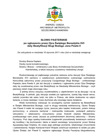 ANDRZEJ DZIĘGA ARCYBISKUP METROPOLITA SZCZECIŃSKO-KAMIEŃSKI SŁOWO PASTERSKIE po ogłoszeniu przez Ojca Świętego Benedykta XVI daty Beatyfikacji Sługi Bożego Jana Pawła II Do odczytania w niedzielę 16 stycznia 2011 roku (lub w niedzielę następną) Drodzy Bracia Kapłani, Osoby życia konsekrowanego, Siostry i Bracia – Umiłowany Ludu Boży Archidiecezji SzczecińskoKamieńskiej, a także wszyscy uczestnicy niedzielnej Liturgii. Rozbrzmiewają od piątkowego południa radosne echa decyzji Ojca Świętego Benedykta XVI zarówno o ostatecznym potwierdzeniu cudownego uzdrowienia francuskiej zakonnicy przez przyczynę Czcigodnego Sługi Bożego - umiłowanego Papieża Jana Pawła II, jak też decyzji o ustaleniu i ogłoszeniu przez Ojca Świętego daty tej oczekiwanej przez nas Beatyfikacji na Niedzielę Miłosierdzia Bożego - czyli pierwszy dzień maja obecnego roku. Z jednej strony wszyscy oczekiwaliśmy z utęsknieniem na tę decyzję i na tę Beatyfikację. A jednak, gdy decyzja została już ogłoszona, żywiej biją nasze serca, radość przenika tak wielu ludzi nie tylko w Polsce, ale także dosłownie na całym świecie, a nowa nadzieja i nowe duchowe siły ożywiają nasze działania. Wiele komentarzy wskazuje na szczególny wymiar wpisania tej Beatyfikacji w Święto Miłosierdzia Bożego, czyli w drugą niedzielę wielkanocną. Ojciec Święty Jan Paweł II wiele lat swojego życia, jeszcze jako kapłan krakowski, potem biskup pomocniczy, a wreszcie kardynał i metropolita krakowski, poświęcił pełnemu odczytaniu i właściwemu zrozumieniu przez Kościół orędzia Miłosierdzia, przekazanego nam przez Jezusa za pośrednictwem skromnej zakonnicy – Siostry Faustyny. Pod Jego opieką krakowskie Łagiewniki pozostawały światowym centrum tej modlitwy i tej duchowości, także w latach swoistego ‘przyciszenia’ przez Stolicę Apostolską tego Orędzia, do czasu jego pełnego poznania, właściwego zrozumienia i zatwierdzenia. Ksiądz Kardynał Karol Wojtyła zwieńczył osobiście to dzieło już jako Ojciec Święty Jan Paweł II, najpierw ogłaszając Siostrę Faustynę błogosławioną, a następnie świętą, zatwierdzając drugą niedzielę wielkanocną jako Święto Miłosierdzia, głosząc osobiście po całym świecie wielkość Bożego Miłosierdzia, a wreszcie dokonując konsekracji nowej bazyliki w krakowskich Łagiewnikach i ogłaszając to Sanktuarium światowym Centrum kultu Bożego Miłosierdzia. Dobrze zresztą pamiętamy, że również Odejście Jana Pawła II do Domu Ojca, decyzją Bożej Opatrzności, nastąpiło w wieczór Wigilii Święta Miłosierdzia. Jego odejście do Domu Ojca miało także dodatkową symbolikę. Był to przecież wieczór pierwszej soboty kwietnia - comiesięcznej maryjnej medytacji i maryjnego zawierzenia, zgodnie z Orędziem Fatimskim. Tajemnica Fatimy wpisała się w wielki Pontyfikat Jana Pawła II poprzez pamiętny zamach na jego życie sprzed trzydziestu lat, z dnia 13 maja - z rocznicy pierwszych objawień Matki Bożej. Sam Ojciec Święty wielokrotnie dawał świadectwo, że kula zamachowca była śmiertelna, a tylko macierzyńska dłoń Maryi poprowadziła ją tak, by Pontyfikat mógł trwać dalej. W ten sposób możliwe stało się m.in. wielkie poświęcenia Rosji i świata, dokonane przez Jana Pawła II w łączności z episkopatami ze wszystkich krajów w roku 1984. Potem zaczęły się wielkie zmiany duchowe, a po nich społeczne i polityczne w całym świecie, głównie z racji na wychodzenie kolejnych narodów z komunistycznego i ateistycznego zniewolenia. W ten sposób możliwy stał się - po nadziei Wielkiej Solidarności w Polsce - początek wielkiego powrotu wielu narodów do ewangelicznej nadziei. Warto zaznaczyć, że w tym roku kalendarzowa rocznica Odejścia Jana Pawła II do Domu Ojca - czyli 2 dzień kwietnia, także przypada w pierwszą sobotę. Powraca więc do nas silnie pełne nadziei dla narodów świata Orędzie Matki Bożej z Fatimy. Mamy też w oczach wiele obrazów i scen z życia Jana Pawła II, w których widzieliśmy Go z różańcem w dłoni, medytującego wielkie tajemnice miłości Boga i zbawienia człowieka, w których szczególny udział ma Najświętsza Maryja Panna. On niezwykle pokochał modlitwę różańcową, z wielokrotnie powtarzanym, pełnym anielskiego zachwytu: Zdrowaś Maryjo, łaski pełna, Pan z Tobą ... To jest przecież tajemnica Zwiastowania i tajemnica przyjęcia przez Maryję Słowa Wcielonego. Nie dziwi więc, że to Jan Paweł II rozwinął modlitwę różańcową dodając do niej Tajemnice Światła. Nie dziwi, że to Jan Paweł II prosił nas wielokrotnie o odmawianie w łączności z Nim i w Jego intencjach modlitwy Anioł Pański. To jest ta sama tajemnica maryjnej duchowości Jana Pawła II. Kilka dni przed swoim Odejściem, w pamiętny Wielki Piątek, związał tę tajemnicę niezwykle silnie z tajemnicą Krzyża. Był to przecież 25 marca 2005 roku. W obecnym roku Zwiastowanie znowu przypada w piątek, tym razem w środku Wielkiego Postu. Podobnie jak On sześć lat temu będziemy adorowali Krzyż, łącząc radość przyjętego przez Maryję Wcielenia z kulminacją dzieła Odkupienia - z Krzyżem, pod którym także stała Maryja - Bolesna Matka. Radość, którą odczuwamy z ogłoszenia daty Beatyfikacji jest w pełni zasadna. Przecież tyle modliliśmy się o ten dar dla nas, dla naszej Ojczyzny i dla całego świata. Jednocześnie, modląc się o Beatyfikację Jana Pawła II, modliliśmy się o naszą dojrzałość i gotowość przyjęcia tego daru. On bowiem musi być przez nas odpowiednio przyjęty. Trzeba tę dojrzałość wiary i gotowość czynu teraz wymodlić sobie, abyśmy także my umieli – chociaż nieporadnie - podejmować dzieła nadziei, prowadzone w świecie przez Jana Pawła II i kontynuowane przez Benedykta XVI. Dzisiejszemu światu, a Polsce w szczególności, potrzeba bowiem nowej nadziei. Potrzeba ludzi sumienia, czyli lu