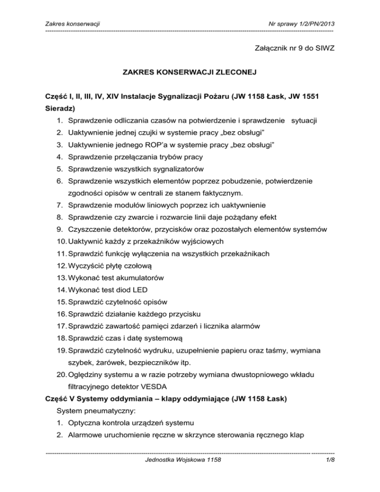 Zakres konserwacji Nr sprawy 1/2/PN/2013 ---------------------------------------------------------------------------------------------------------------------------------------- Załącznik nr 9 do SIWZ ZAKRES KONSERWACJI ZLECONEJ Część I, II, III, IV, XIV Instalacje Sygnalizacji Pożaru (JW 1158 Łask, JW 1551 Sieradz) 1. Sprawdzenie odliczania czasów na potwierdzenie i sprawdzenie sytuacji 2. Uaktywnienie jednej czujki w systemie pracy „bez obsługi” 3. Uaktywnienie jednego ROP’a w systemie pracy „bez obsługi” 4. Sprawdzenie przełączania trybów pracy 5. Sprawdzenie wszystkich sygnalizatorów 6. Sprawdzenie wszystkich elementów poprzez pobudzenie, potwierdzenie zgodności opisów w centrali ze stanem faktycznym. 7. Sprawdzenie modułów liniowych poprzez ich uaktywnienie 8. Sprawdzenie czy zwarcie i rozwarcie linii daje pożądany efekt 9. Czyszczenie detektorów, przycisków oraz pozostałych elementów systemów 10. Uaktywnić każdy z przekaźników wyjściowych 11. Sprawdzić funkcję wyłączenia na wszystkich przekaźnikach 12. Wyczyścić płytę czołową 13. Wykonać test akumulatorów 14. Wykonać test diod LED 15. Sprawdzić czytelność opisów 16. Sprawdzić działanie każdego przycisku 17. Sprawdzić zawartość pamięci zdarzeń i licznika alarmów 18. Sprawdzić czas i datę systemową 19. Sprawdzić czytelność wydruku, uzupełnienie papieru oraz taśmy, wymiana szybek, żarówek, bezpieczników itp. 20. Oględziny systemu a w razie potrzeby wymiana dwustopniowego wkładu filtracyjnego detektor VESDA Część V Systemy oddymiania – klapy oddymiające (JW 1158 Łask) System pneumatyczny: 1. Optyczna kontrola urządzeń systemu 2. Alarmowe uruchomienie ręczne w skrzynce sterowania ręcznego klap ----------------------------------------------------------------------------------------------------------------------------- ----------Jednostka Wojskowa 1158 1/8 Zakres konserwacji Nr sprawy 1/2/PN/2013 ---------------------------------------------------------------------------------------------------------------------------------------- 3. Uruchomienie klap lub okien za pomocą kompresora lub butli 4. Optyczne sprawdzenie klap lub okien po otwarciu 5. Sprawdzenie mocowań i ewentualne przesmarowanie okuć 6. Zamknięcie klap lub okien - ręcznie lub pneumatycznie 7. Sprawdzenie rezerwy nabojów CO2 8. Uzupełnienie rezerwy nabojów (na zlecenie klienta) System elektryczny: 1. Optyczna kontrola urządzeń systemu 2. Sprawdzenie działania centrali sterowniczej 3. Sprawdzenie akumulatorów 4. Ręczne otwarcie klap lub okien przyciskiem wentylacyjnym 5. Alarmowe uruchomienie ręczne w skrzynce sterowania ręcznego klap lub okien 6. Alarmowe uruchomienie automatyczne poprzez czujkę dymową, termiczną lub przycisk ROP albo sygnałem z głównej centrali pożarowej klap lub okien 7. Optyczne sprawdzenie klap lub okien 8. Sprawdzenie mocowań i ewentualne przesmarowanie okuć Część VI Systemy Transmisji Danych - Mikron (JW 1158 Łask) 1. Sprawdzenie przełączania trybów pracy 2. Uaktywnić każdy z przekaźników wyjściowych 3. Sprawdzić czy nadajnik przekazuje informacje (awaria/pożar) do jednostki roboczej zlokalizowanej w straży pożarnej 4. Sprawdzić czytelność i zgodność opisów w systemie 5. Sprawdzić działanie każdego przycisku 6. Sprawdzić zawartość pamięci zdarzeń i licznika alarmów 7. Sprawdzić czas i datę systemową 8. Sprawdzić czy urządzenie będzie pracowało bez zasilania 230V 9. Sprawdzenie stanu akumulatorów Część VII Systemy Transmisji Danych - Polon-Alfa/Agat IT (JW 1158 Łask) 1. sprawdzenie działania przycisków uruchamiających akcję gaśniczą rozmieszczonych na terenie składów MPS – 1 i MPS – 2, elewacji szaf i kaset sterowniczych oraz systemu komputerowego, ----------------------------------------------------------------------------------------------------------------------------- ----------Jednostka Wojskowa 1158 2/8 Zakres konserwacji Nr sprawy 1/2/PN/2013 ---------------------------------------------------------------------------------------------------------------------------------------- 2. sprawdzenie działania przycisków uruchamiających akcję gaśniczą rozmieszczonych na terenie składów MPS – 1 i MPS – 2, 3. sprawdzenie sterowania zasuw odcinających za pomocą przycisków rozmieszczonych na terenie składów MPS – 1 i MPS – 2, z elewacji szaf sterowniczych oraz systemu komputerowego, 4. sprawdzenie poprawności odwzorowywania sygnałów obiektowych w systemie komputerowym oraz łączność systemu „eStrażak” z systemem SAP. 5. Uruchomienie Ręcznych Ostrzegaczy Pożarowych poprzez podniesienie szybki i wciśnięcie przycisku oraz weryfikacji, czy zdarzenie to zostało prawidłowo odnotowane w centrali pożarowej. 6. Wyzwolenie alarmu pożarowego i sprawdzenie poprawności działania sygnalizatorów optycznych i akustycznych wchodzących w skład systemu transmisji pożaru. Część VIII Systemy Gaszenia Gazem (JW 1158 Łask) 1. Sprawdzenie, ewentualne regulacje położenia dysz w odpowiednich przestrzeniach 2. Sprawdzenie stanu rurek instalacji gaszenia 3. Test wskaźników automatycznego gaszenia START, STOP 4. Sprawdzenie poprawności przesłania sygnału elektrycznego podanego przez centrale pożarowe do elektrozaworów przy butlach, (symulacja akcji gaszeniowej) Część IX, X, XI Wodno-pianowe instalacje gaszenia (JW 1158 Łask) Kontrole powinien przeprowadzać wysoce wyspecjalizowany pracownik z profesjonalnej firmy Wykonawczej. Pracownik ten, po każdej kontroli, powinien dostarczyć użytkownikowi instalacji szczegółowy i podpisany protokół kontroli, a także powiadomić go o przeprowadzeniu koniecznych prac korygujących. Poza tym osoba ta powinna opisać wszystkie zewnętrzne warunki, które mogły by ewentualnie wpływać na otrzymane wyniki. W instalacjach przeciwpożarowych z domieszaniem środka pianotwórczego jakość środka powinien kontrolować p