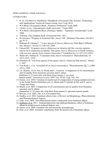 Olejki sandałowe i olejek amyrisowy LITERATURA 1. K. H. Can Baser G. Buchbauer “Handbook of Essential Oils: Science, Technology, and Applications” Taylor & Francis Group, New York 2014 2. W.S.Brud, I.Konopacka-Brud „ Podstawy Perfumerii” Łódź 2009 3. J.Góra, A.Lis, „Najcenniejsze olejki eteryczne”, Toruń 2005 4. W.S.Brud. I.Konopacka-Brud „Pachnąca Apteka – Tajemnice Aromaterapii” Łódź 2008 5. N.Board „The complete book of Essential Oils” 2011 6. B.Lawrence “Progress in Essential Oils. Amyris Oil”, Perfumer Flavourist, Oct.2011 pp.74-75 7. Rebman JP, Chiang F. “A new species of Amyris (Rutaceae) from Baja California Sur, Mexico”. Novon 15. 350-353, 2005 8. Gereau RE. “El genero Amyris (Rutaceae) en America del Sur, con dos especies nuevas de la Amazonia occidental. (The genus Amyris (Rutaceae) in South America, with two new species from western Amazonia.)” Candollea 46. (1): 227-235 (1991) 9. Burke BA, Parkins H. “Coumarins from Amyris balsamifera” Phytochemistry 18. 1073-1075., 1979 10. Hamilton W. “On some species of the genus Amyris, which are little known” Pharm. J. 1847 11. Van Beek t., et al. “Essential oil of Amyris balsamifera” Phytochemistry 28, 7, (19091911), 1989. 12. J.E. Brand1, J.E.D. Fox, G. Pronk and C. Cornwel, “Comparison of oil concentration and oil quality from Santalum spicatum and S. album lantations, 8–25 years old, with those from mature S. spicatum natural stands” Australian Forestry 2007 Vol. 70 No. 4 pp. 235–241 13. Doran, et al. 2010. Variation in heartwood oil composition of young sandalwood trees in the South Pacific (Santalum yasi, S. album and F1 hybrids in Fiji, and S. yasi in Tonga and Niue). 14. Brand, et al. 2007. Comparison of oil concentration and oil quality from Santalum spicatum and S. album plantations, 8–25 years old, with those from mature S. spicatum natural stands. 15. Bowles, et al. 2003. The A-Z of Essential Oils. 16. Sindhu, et al. 2010. Santalum album Linn: A Review on Morphology, Phytochemistry and Pharmacological Aspects. 17. Ochi, et al. 2005. Anti-Helicobacter pylori compounds from Santalum album. 18. Kulkarni, et al. 2011. Antihyperglycemic and antihyperlipidemic effect of Santalum album in streptozotocin induced diabetic rats. 19. Setzer, et al. 2009. Essential oils and anxiolytic aromatherapy. 20. Kim, et al. 2005. Aromatic constituents from the heartwood of Santalum album.